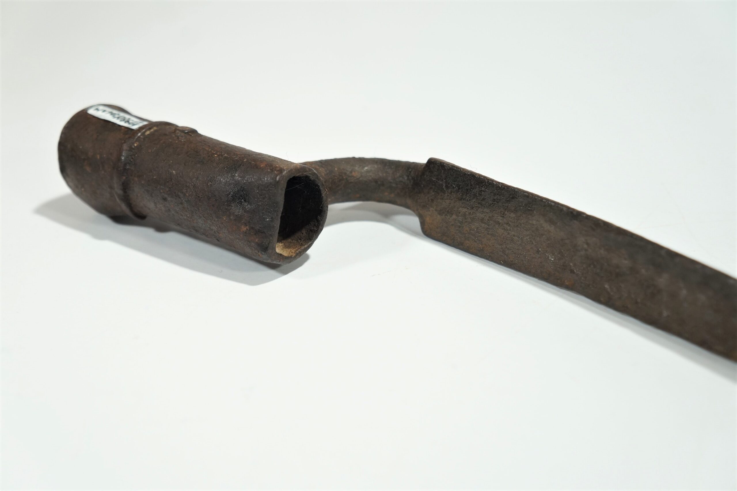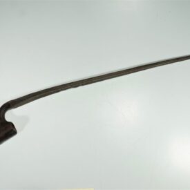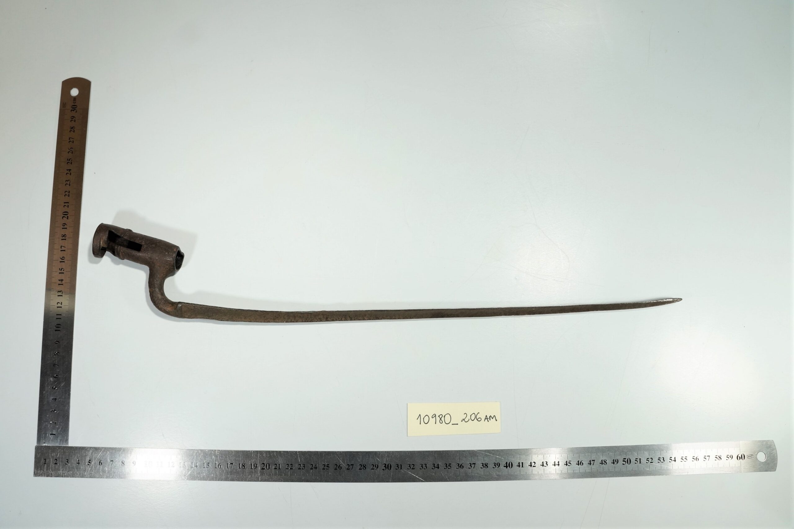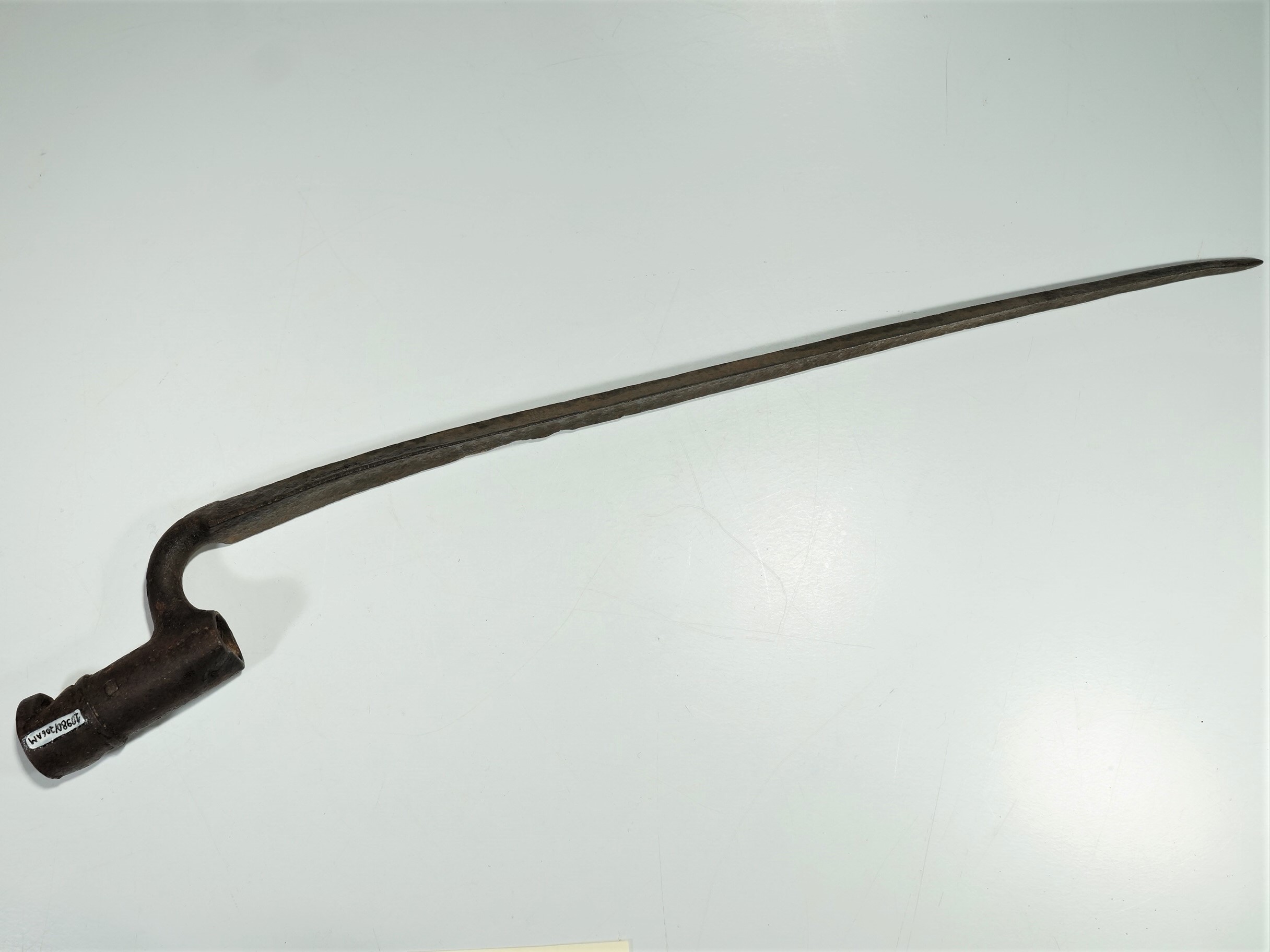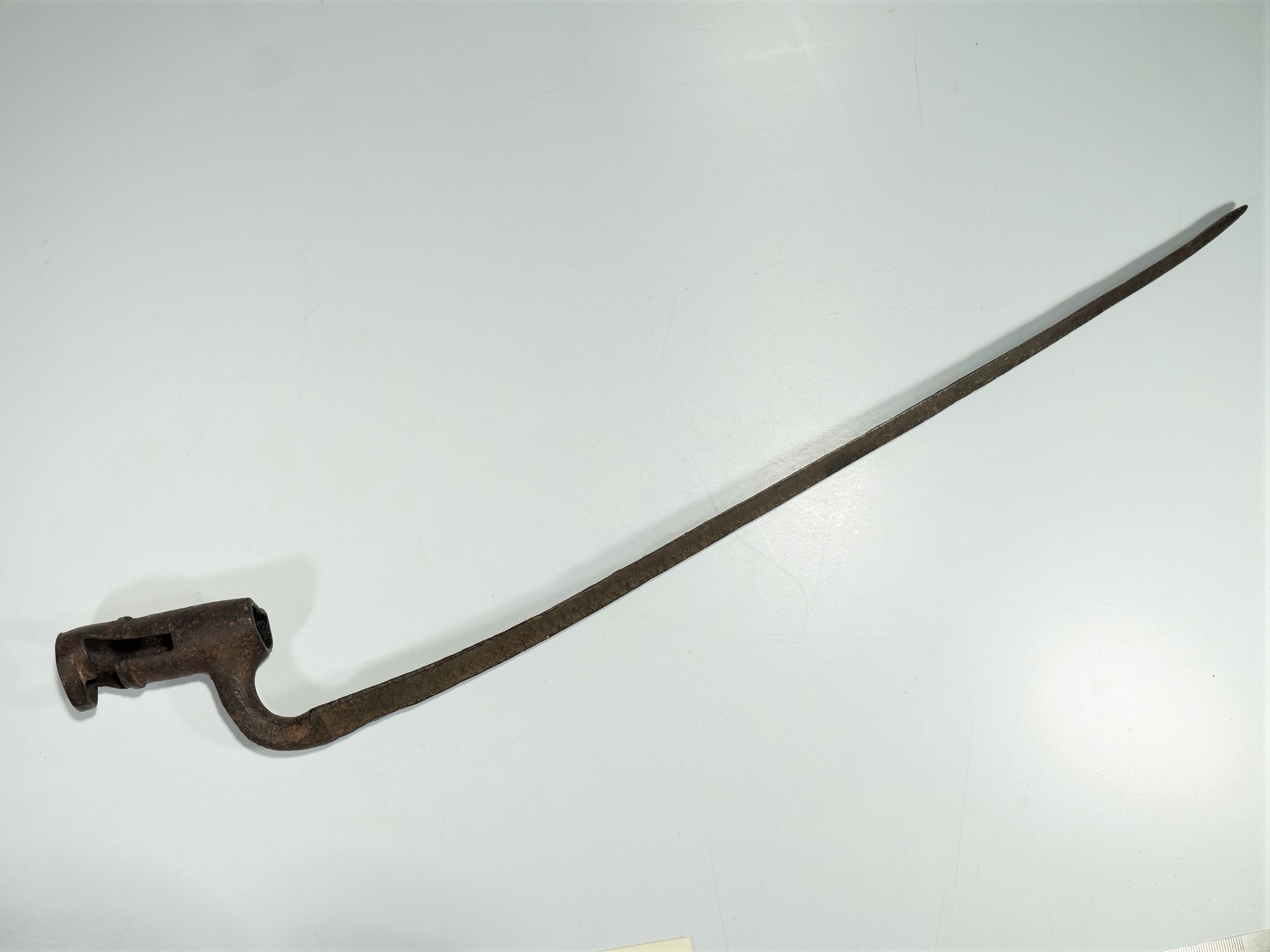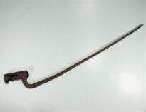 Baioneta com lâmina longa, estreita e metálica, projetada para ser acoplada à extremidade de um fuzil. A base da lâmina possui um mecanismo de encaixe.