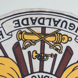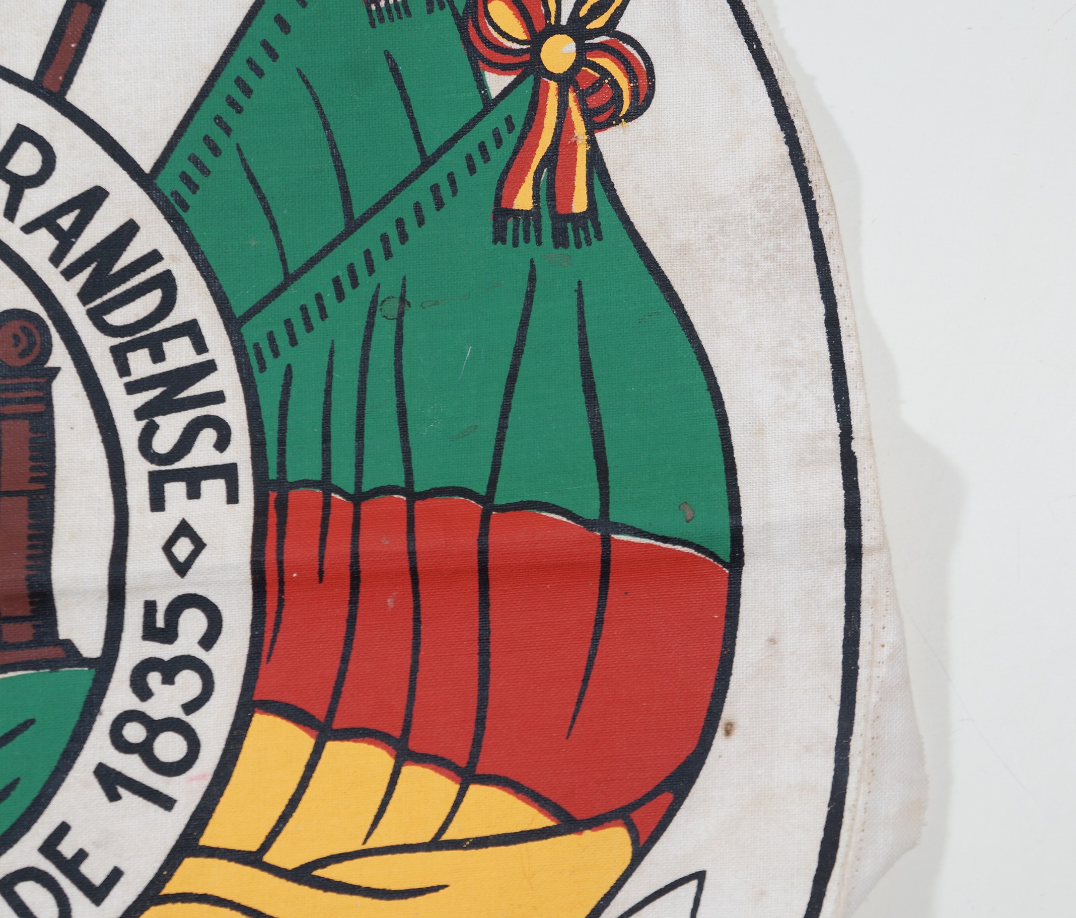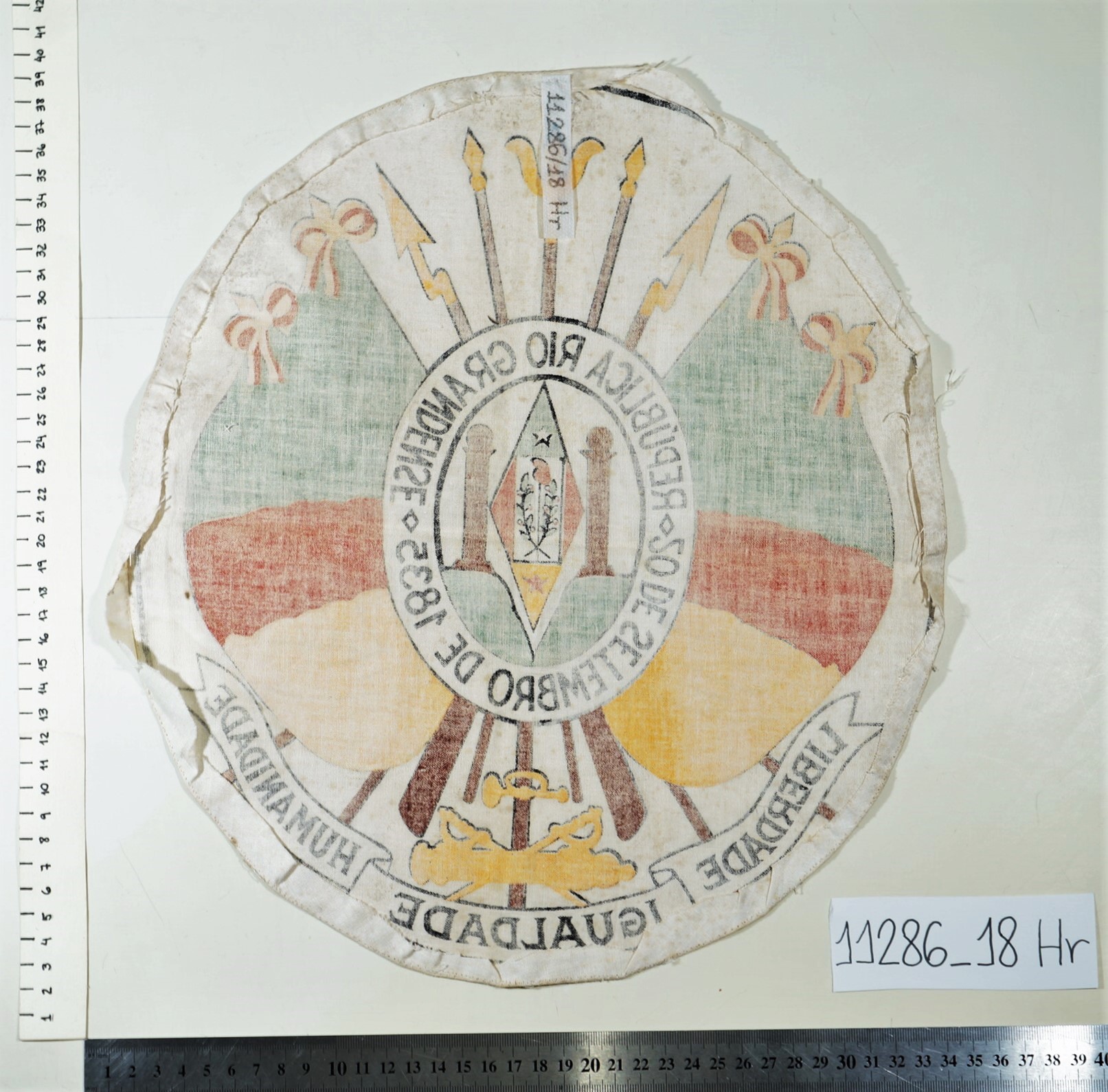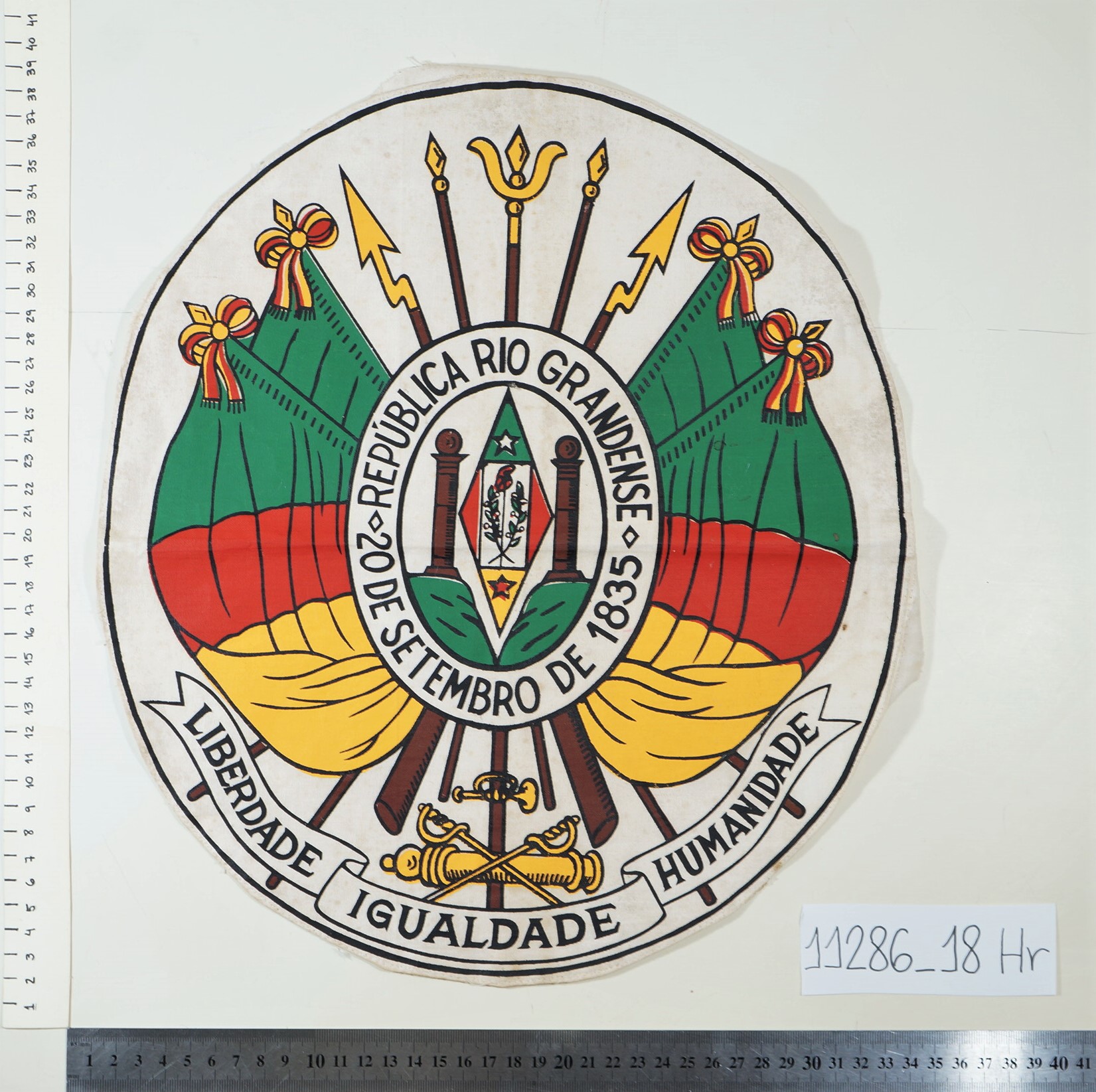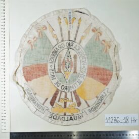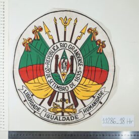 Brasão do Rio Grande do Sul Voltar Anexos DSC02232 DSC02239 DSC02241 DSC02247 Metadados Miniatura Compartilhe Número tombo11286Número de catálogo18ColeçãoHeráldicaTítuloBrasão do Rio Grande do SulDescriçãoBrasão do Estado do Rio Grande do Sul estampado sobre tecido branco. As bordas do tecido possuem costura de arremate. Possui manchas.MaterialidadetecidoDimensãoAltura 36,7 cm; largura 32,9 cmEstado de conservaçãoBomCondição de reproduçãoAcervo protegido pela Lei 9.610/98. Proibida a reprodução para fins comerciais sem a autorização dos detentores legais do direito. Obrigatória a citação da referência para fins acadêmicos e expositivos. Continuar navegando Brasão do Rio Grande do Sul Brasão do Rio Grande do Sul Voltar para a lista de itens