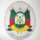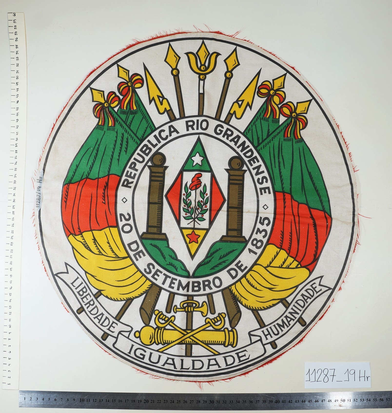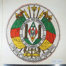Brasão do Estado do Rio Grande do Sul estampado, frente e verso, sobre tecido branco. As bordas do tecido possuem costura de arremate, porém, das bordas arrematadas saem fios vermelhos desfiados. Possui manchas.
