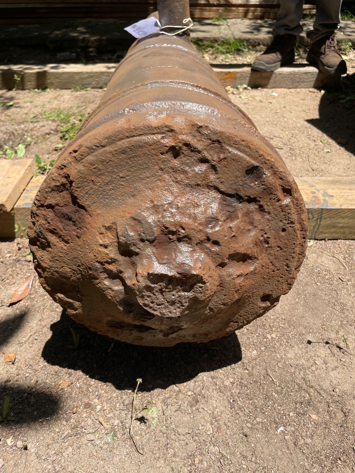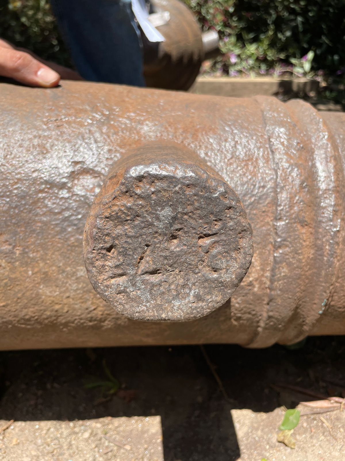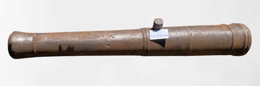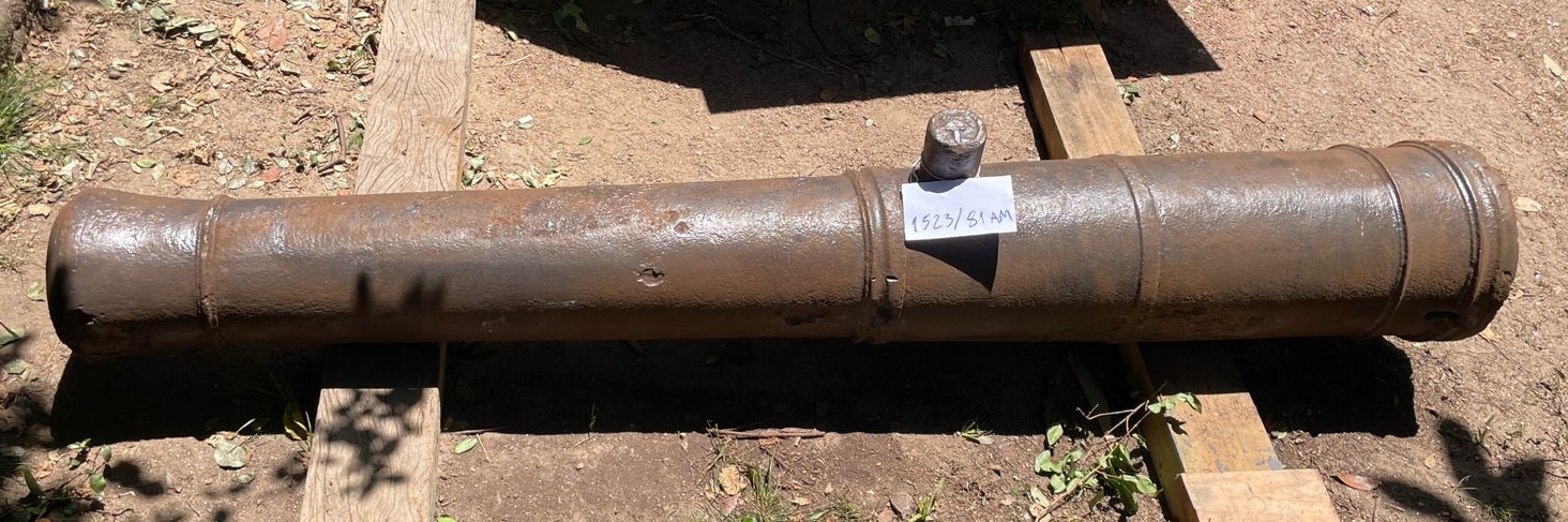 Canhão, em estilo de colubrina. Peça de alma lisa e de boca com diâmetro mais fino do que o resto da peça. O anel-da-boca, em forma de cone truncado, possui a parte posterior mais estreita do que a anterior. A peça em sua totalidade (com excessão do anel-de-boca) possui a forma de cone truncado, tendo como base a culatra. A bolada é lisa e o primeiro reforço é formado por um pequeno anel. A faixa-de-culatra é marcada por dois anéis estreitos. Seccionando o anel posterior há o ouvido da peça. A culatra simples, em forma de cone baixo e sinuoso, possui um corte vertical enferrujado.