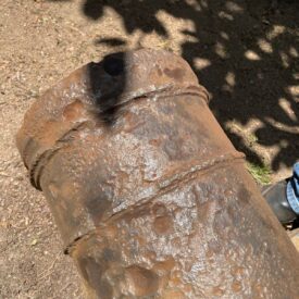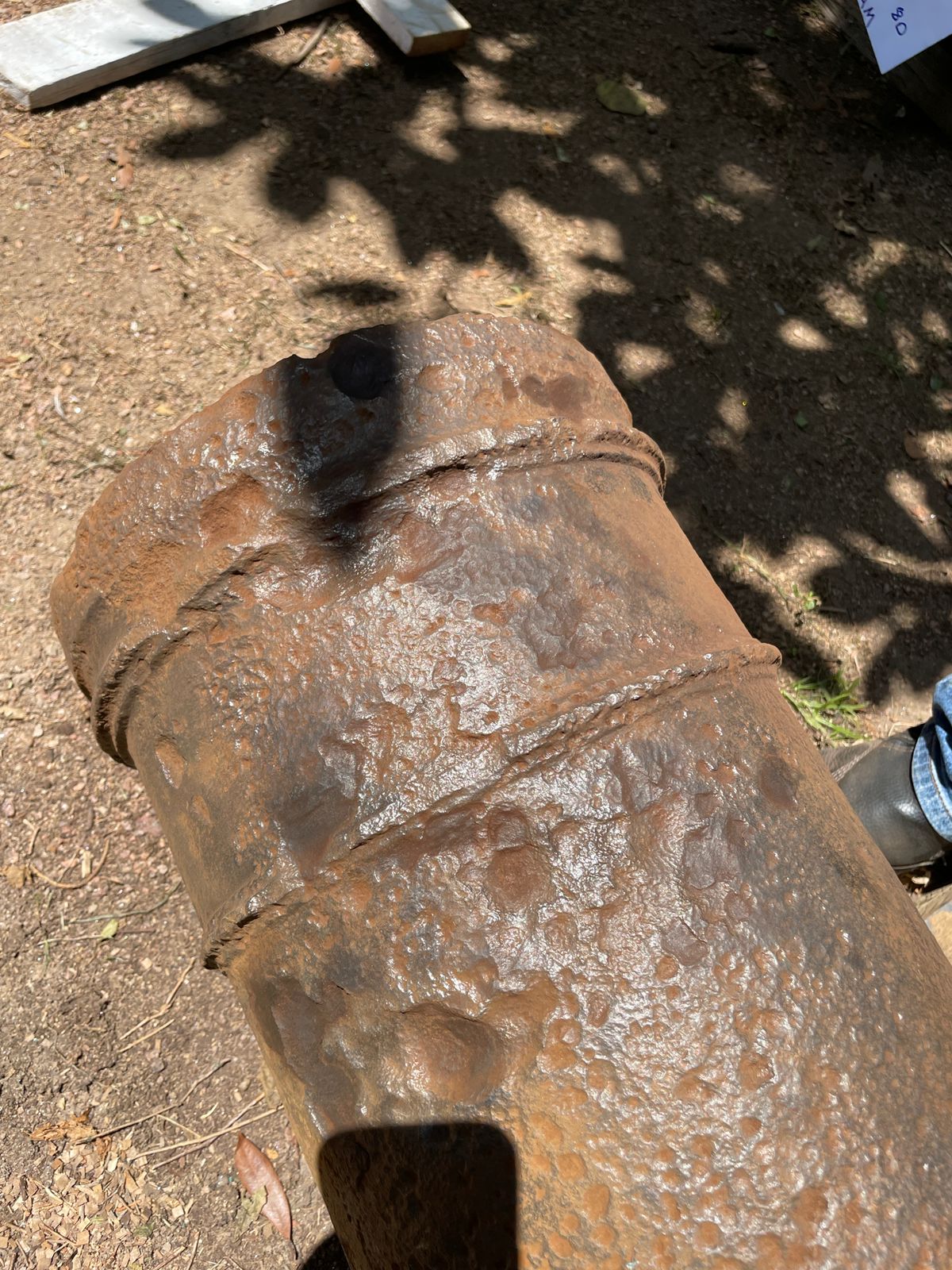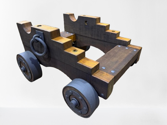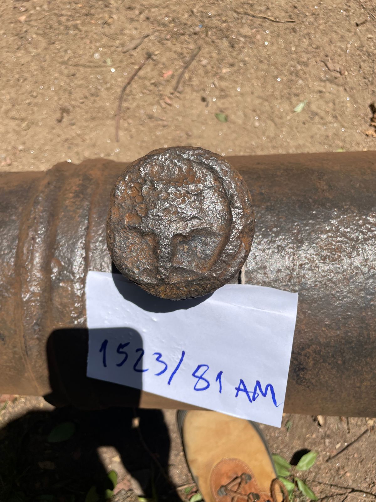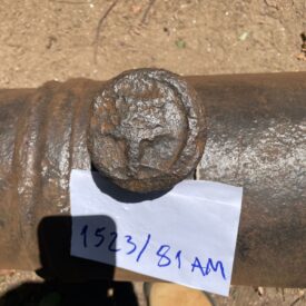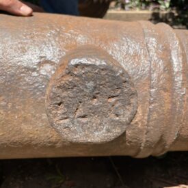 Canhão, em estilo de colubrina. Peça de alma lisa e de boca com diâmetro mais fino do que o resto da peça. O anel-da-boca, em forma de cone truncado, possui a parte posterior mais estreita do que a anterior. A peça em sua totalidade (com excessão do anel-de-boca) possui a forma de cone truncado, tendo como base a culatra. A bolada é lisa e o primeiro reforço é formado por um pequeno anel. A faixa-de-culatra é marcada por dois anéis estreitos. Seccionando o anel posterior há o ouvido da peça. A culatra simples, em forma de cone baixo e sinuoso, possui um corte vertical enferrujado.