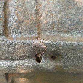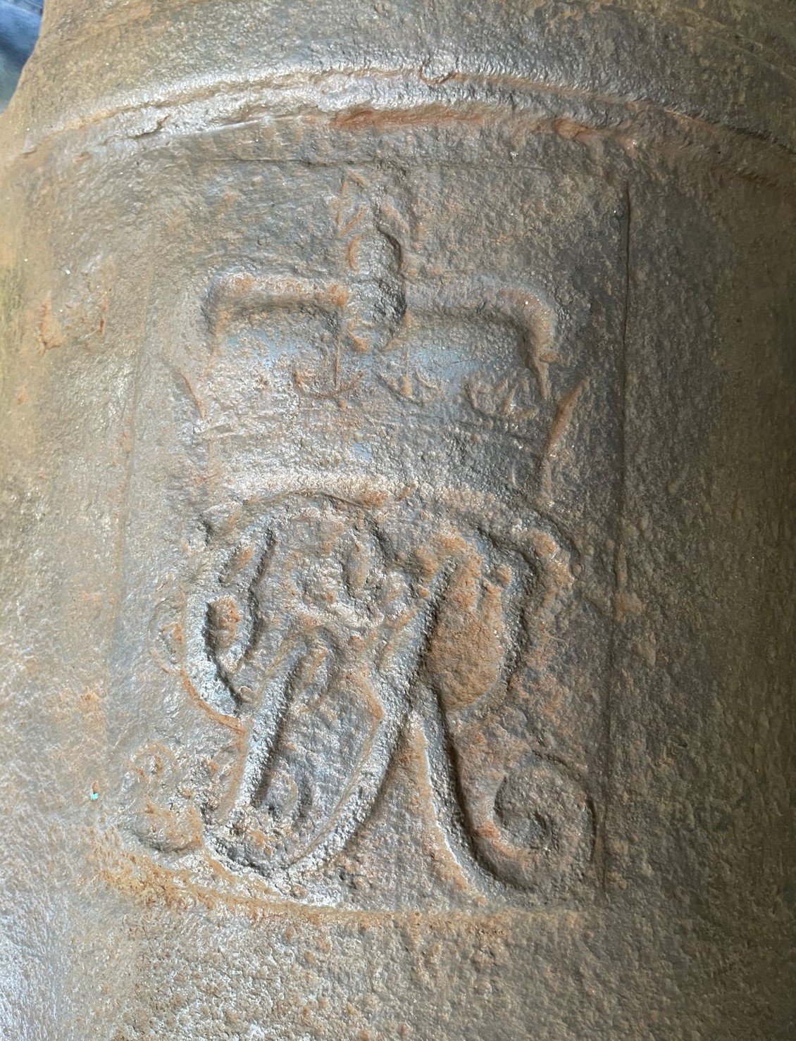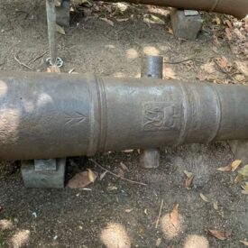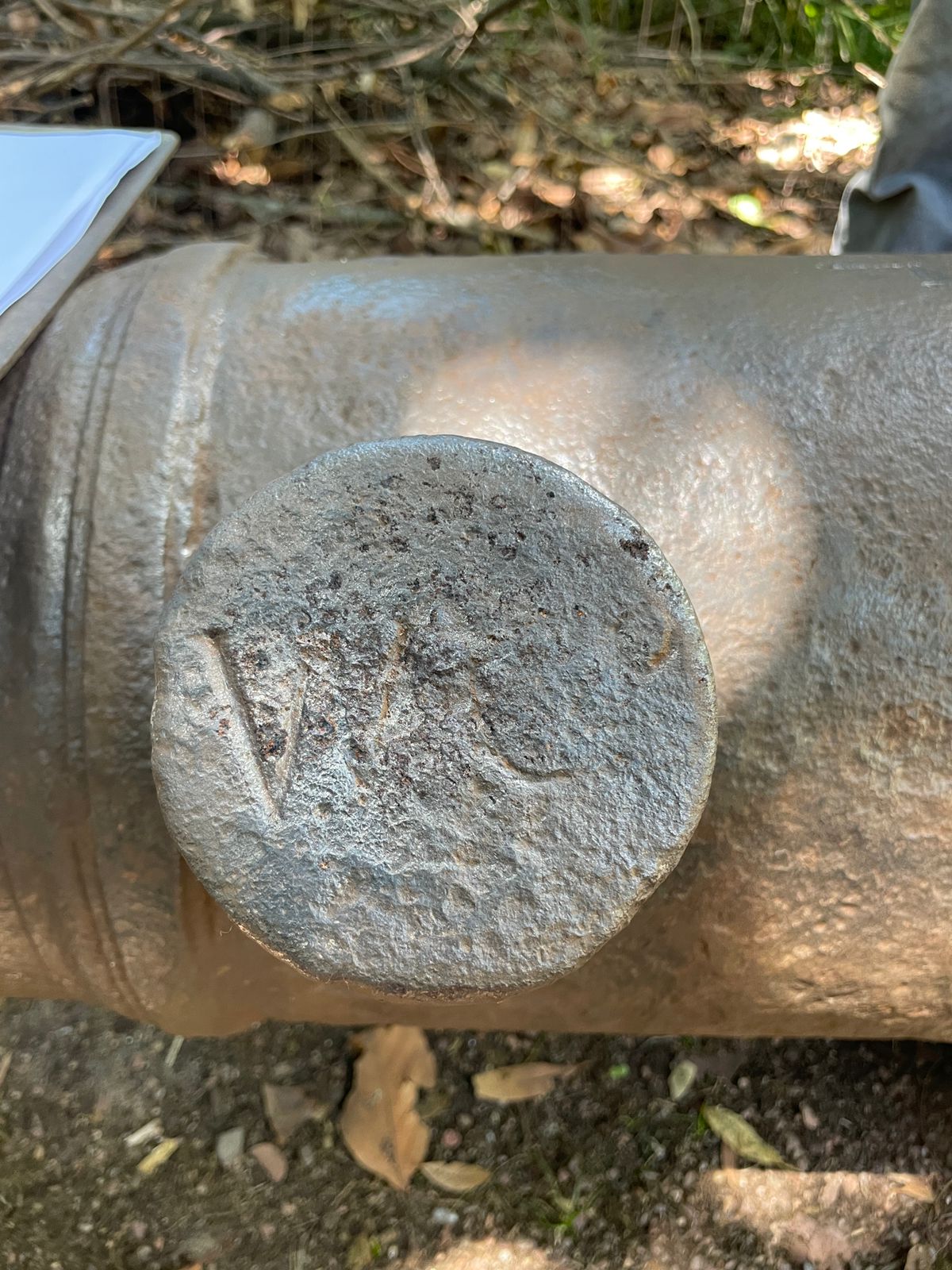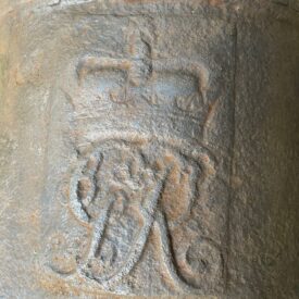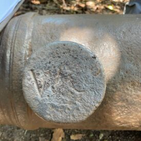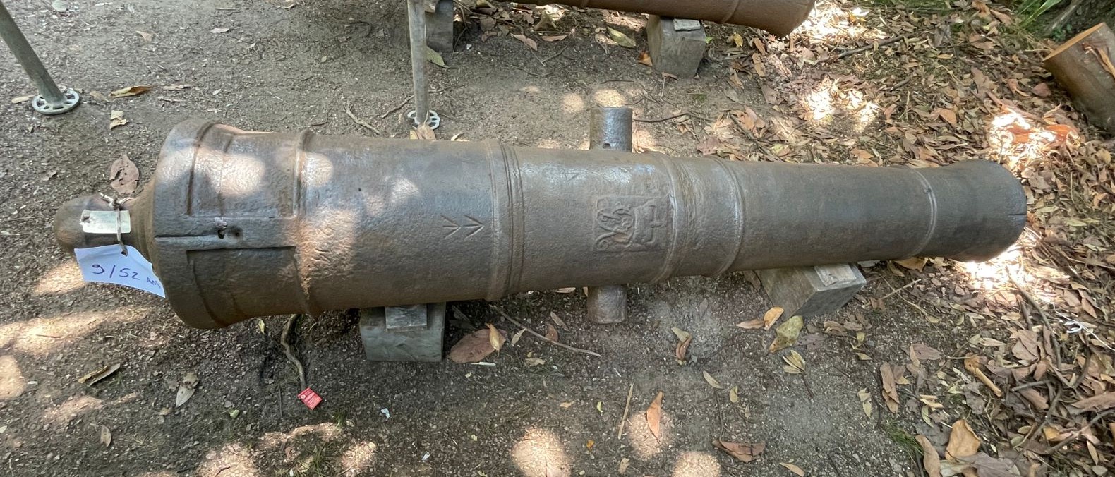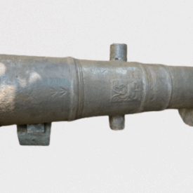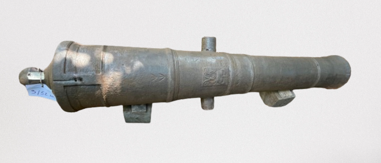 Canhão de ferro fundido, de alma lisa, de carregamento antecarga (pela boca). Fabricação inglesa, monograma do Rei George III incrustado na superfície externa do cano. Duas pequenas inscrições em forma de cunha (flechas de mira) e os dígitos 23-2-14, que remetem ao antigo sistema português de pesagem de canhões baseado em quintal, arroba e arratel.