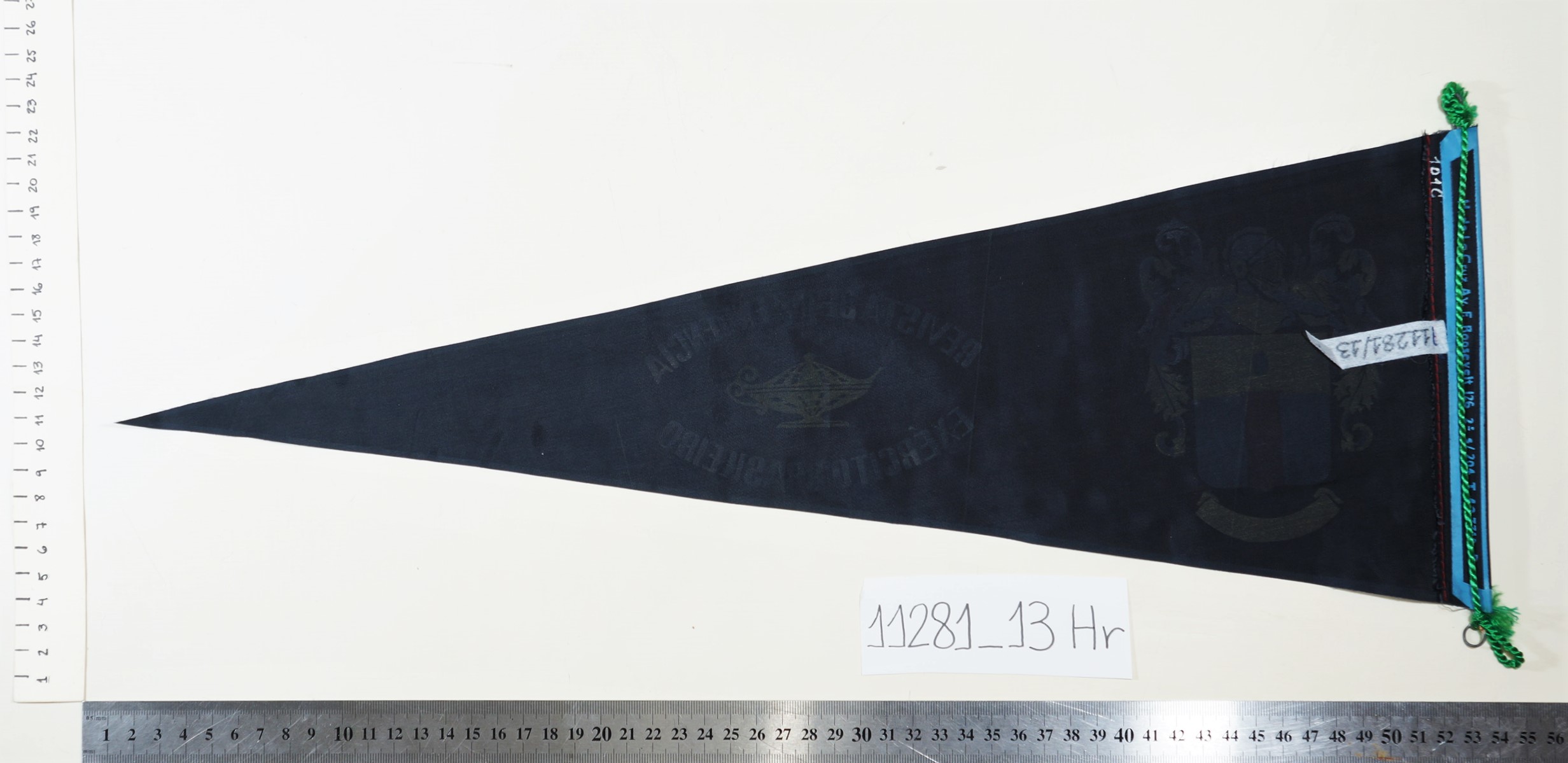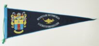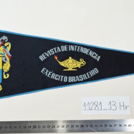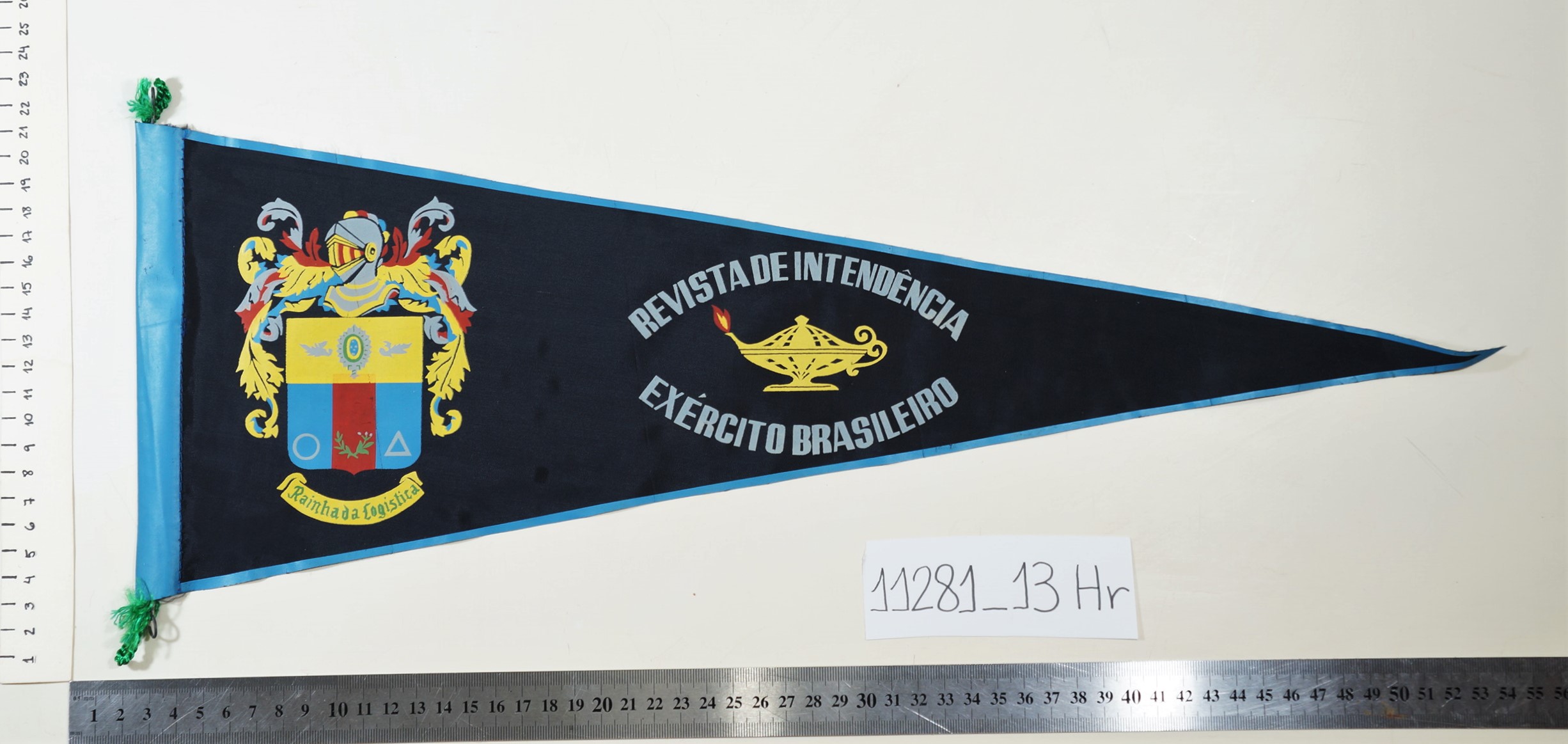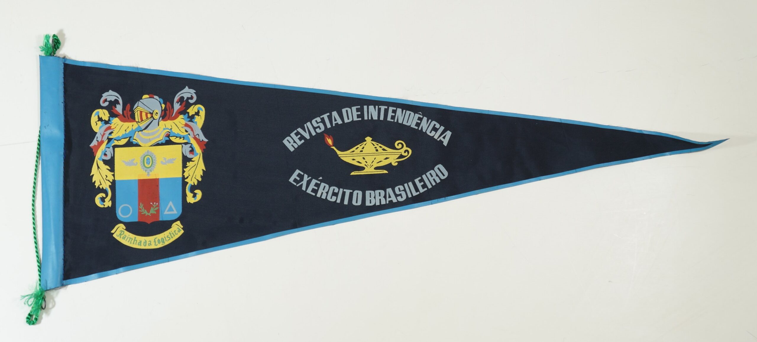 Flâmula de cor preta com bordas na cor azul, com um brasão escrito ”Rainha da Logística”, no canto esquerdo, e “Revista de Intendência do Exército Brasileiro” com o desenho de uma chaleira na cor amarela, no centro. Na borda esquerda, há um metal amarrado a uma corda de cor verde, permitindo que a flâmula seja pendurada.