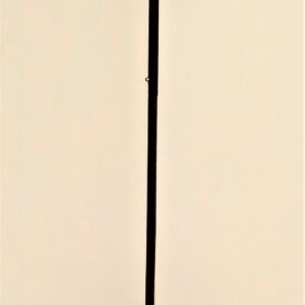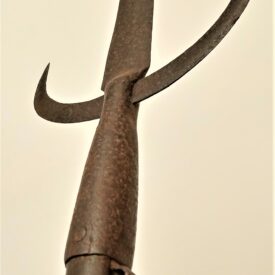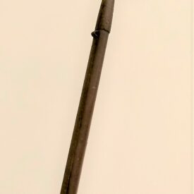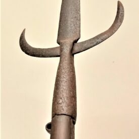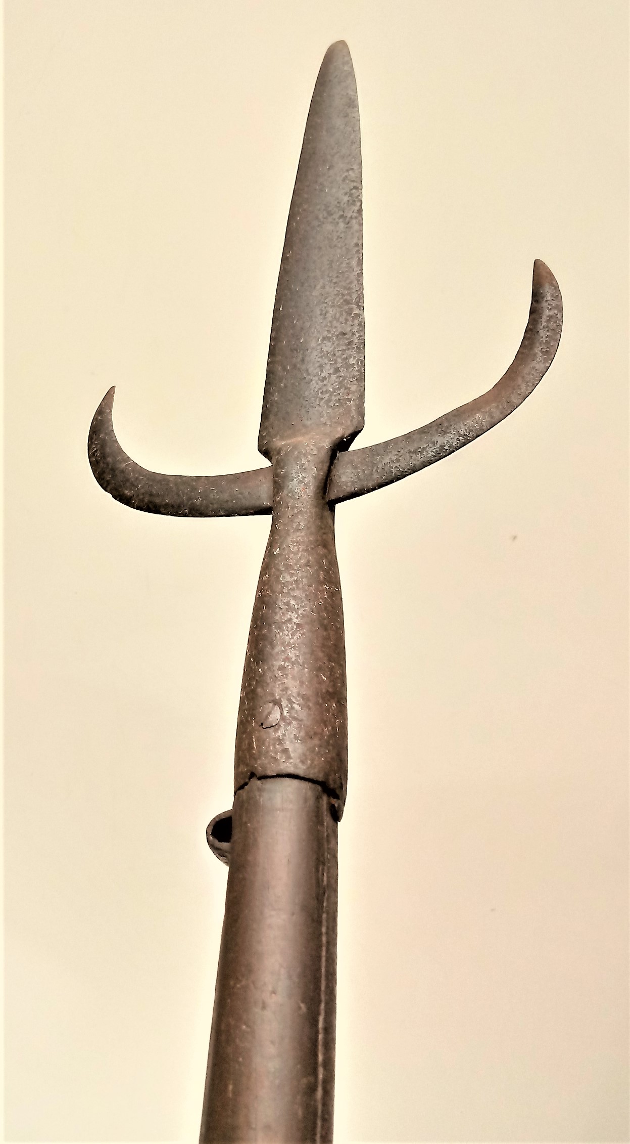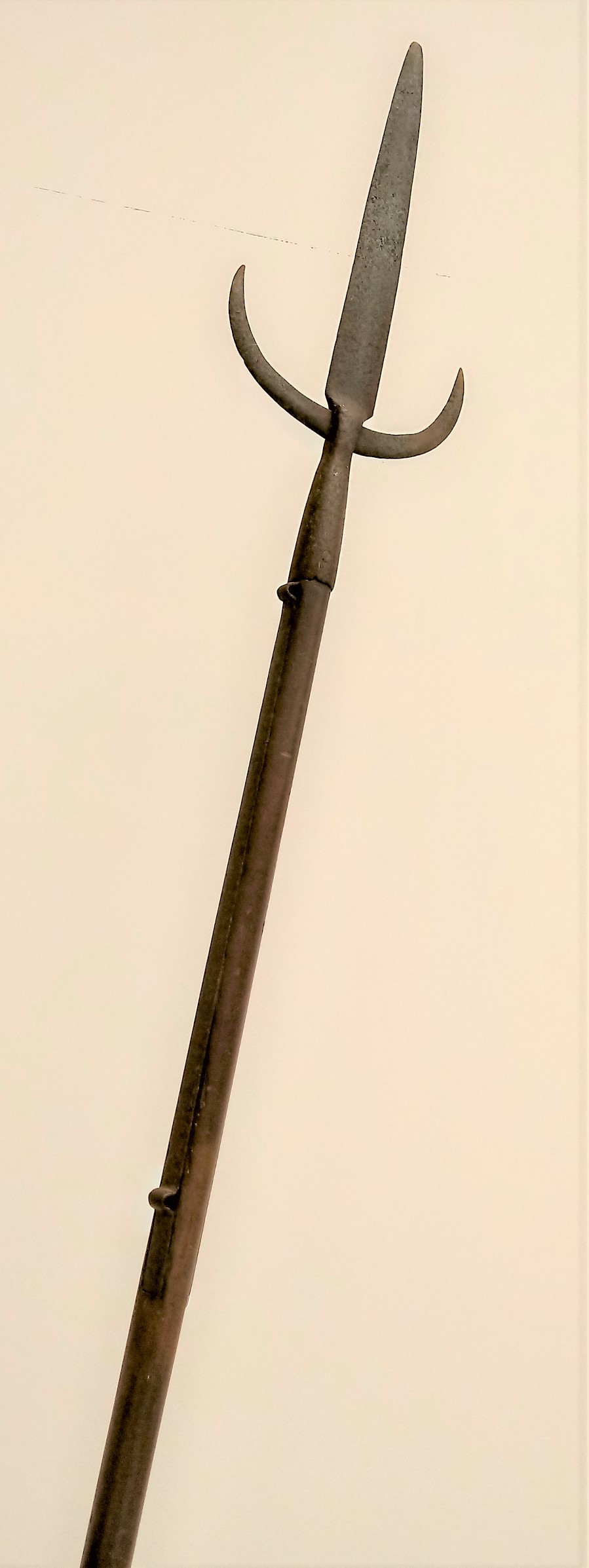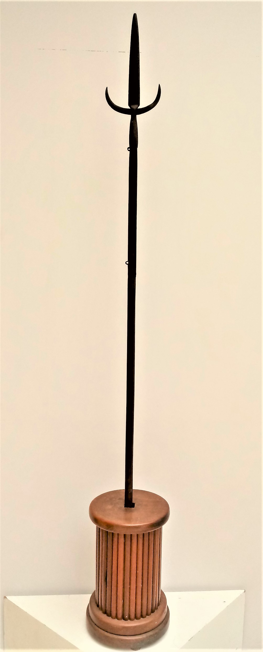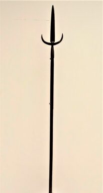 Lança com a choupa em forma de ponta de flecha com uma meia lua na extremidade. A parte que engata na haste é circular e junto a esta descem dois filetes de ferro com 44cm de comprimento, um dos filetes possui duas saliências, uma em cada extremidade do mesmo.