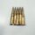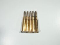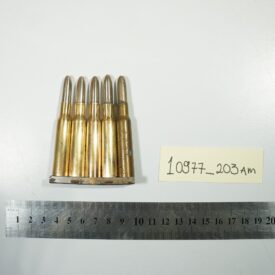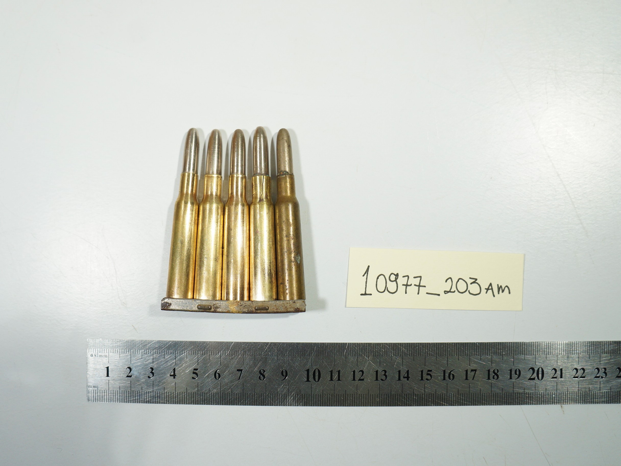 Conjunto composto por cinco cartuchos de fuzil organizados em um clipe de carregamento. Os estojos dos cartuchos são feitos de latão, com coloração dourada envelhecida, e os projéteis são metálicos e pontiagudos. O clipe é metálico, com sinais de oxidação e desgaste.
