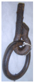 Argola da espia composta por peça metálica com sinais de oxidação, formada por aro circular robusto ligado a segmento alongado que apresenta curvatura e termina em extremidade estreita. A configuração indica função estrutural para fixação de cabos ou correntes, utilizada em manobras de amarração ou atracação de embarcações como também para cabos fixados ao alto dos mastros, presos e firmados ao solo, com a função de manter os mastros em equilíbrio.