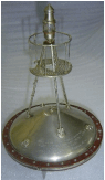 Miniatura de boia para águas rasas, modelo argentino com base circular de metal contendo duas pequenas alças na borda e duas ordens de pinos, uma com dezesseis e outra com oito, dispostas no centro; corpo bicônico em metal com friso de madeira; na parte inferior localizam-se um leme e uma alça; na parte superior encontram-se três alças e, no centro, uma peça metálica com três braços; nessa área estão fixadas três hastes que sustentam a parte superior da boia composta por um círculo de metal perfurado rodeado por pequena grade e uma lanterna de formato aproximadamente cônico terminando em ponta, construída em metal com peça cilíndrica de vidro protegida por fios metálicos; inscrições MODEL OF ARGENTINE SHALLOW WATER BUOY - THE PATENT LIGHTING COMPANY, LIMITED, LONDON - RIVER PLATE ARGENT - JUAN P. BREDINS - BUENOS AIRES e AO SENHOR PRESIDENTE DO ESTADO DO RIO GRANDE DO SUL - DR. BORGES DE MEDEIROS, 1918.