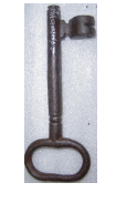 Chave de ferro, com cabeça elipsoide. Apresenta haste de seção circular, com entalhe formado por dois anéis próximos à cabeça. A extremidade inferior possui placa semicircular com fenda na lateral direita.