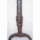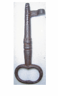 Chave de ferro com cabeça elipsoide, haste de seção circular que afina gradualmente até a ponta, entalhe composto por quatro anéis próximos à cabeça e extremidade formada por uma placa retangular seguida de um semicírculo.
