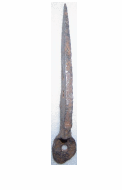 Prego grande e robusto, com haste alongada e ponta afilada; cabeça larga, achatada e irregular, com um furo central; haste comprida, com seção levemente quadrada ou retangular, apresenta marcas de forjamento; tom escuro, acastanhado, com superfície rugosa e irregular devido à oxidação.