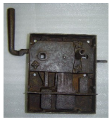 Fechadura retangular, com ornamento losangular sobreposto a outro retângulo. Na face anterior, há quatro orifícios circulares (provavelmente para fixação por parafusos), um orifício quadrangular e outro destinado à introdução da chave. Na face inferior, encontra-se uma placa em forma de “S”. Na face superior, um puxador com extremidade octogonal.