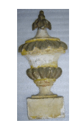 Ornato em forma de urna, com decoração em relevo esculpida à mão. Da pintura original, em técnica “décapée”, restam vestígios da primeira camada de tinta branca, sobre a qual há tinta marrom-escuro aplicada sobre a decoração em relevo, além de traços de dourado.