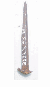 Prego de ferro com formato de pirâmide alongada e quatro vértices simétricos. Apresenta cabeçote irregular, de formato retangular, com um dos ângulos rompido na parte superior. O corpo apresenta sinuosidades e marcas com cavidades nos vértices, próximas à ponta, que se encontra rombuda e enferrujada.