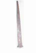 Prego de ferro com formato de pirâmide alongada e quatro vértices simétricos. Apresenta pequeno cabeçote rebatido e irregular, de formato retangular, recoberto por restos de tinta azulada ou acinzentada. O corpo apresenta sinuosidades, ponta rombuda e porosidade decorrente da ferrugem.
