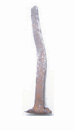 Prego de ferro em forma de pirâmide alongada, com quatro faces simétricas. Apresenta cabeçote rebatido, de formato irregular (quadrangular). O corpo apresenta sinuosidades e torções irregulares. A peça está quebrada.