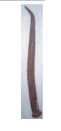Prego de ferro em formato de pirâmide alongada com quatro faces simétricas. Apresenta cabeçote rebatido, de formato quadrangular. A peça está torcida para um lado até a extremidade, que se encontra repuxada para trás, conferindo ao prego aparência semelhante à letra “J”. Apresenta-se bastante oxidado.