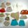 Conjunto de roupas de boneca bebê composta por: três calcinhas/calçolas, uma amarela, uma azul com flores e outra bege; uma calça com listas pretas e listas com detalhes brancos e beges; uma camiseta branca/bege de manga longa com renda no punho; um vestido azul com gola e detalhe do braço na cor verde; um vestido branco com bolinhas azuis e detalhe vermelho na barra e no peito; um vestido vermelho com bolsos e gola xadrez, vermelho e branco; um casaco branco/bege com bolinhas azuis, verdes e vermelhas.