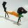 Gato de metal revestido de feltro. Corpo na cor preta, lenço amarelo no pescoço. Por ser feito no metal, é bastante fino. Uma das patas está coberta por um feltro bege.