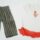Conjunto de qautro peças para cama de bonecas, composto por um colchão e um travesseiro com a mesma estampa em um dos lados; e duas mantas, uma delas rosa-claro e a outra azul e cinza com bordas em amarelo-queimado.