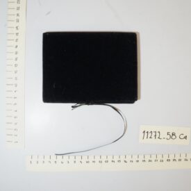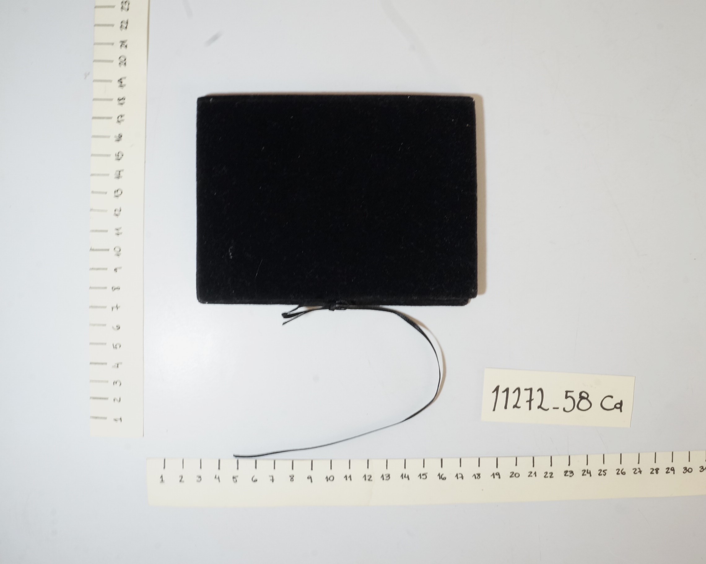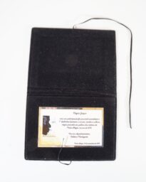 Acompanha capa revestida com tecido aveludado preto, que se dobra ao meio, podendo ser aberta e fechada, com fita preta para amarrar.