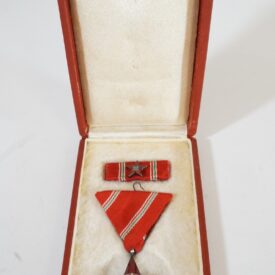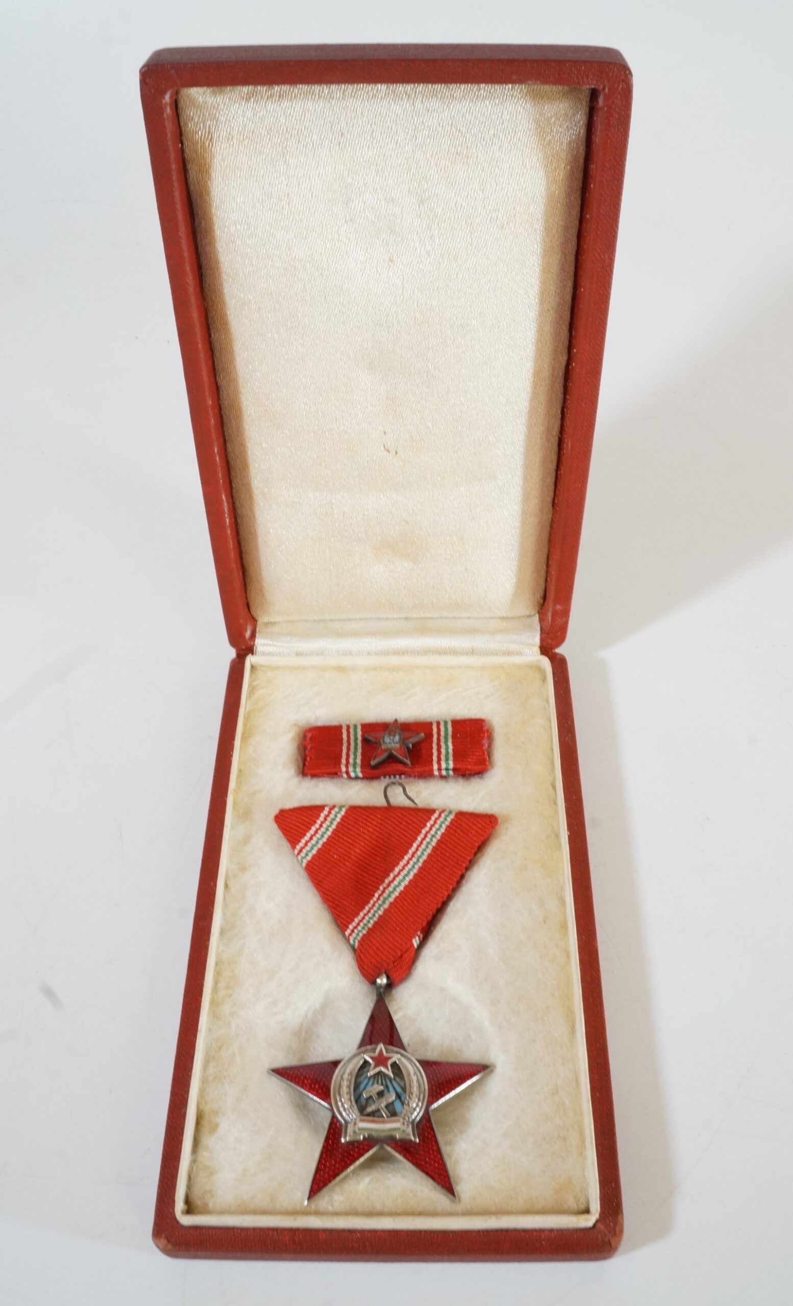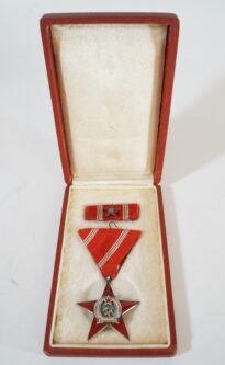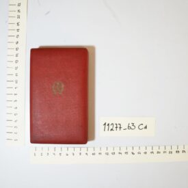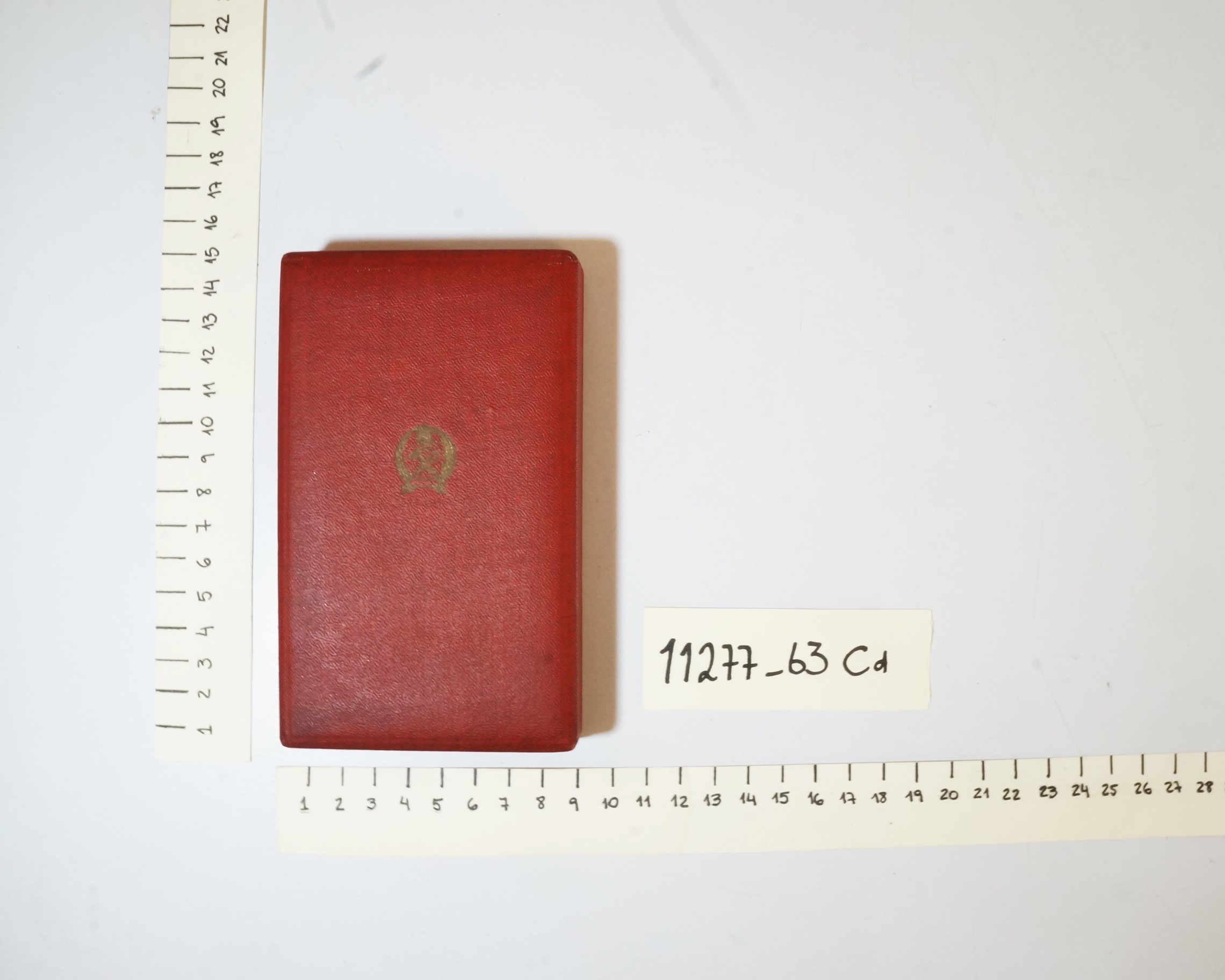 Objeto de metal em formato de estrela, cor vermelha, símbolo do comunismo na parte central. Acompanha estojo de madeira revestido com tecido vermelho, onde também consta foice e martelo, o mesmo símbolo no objeto.