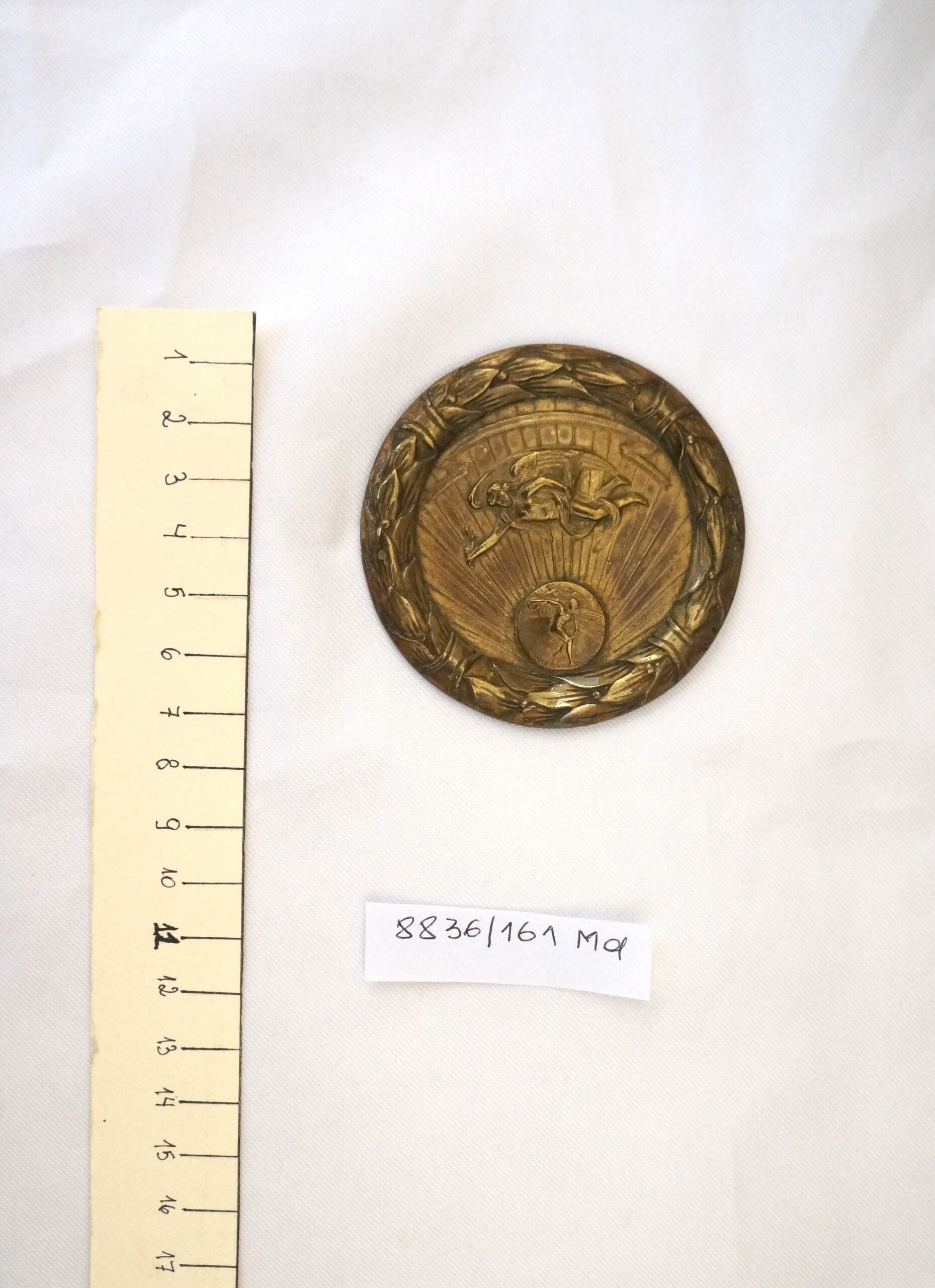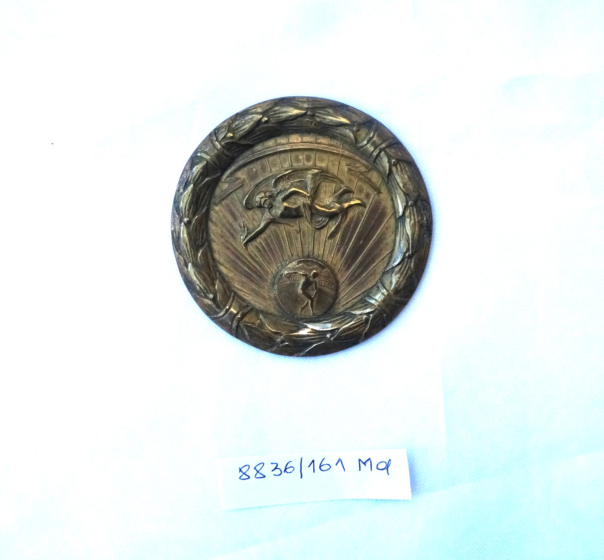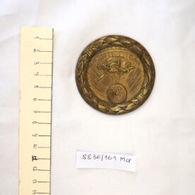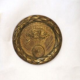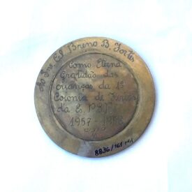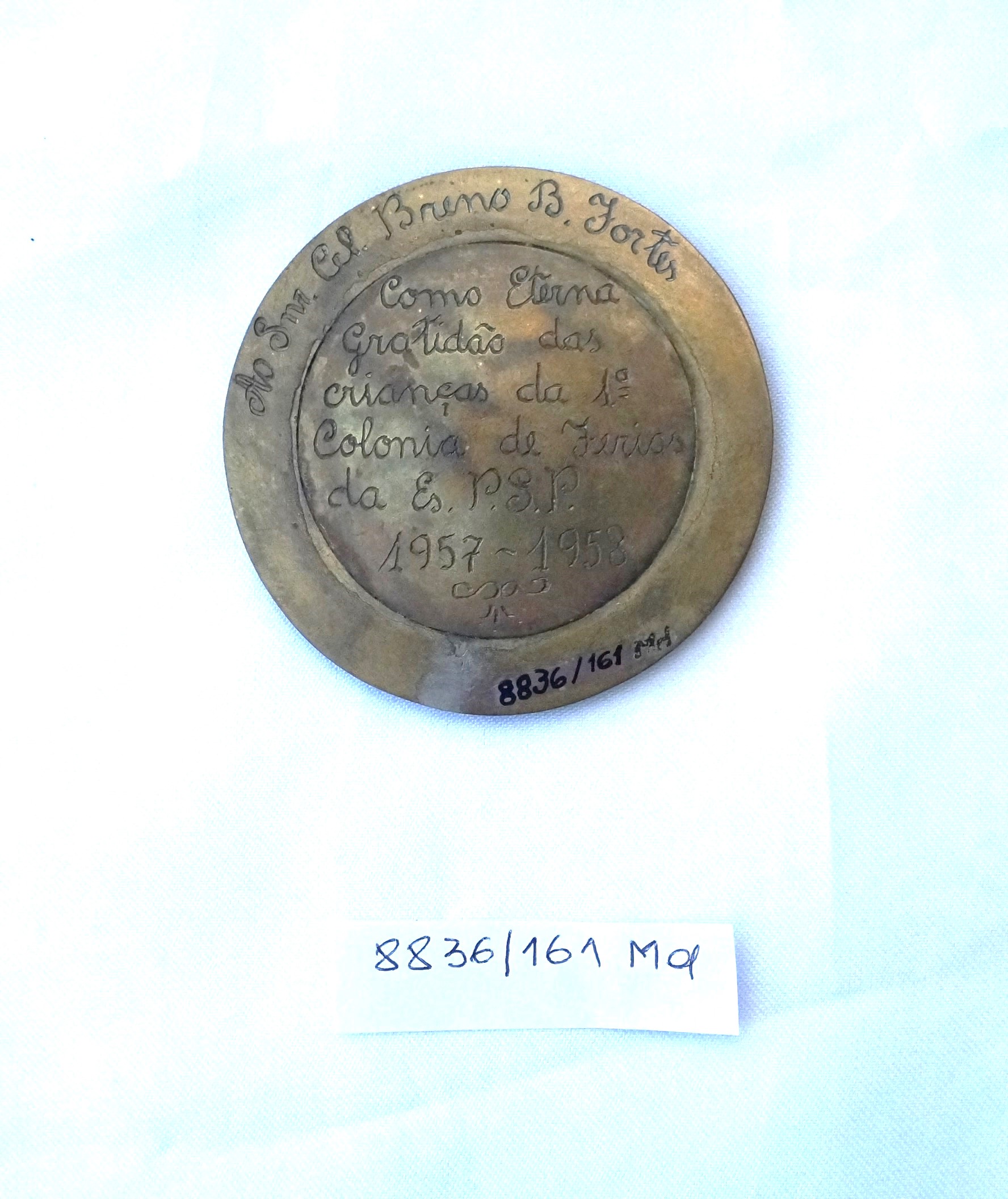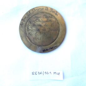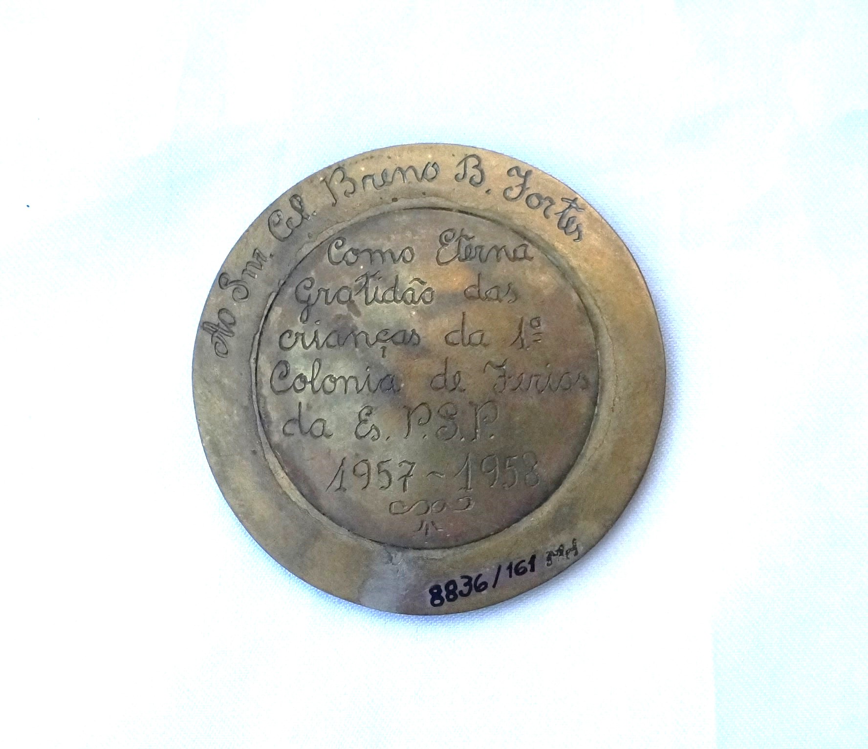Medalha com orla em alto-relevo formando coroa de louros dividida em quatro partes por pequenas faixas; no plano inferior, círculo radiado com arremessador de disco, encimado por figura alada com véus esvoaçantes; ao longo da orla superior, faixa com pontas em movimento. No reverso, dedicatória ao Sr. Cel. Breno Fortes e, dentro do círculo, a inscrição Como eterna gratidão das crianças da 1ª colônia de férias da ES.P.S.P 1957-1958.