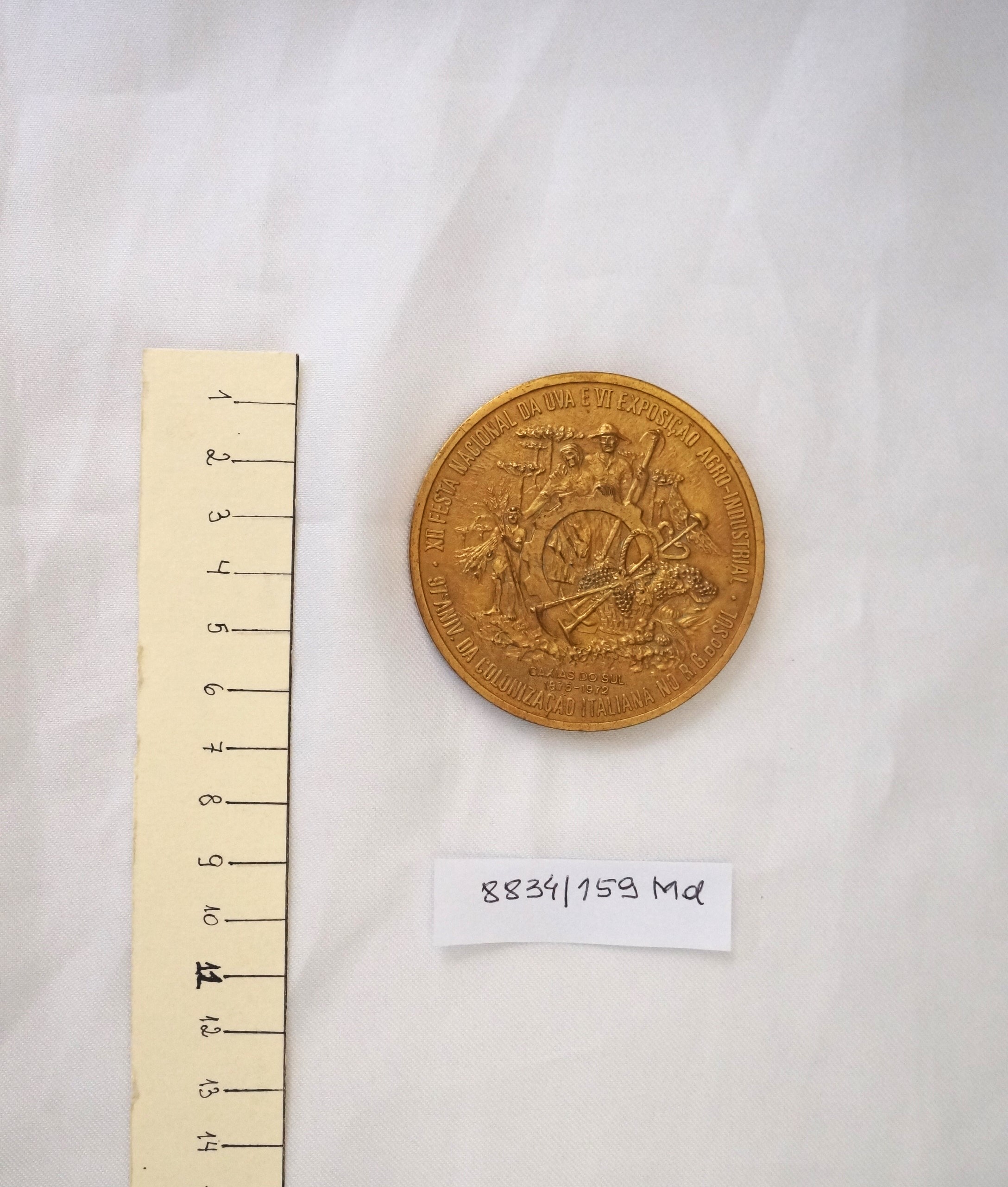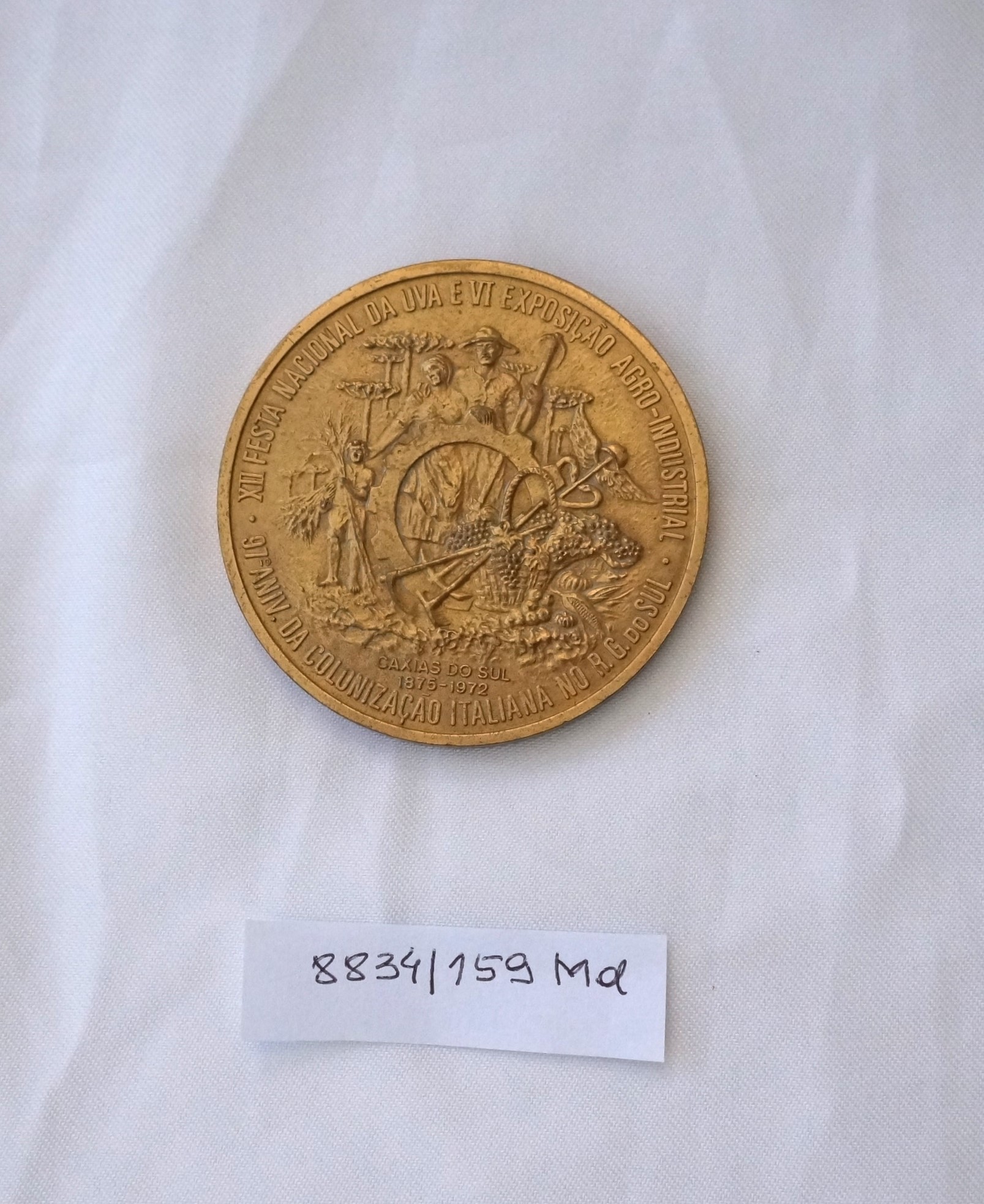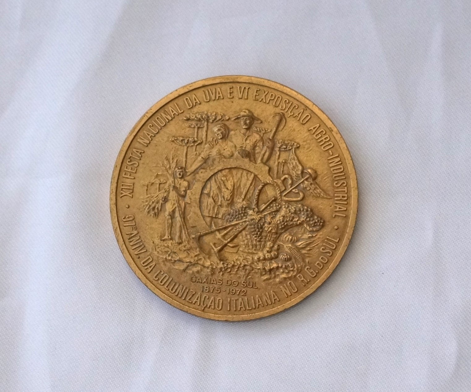 Medalha comemorativa em formato circular. No reverso, na orla, a inscrição XII FESTA NACIONAL DA UVA E VI EXPOSIÇÃO AGRO-INDUSTRIAL – 97° ANIV. DA COLONIZAÇÃO ITALIANA NO R.G.S. DO SUL. No campo central, alegorias representando colonos com ferramentas, cesto de uvas, trigo, milho, outros frutos e araucárias. No exergo, a inscrição Caxias do Sul 1875 – 1972. No anverso, no bordo superior, a inscrição Sesquicentenário da Independência e, no campo central, as efígies do Imperador D. Pedro I e do Presidente Emílio Médici, entre as quais figura a constelação do Cruzeiro do Sul. Entre ambos, arranjo com uvas e trigos; abaixo, os brasões do Império e as armas da República. No exergo, a inscrição Brasil 1822 – 1972.