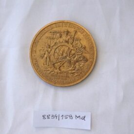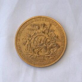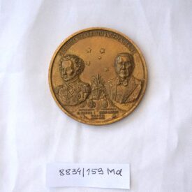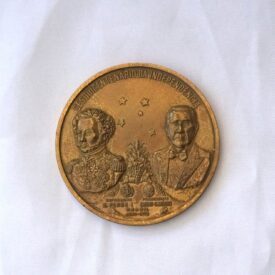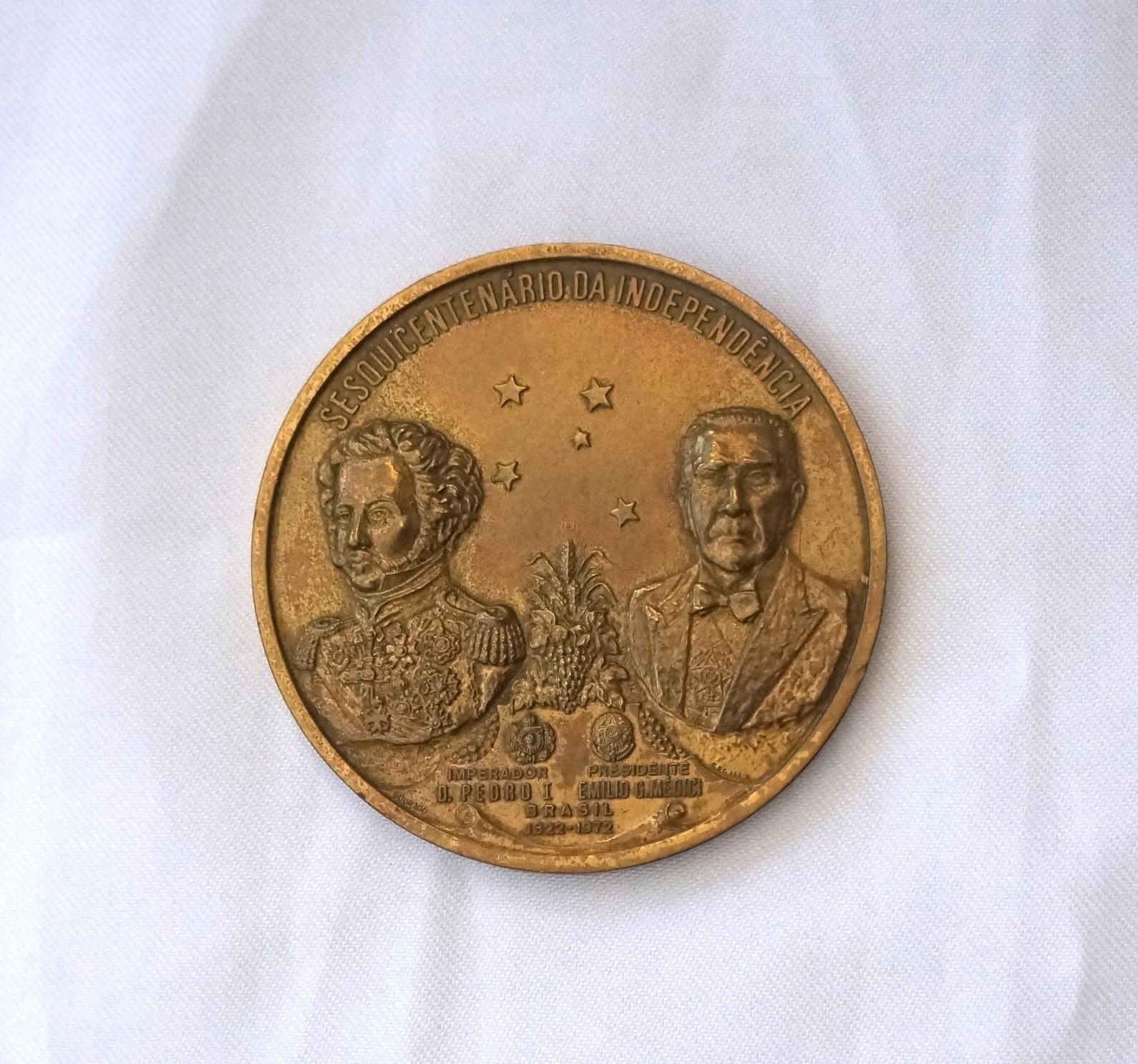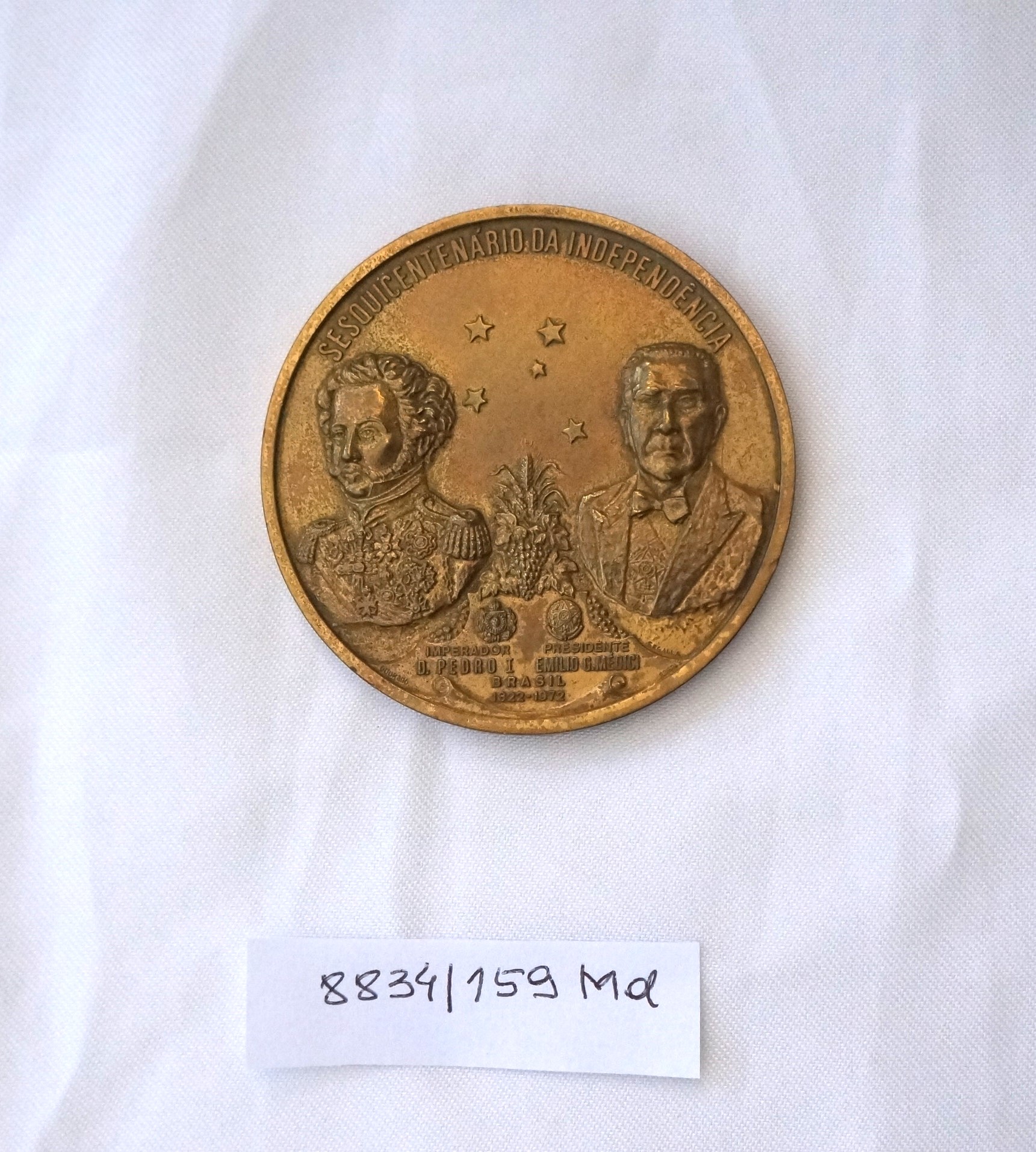 Medalha comemorativa em formato circular. No reverso, na orla, a inscrição XII FESTA NACIONAL DA UVA E VI EXPOSIÇÃO AGRO-INDUSTRIAL – 97° ANIV. DA COLONIZAÇÃO ITALIANA NO R.G.S. DO SUL. No campo central, alegorias representando colonos com ferramentas, cesto de uvas, trigo, milho, outros frutos e araucárias. No exergo, a inscrição Caxias do Sul 1875 – 1972. No anverso, no bordo superior, a inscrição Sesquicentenário da Independência e, no campo central, as efígies do Imperador D. Pedro I e do Presidente Emílio Médici, entre as quais figura a constelação do Cruzeiro do Sul. Entre ambos, arranjo com uvas e trigos; abaixo, os brasões do Império e as armas da República. No exergo, a inscrição Brasil 1822 – 1972.