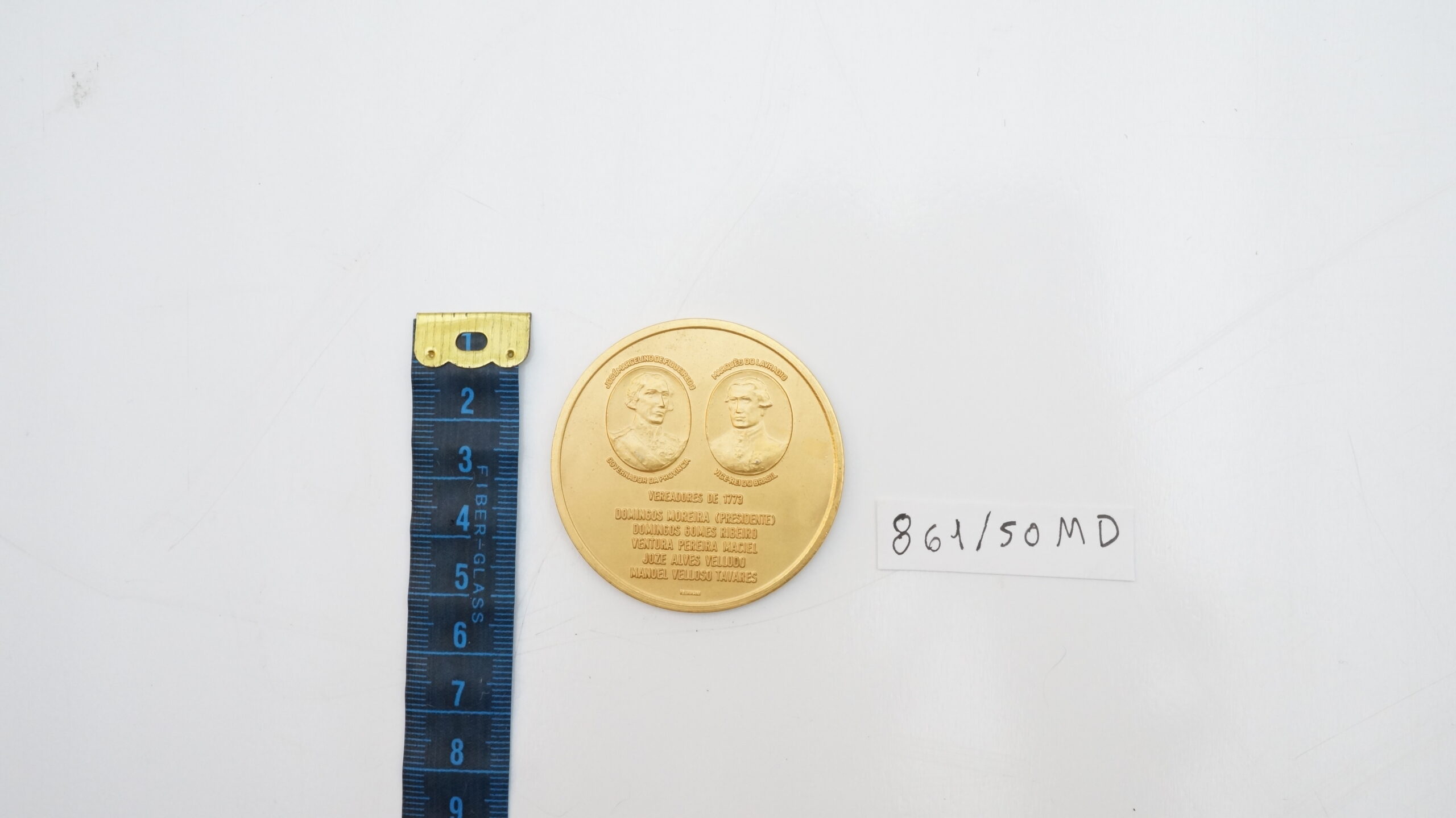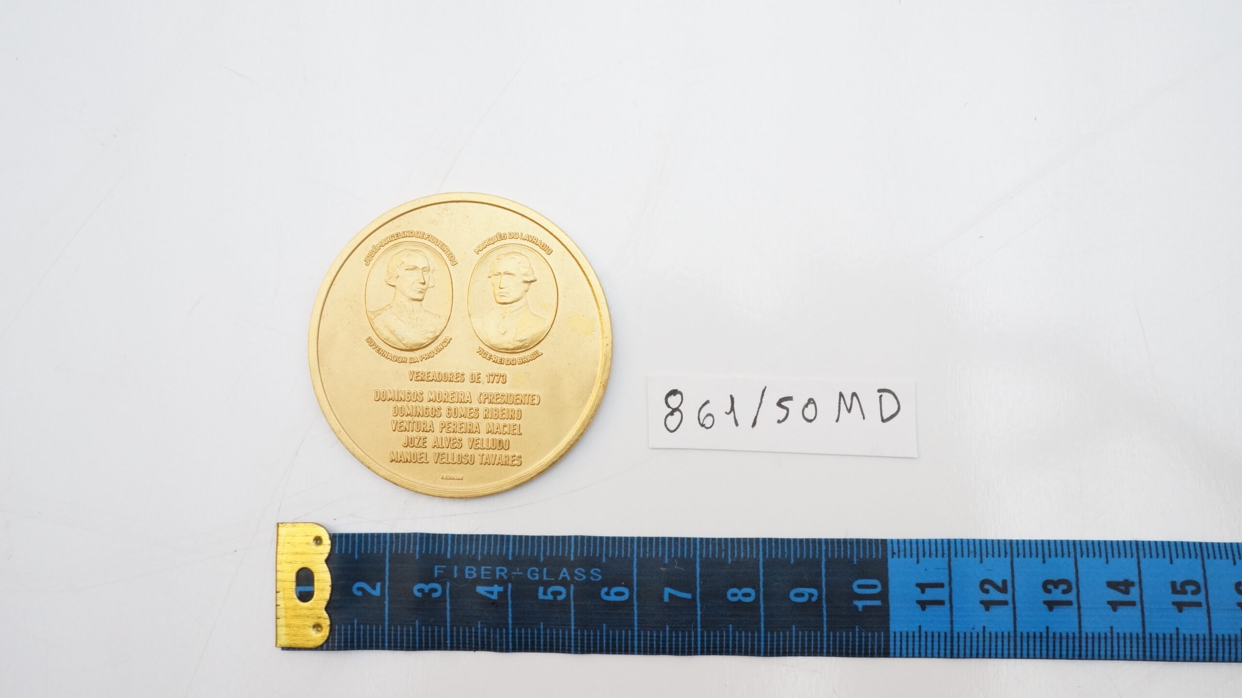 Orla lisa com aproximadamente 1,2 mm e bordo liso de 1,9 mm. Na parte superior da face, duas elipses com as efígies voltadas para a direita, do Marquês do Lavrado, Vice‑Rei do Brasil, e de José Marcelino de Figueiredo, governador da província. Acima das elipses, os nomes correspondentes e, abaixo, os títulos. Na metade inferior da face, a inscrição disposta em seis linhas VEREADORES DE 1773 / DOMINGOS MOREIRA (PRESIDENTE) / DOMINGOS GOMES RIBEIRO / VENTURA PEREIRA MACIEL / JOZE ALVES VELLUDO / MANOEL VELLOSO TAVARES. No exergo, quase ilegível, F. LOHMANN. No reverso, a orla contém a inscrição BICENTENÁRIO DA CÂMARA MUNICIPAL DE PORTO ALEGRE 1773 – 6 DE SETEMBRO 1973, entre dois pontos, enquanto o campo apresenta texto distribuído em doze linhas.