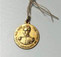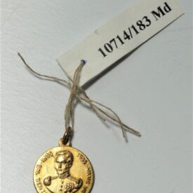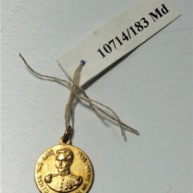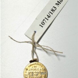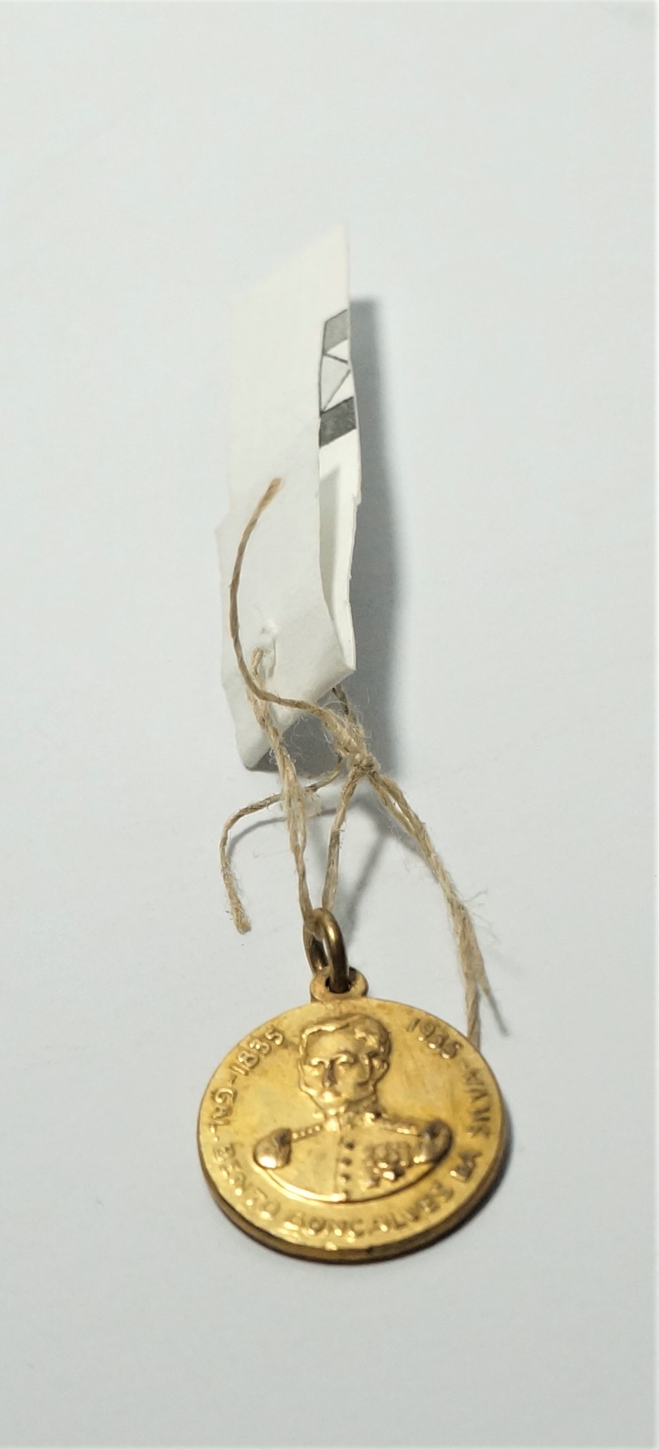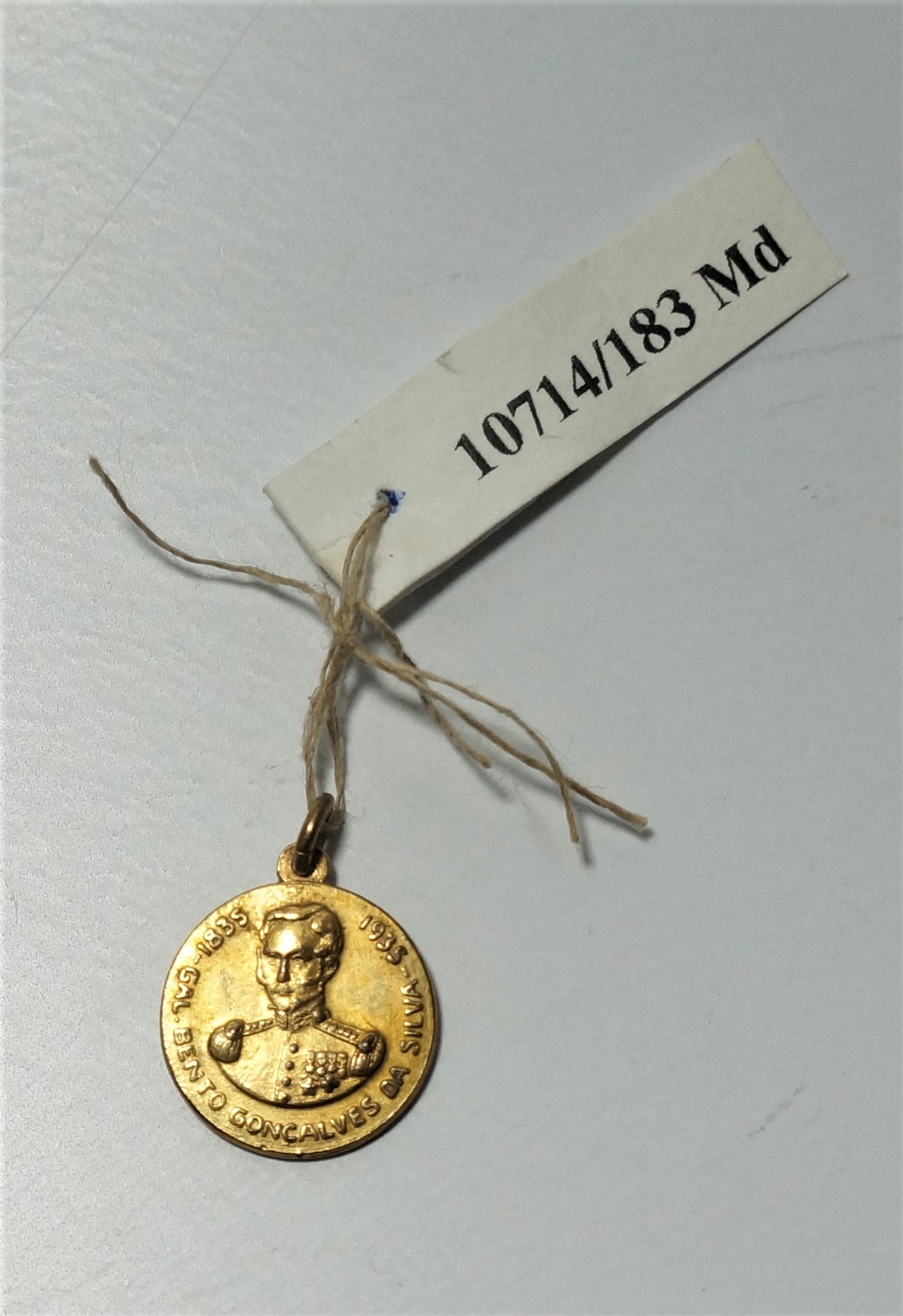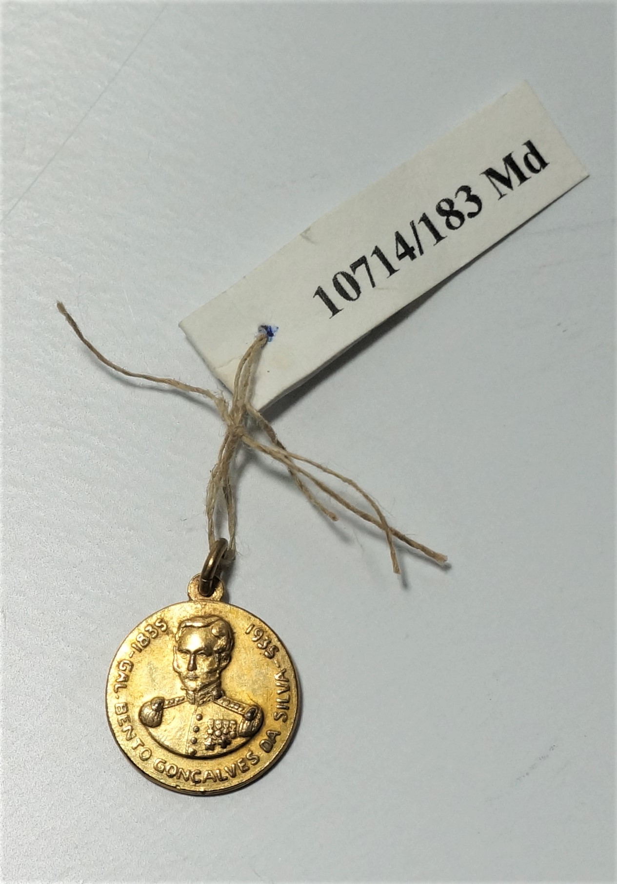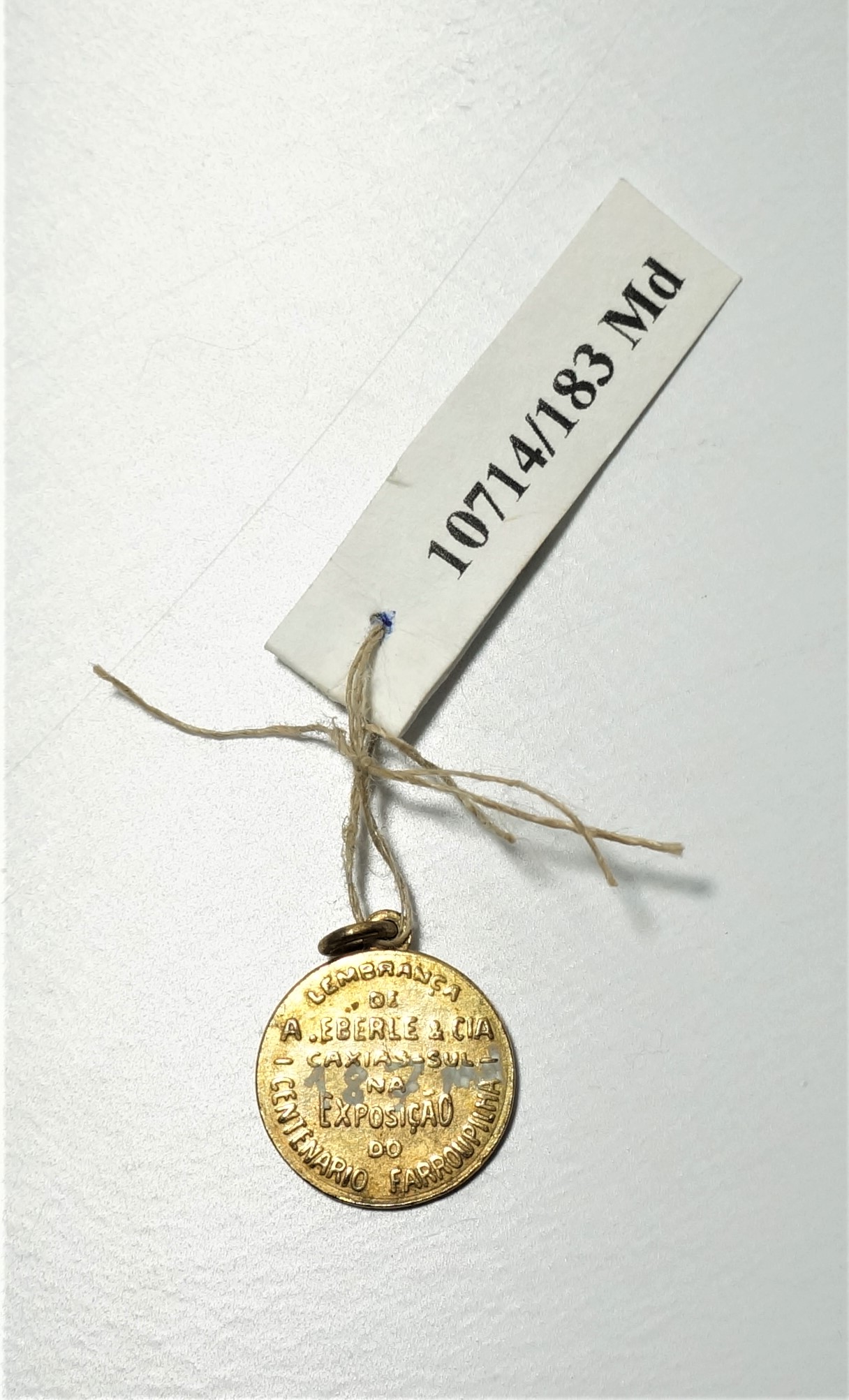 Medalha em formato circular com encaixe na extremidade para argola. Em uma face, efígie em relevo de homem fardado circundada pelos dizeres 1835 – Gal. Bento Gonçalves da Silva – 1935. Na outra face, inscrição Lembrança de A. Eberle & Cia – Caxias do Sul – na Exposição do I Centenário Farroupilha.