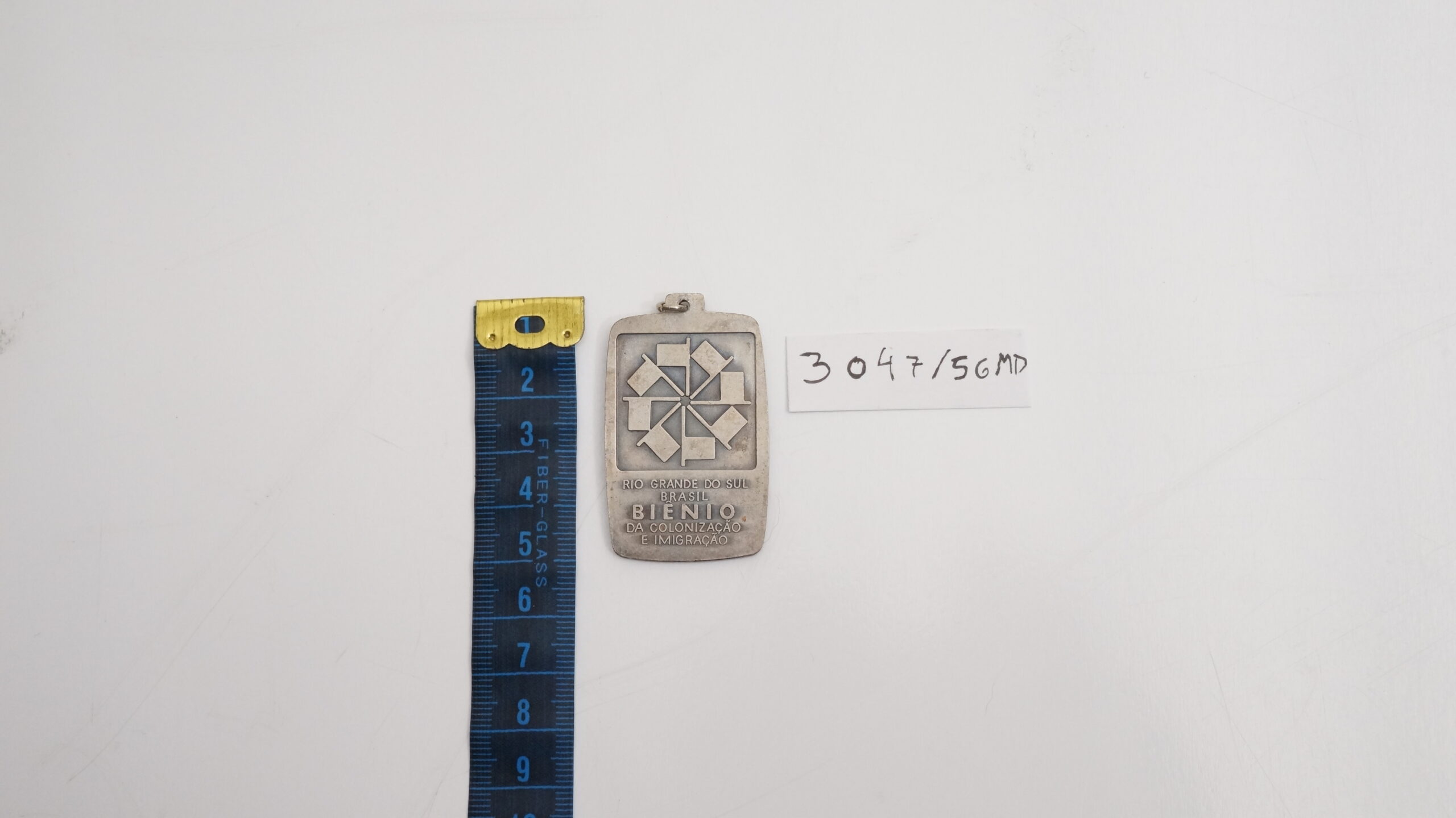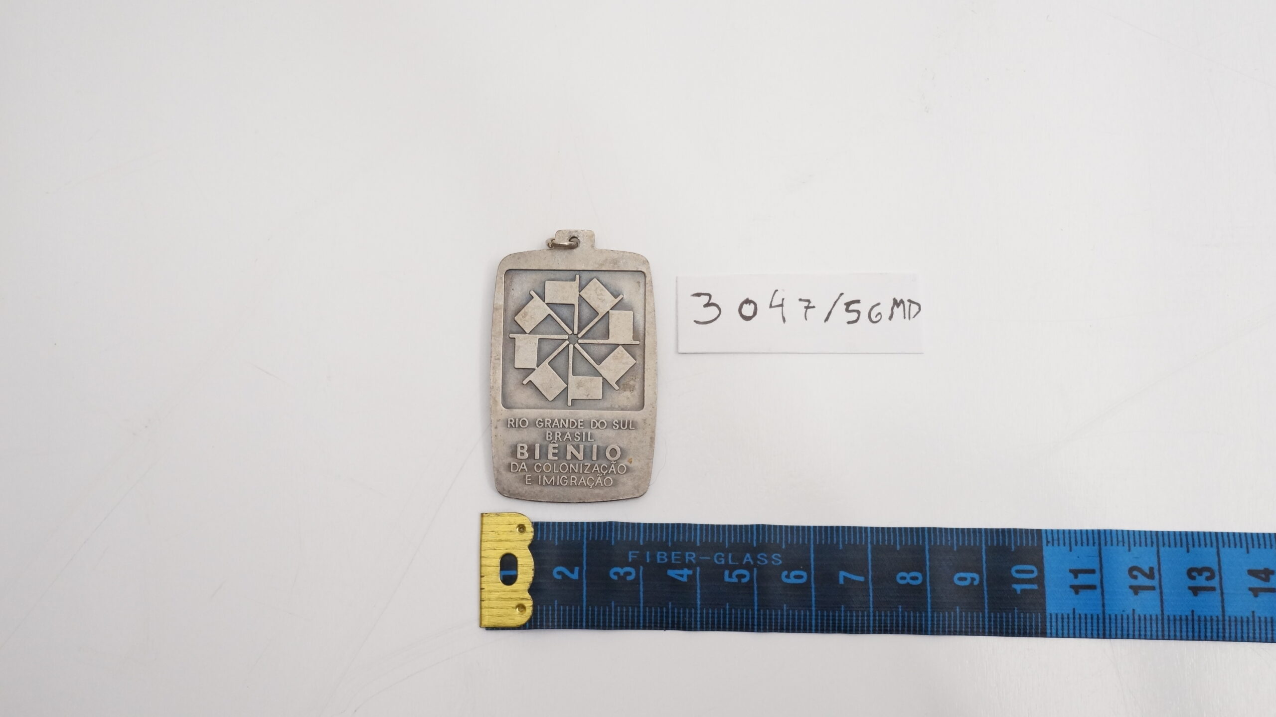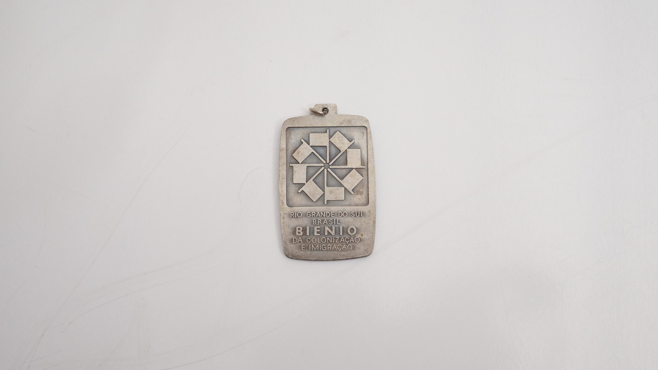 Medalha comemorativa retangular em metal dourado, apresentando no anverso a gravura de um atleta acompanhada dos dizeres FESTIVAL DE ESPORTES 1974 – 1975. No reverso, gravura de oito bandeiras dispostas em círculo e abaixo os dizeres RIO GRANDE DO SUL BRASIL BIÊNIO DA COLONIZAÇÃO E IMIGRAÇÃO NO RS.