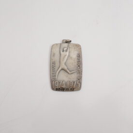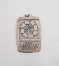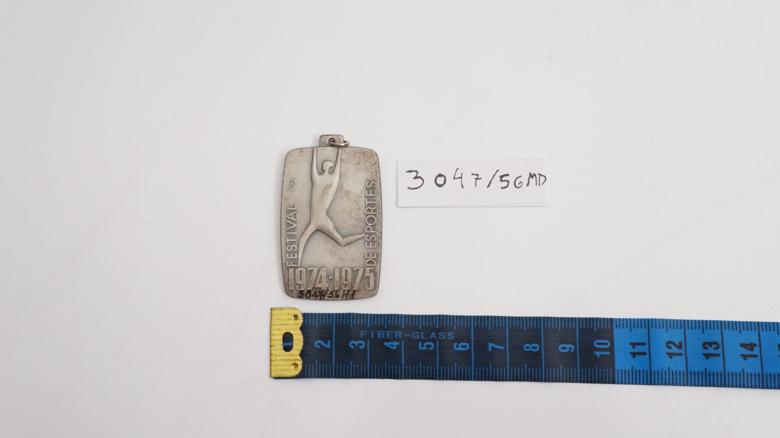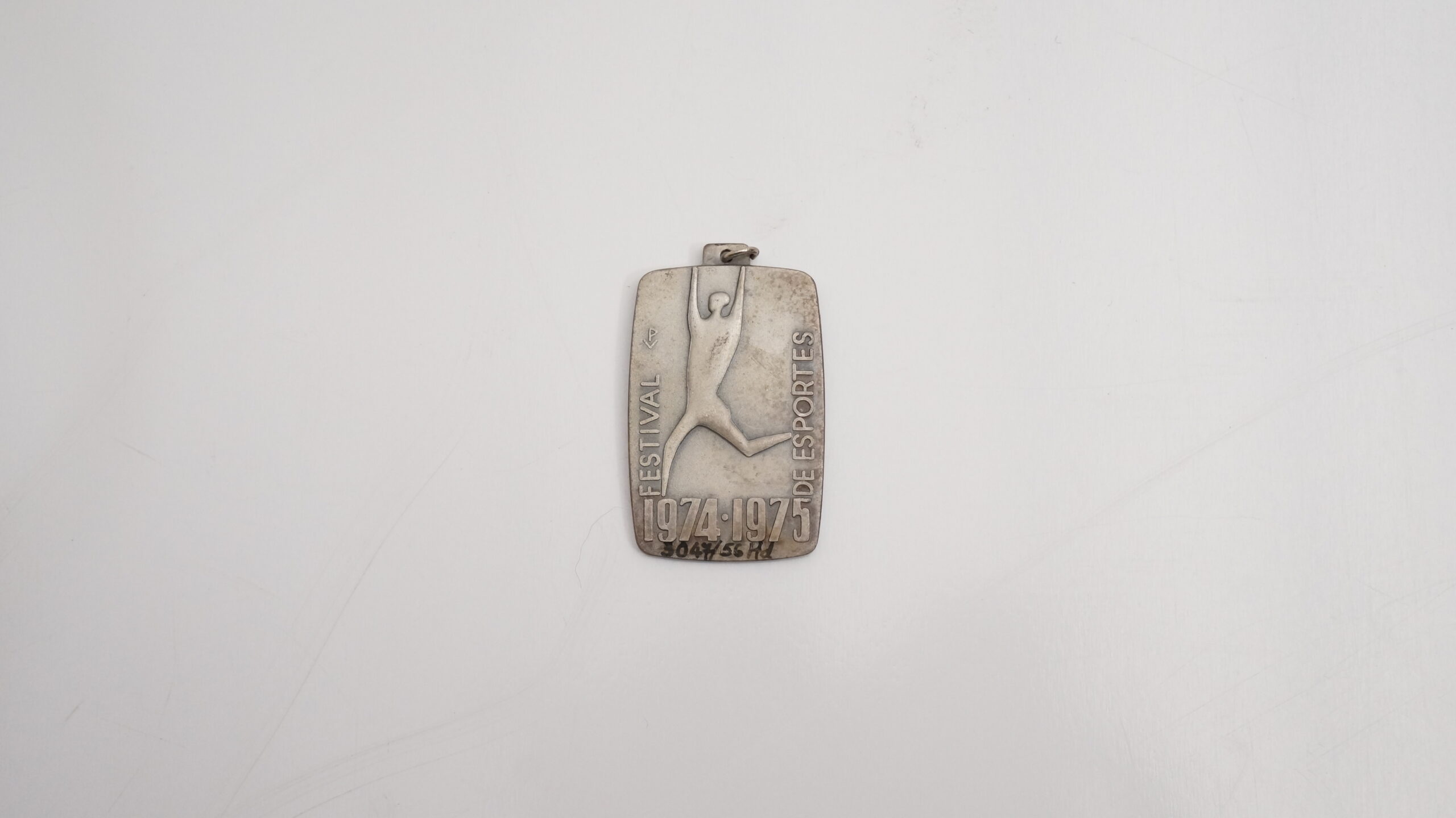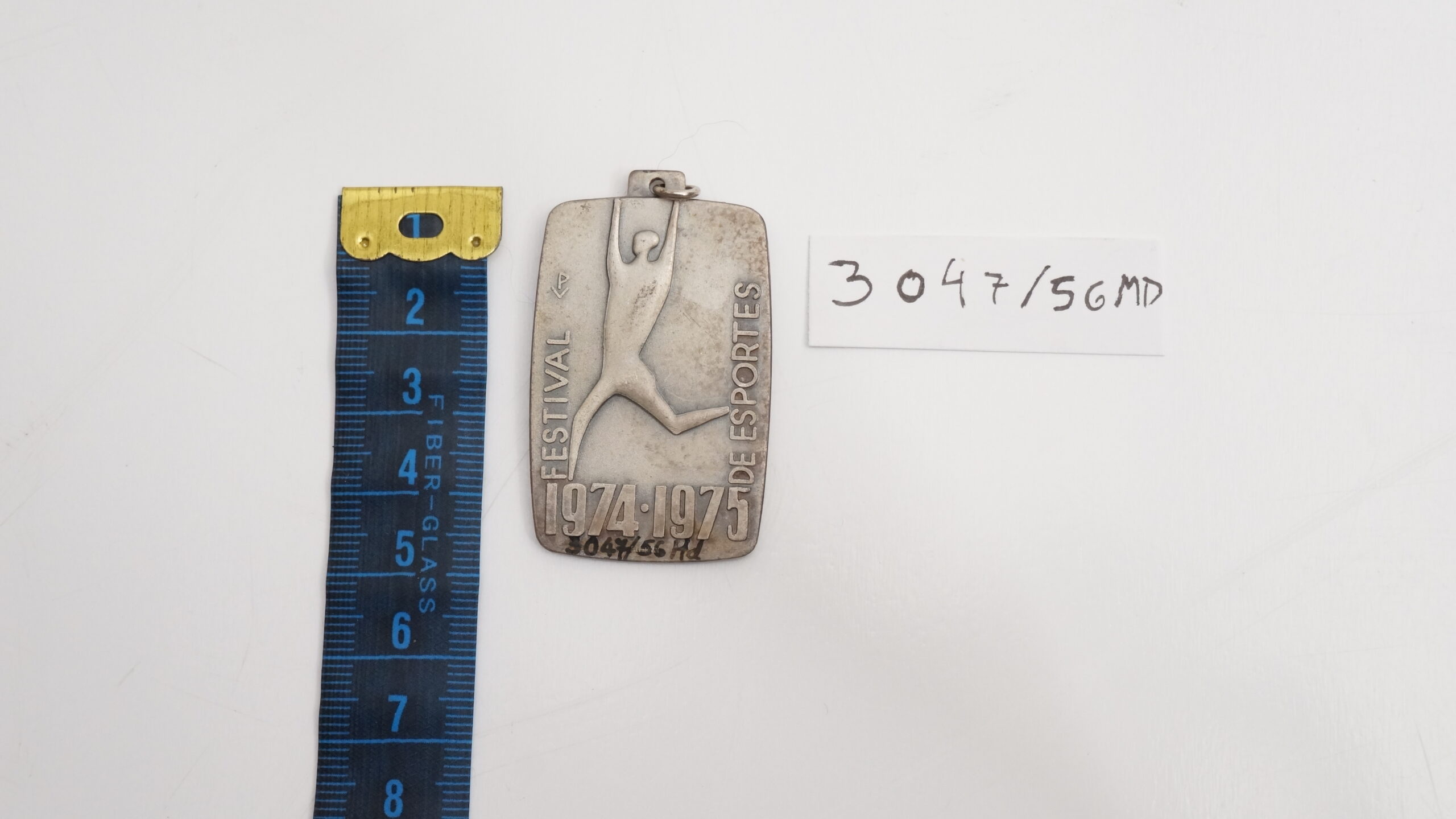 Medalha comemorativa retangular em metal dourado, apresentando no anverso a gravura de um atleta acompanhada dos dizeres FESTIVAL DE ESPORTES 1974 – 1975. No reverso, gravura de oito bandeiras dispostas em círculo e abaixo os dizeres RIO GRANDE DO SUL BRASIL BIÊNIO DA COLONIZAÇÃO E IMIGRAÇÃO NO RS.