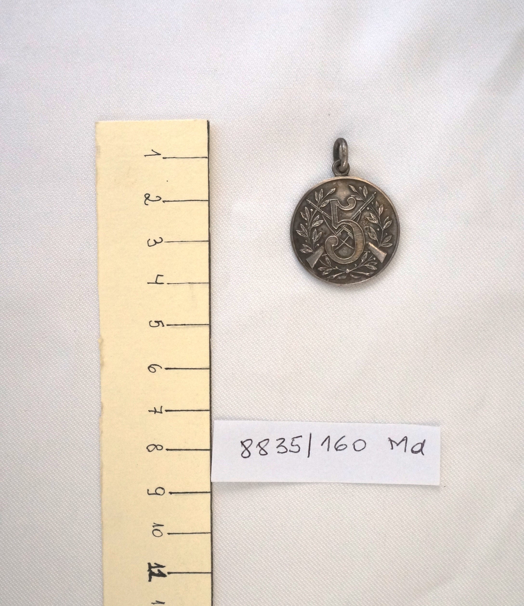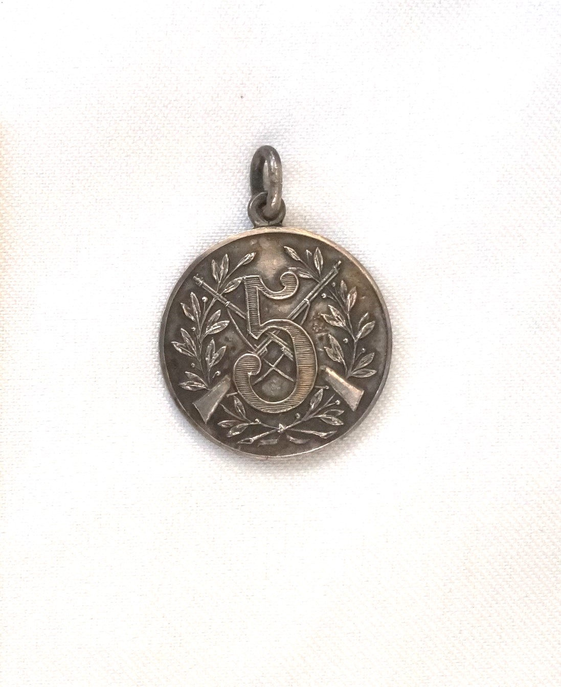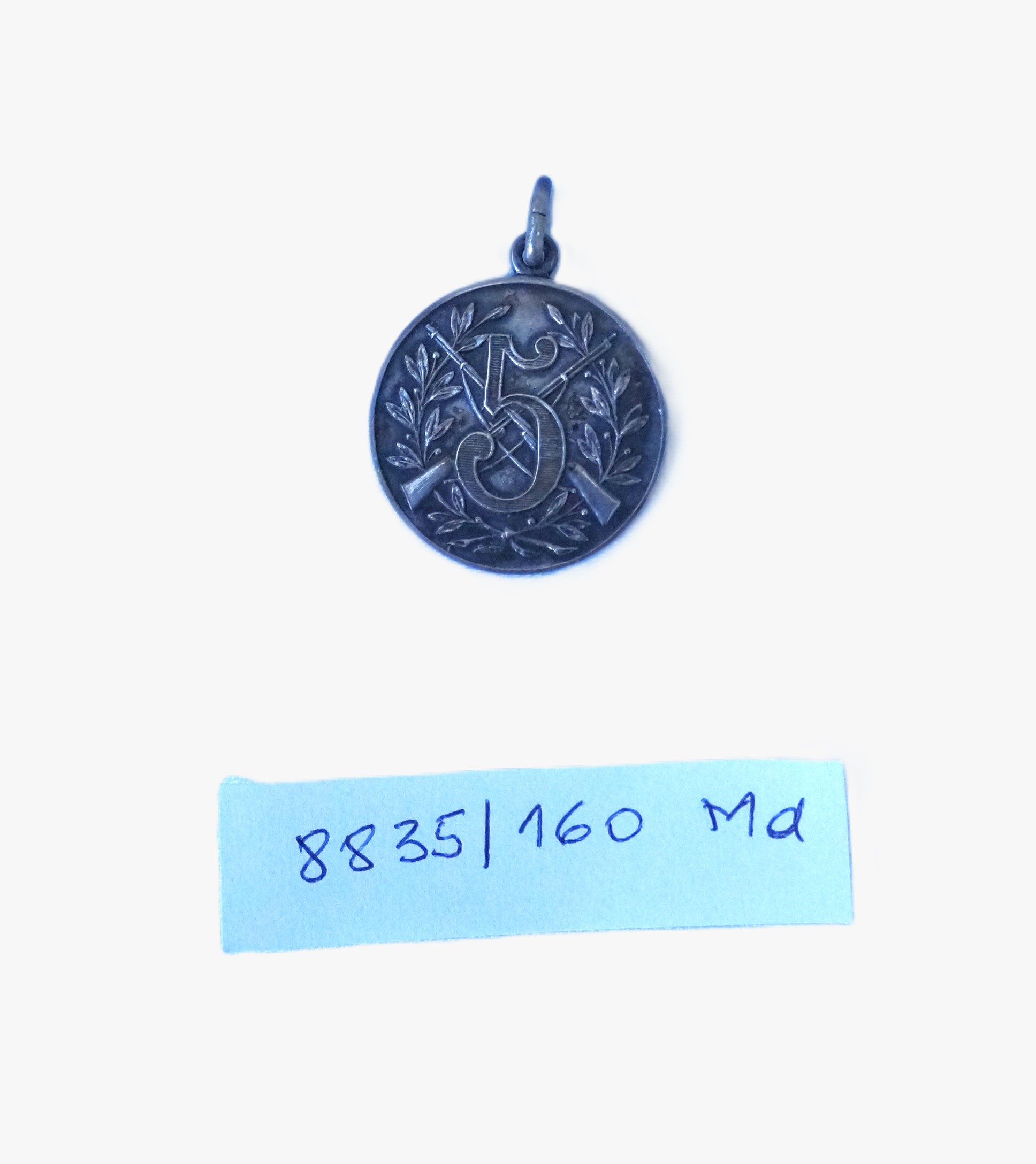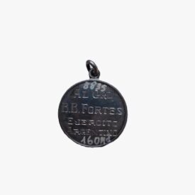 Medalha em prata com anverso apresentando número 5 sobre dois fuzis cruzados, circundados por dois ramos de louros enlaçados na base. No reverso, a inscrição AL GRL B.B FORTES EJERCITO ARGENTINO. Orla com moldura simples e argola no bordo superior da medalha.
