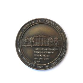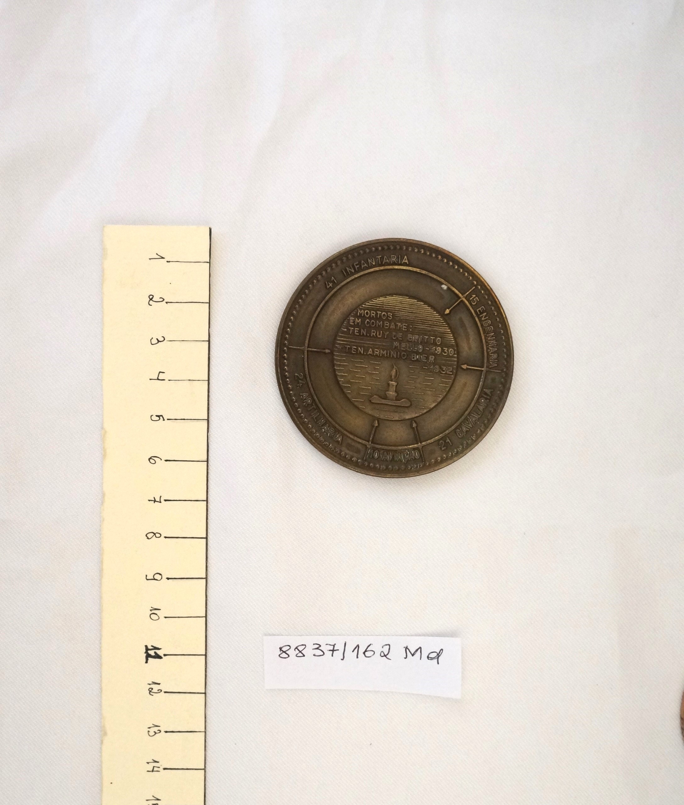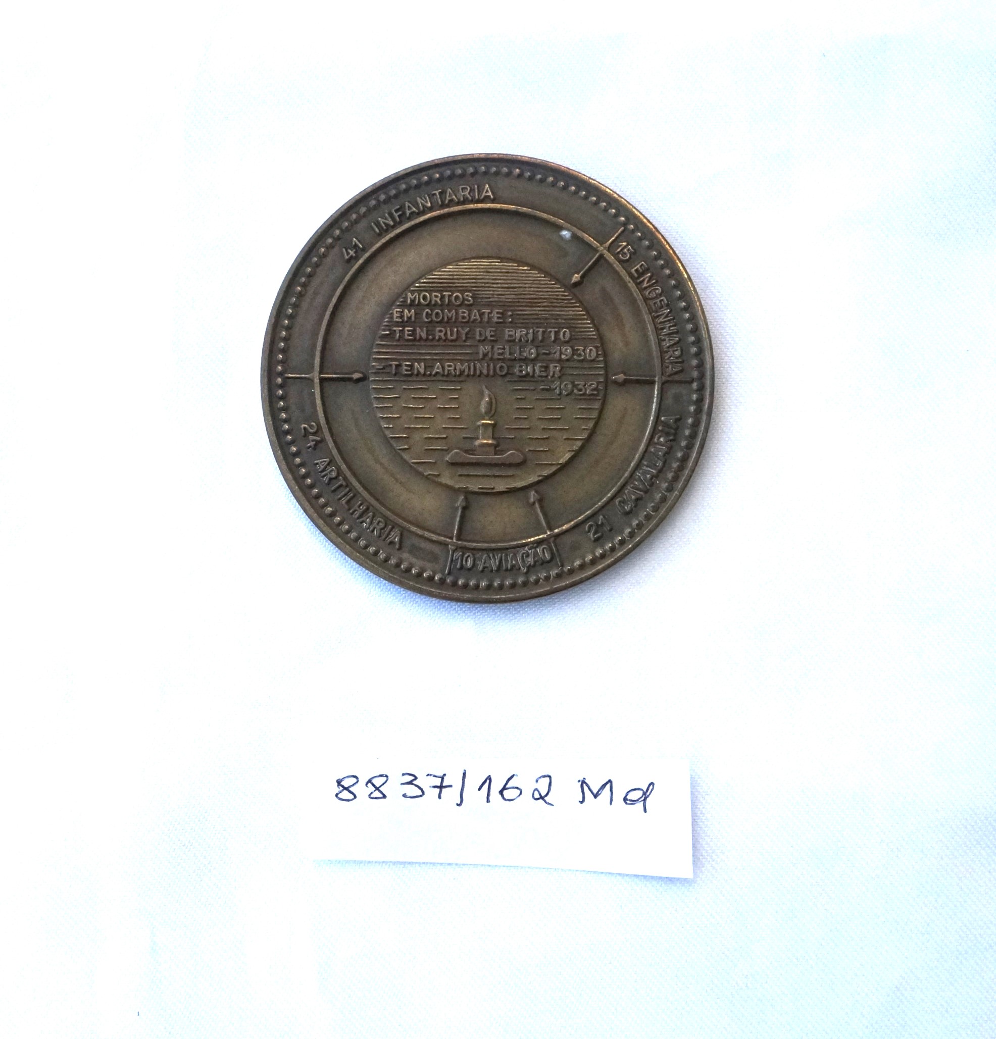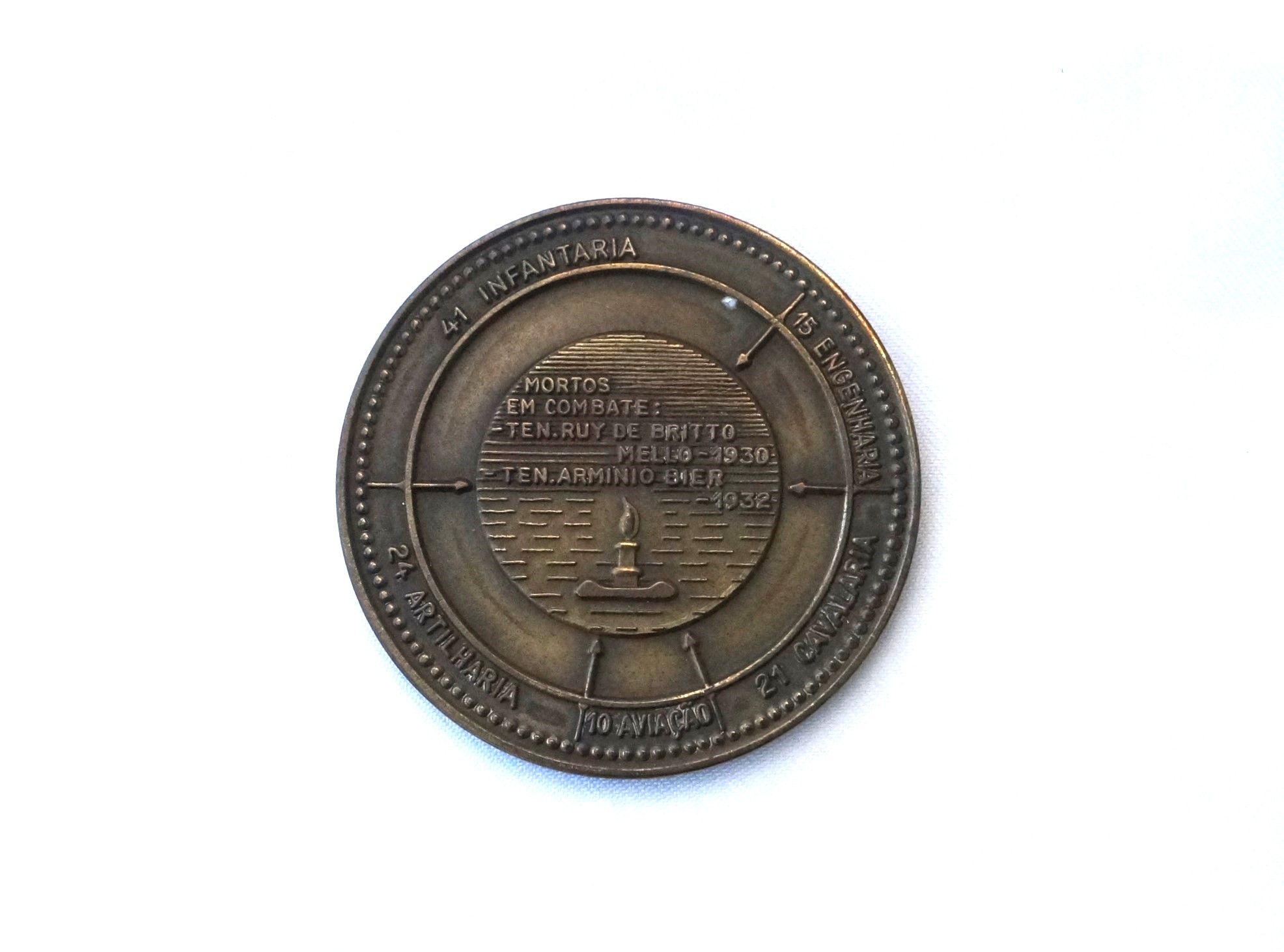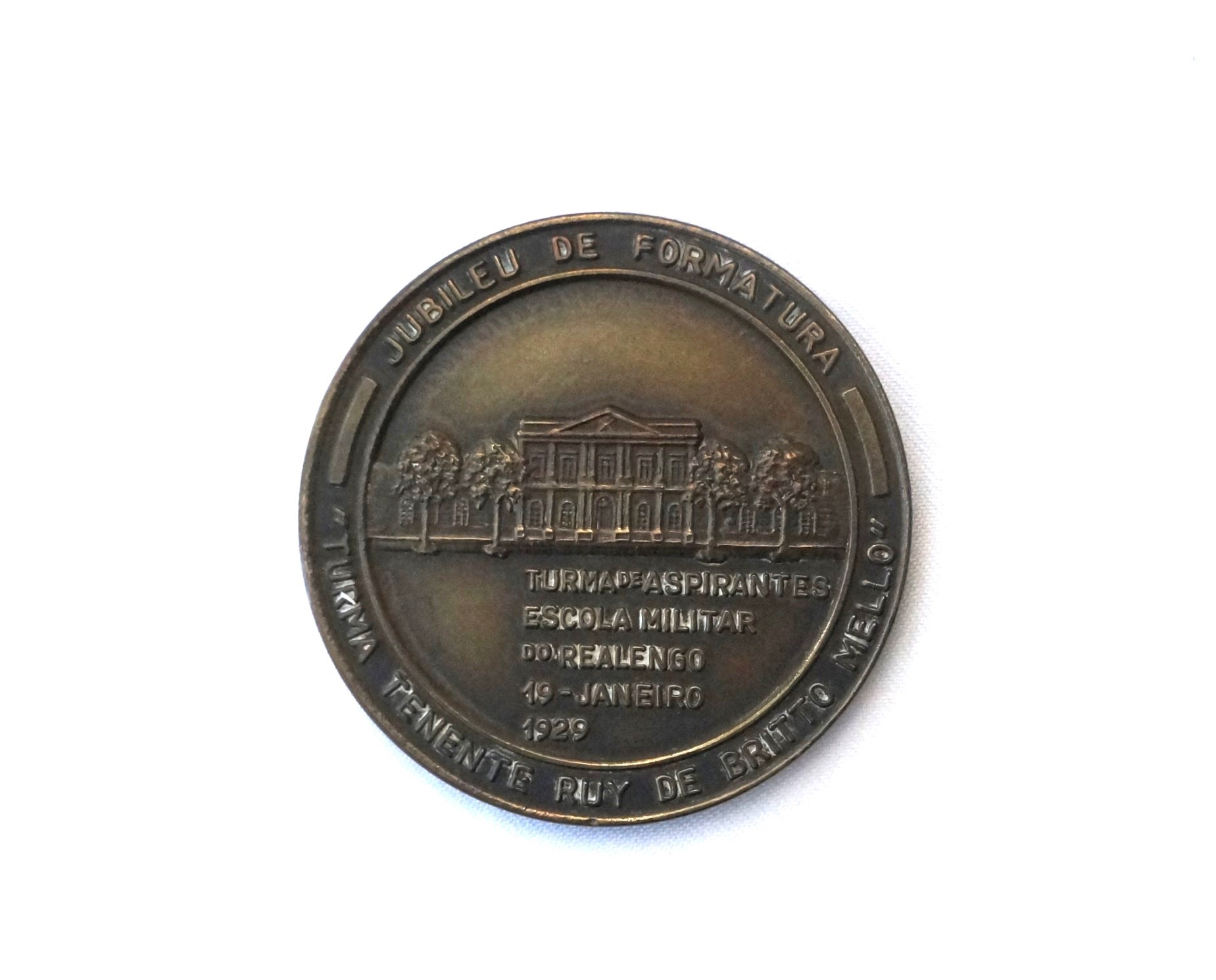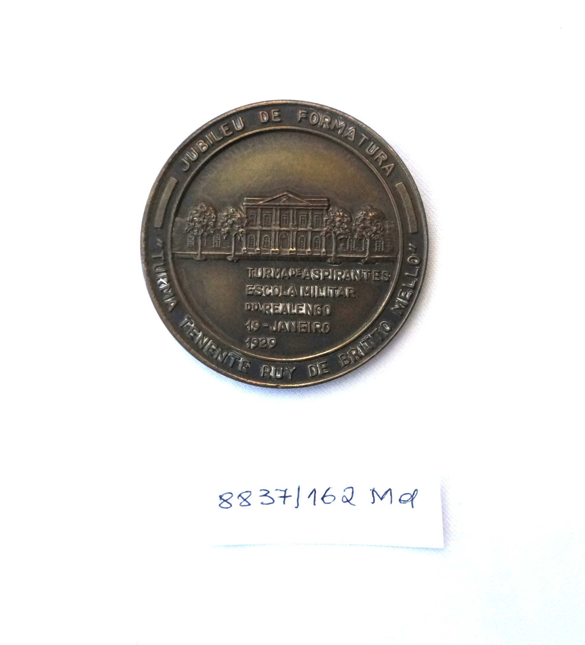 Medalha circular com inscrições em relevo. Na orla, a inscrição JUBILEU DE FORMATURA – TURMA TENENTE RUY DE BRITTO MELLO; no campo central, a fachada da Escola Militar e a inscrição TURMA DE ASPIRANTES – ESCOLA MILITAR DO REALENGO – 19 JANEIRO 1929. No reverso, a orla com as incorporações 41 Infantaria, 15 Engenharia, 21 Cavalaria, 10 Aviação, 24 Artilharia; no campo central, dentro de um círculo, a inscrição Mortos em combate Tte. Ruy de Britto Mello 1930 Tte. Armínio Bier 1932, abaixo uma vela estilizada.