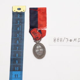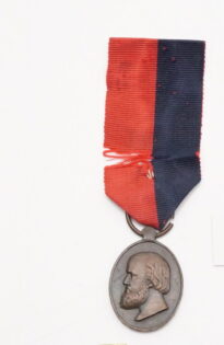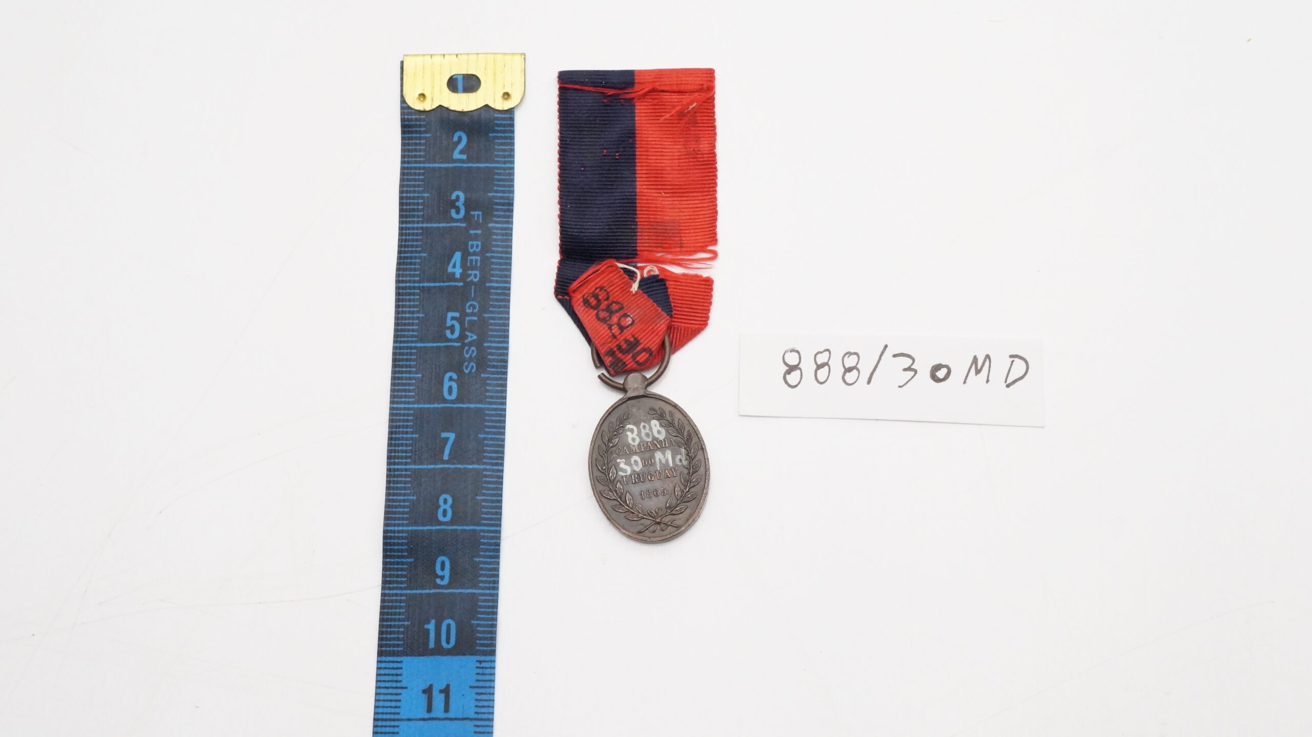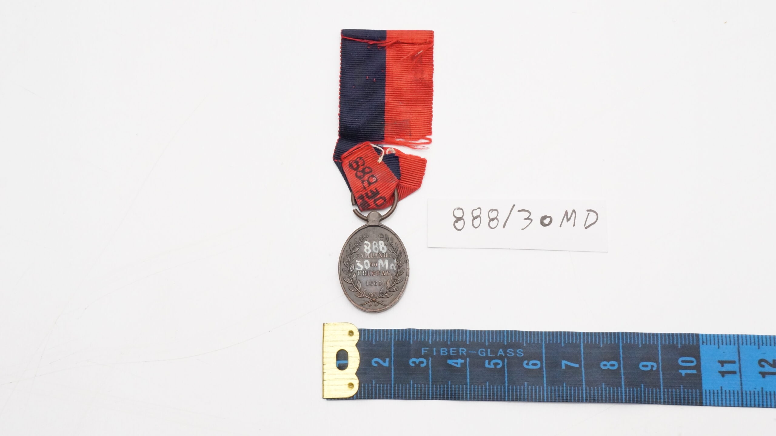 Medalha de formato oval. No anverso, efígie do Imperador. No reverso, legenda CAMPANHA DO URUGUAI com a data 1865 ao centro de coroa formada por ramos de louro. A peça é conhecida como medalha do Paraguai e pendia de fita com faixas azul ferrete e encarnada em partes iguais.