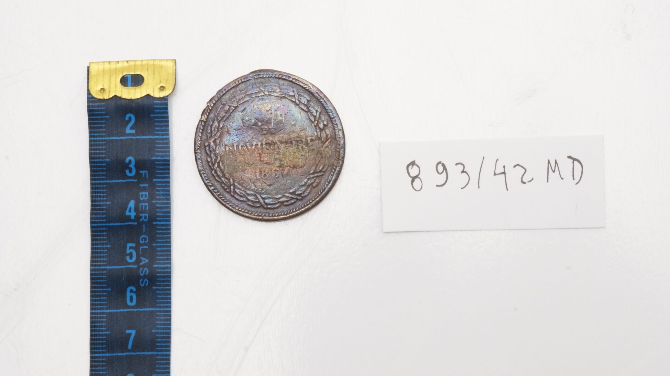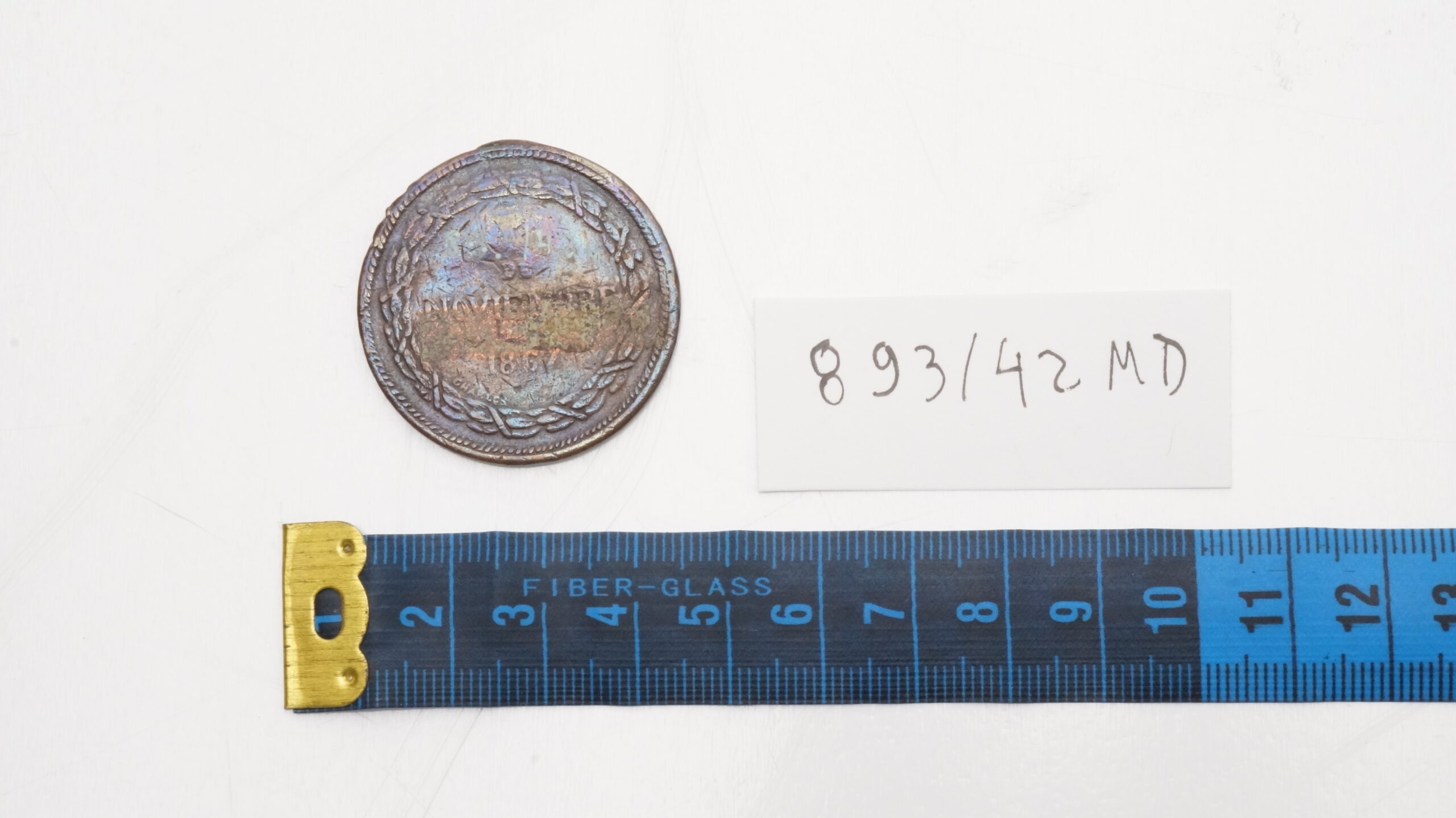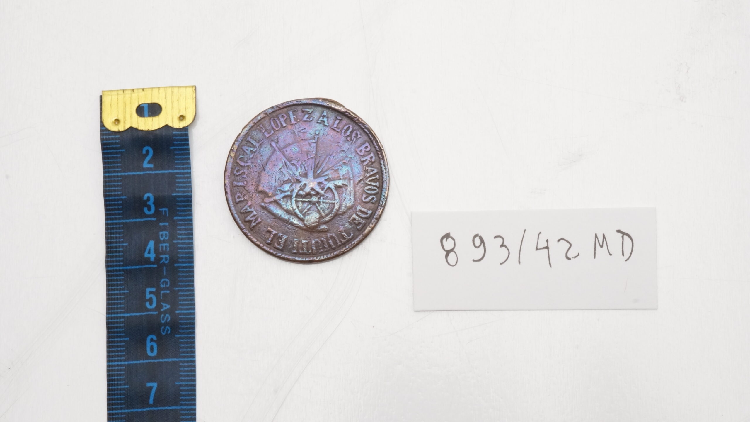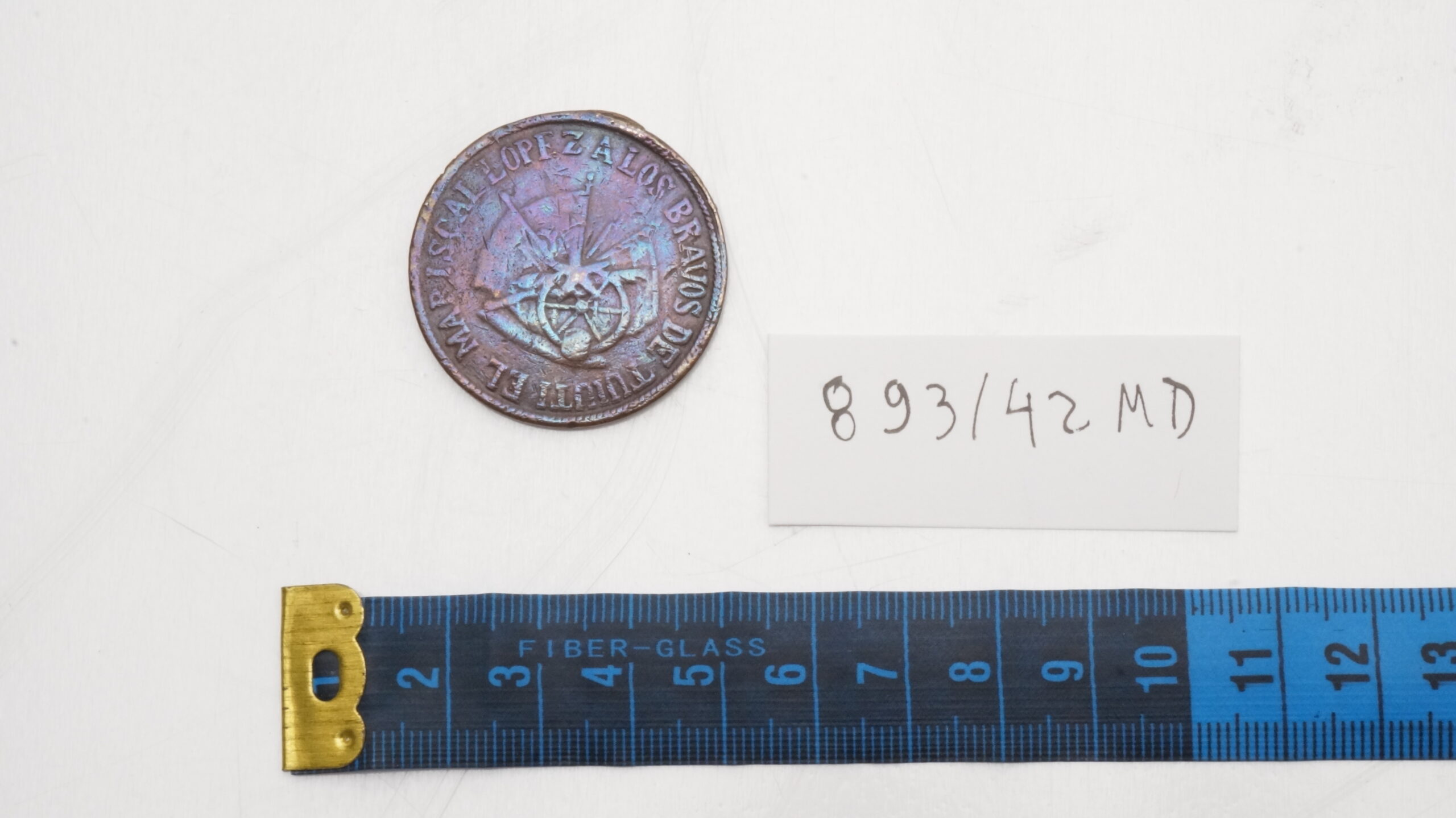 Medalha paraguaia de Tuiuti, conferida pelo Marechal López aos bravos de Tuiuti. Peça circular em bronze. No anverso, composição em relevo com armas e bandeiras, com estrela ao centro e a inscrição EL MARISCAL LOPEZ A LOS BRAVOS DE TUIUTI ao redor. No reverso, dizeres NOVIEMBRE 1867 ao centro, circundados por ramos.