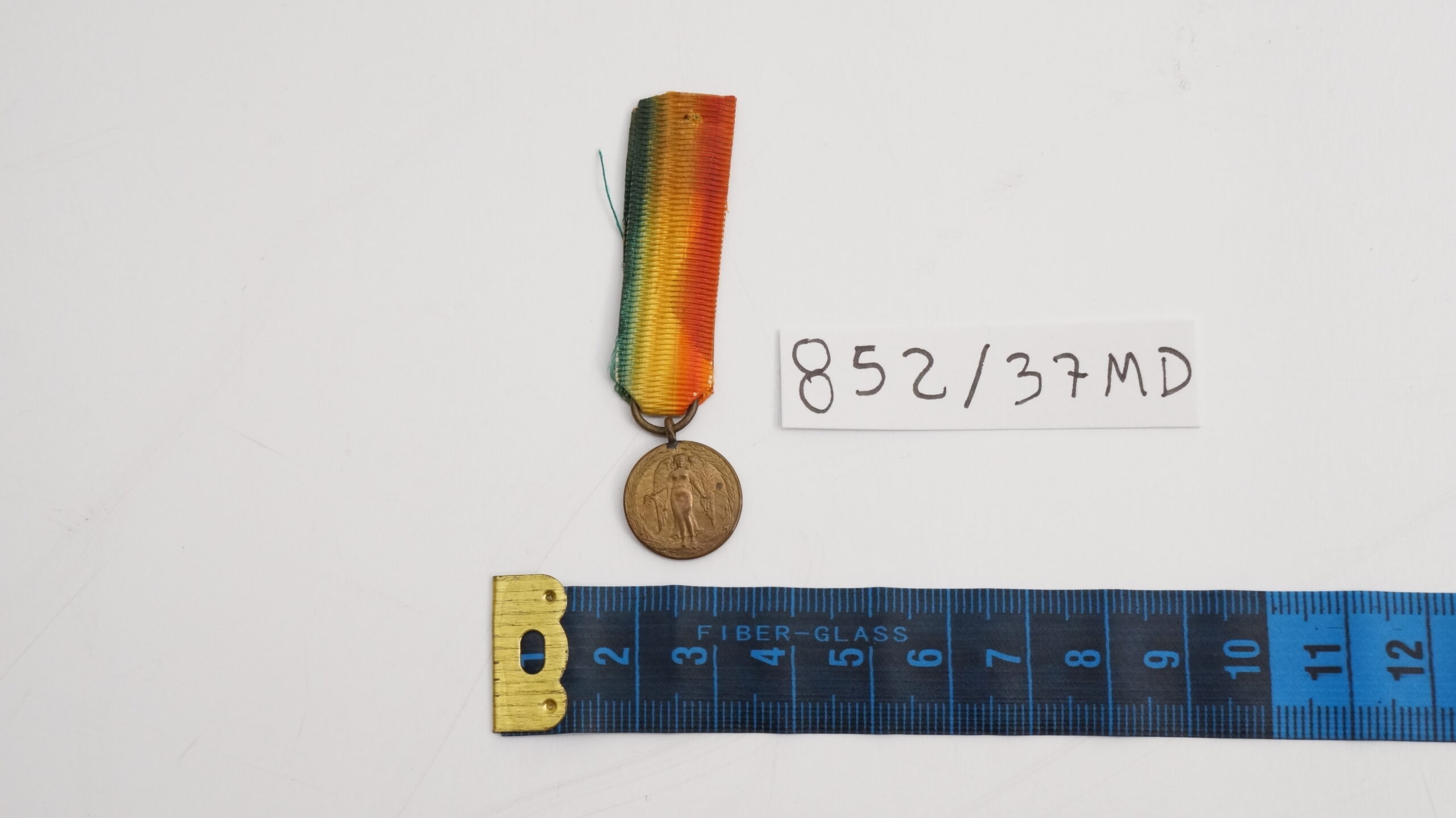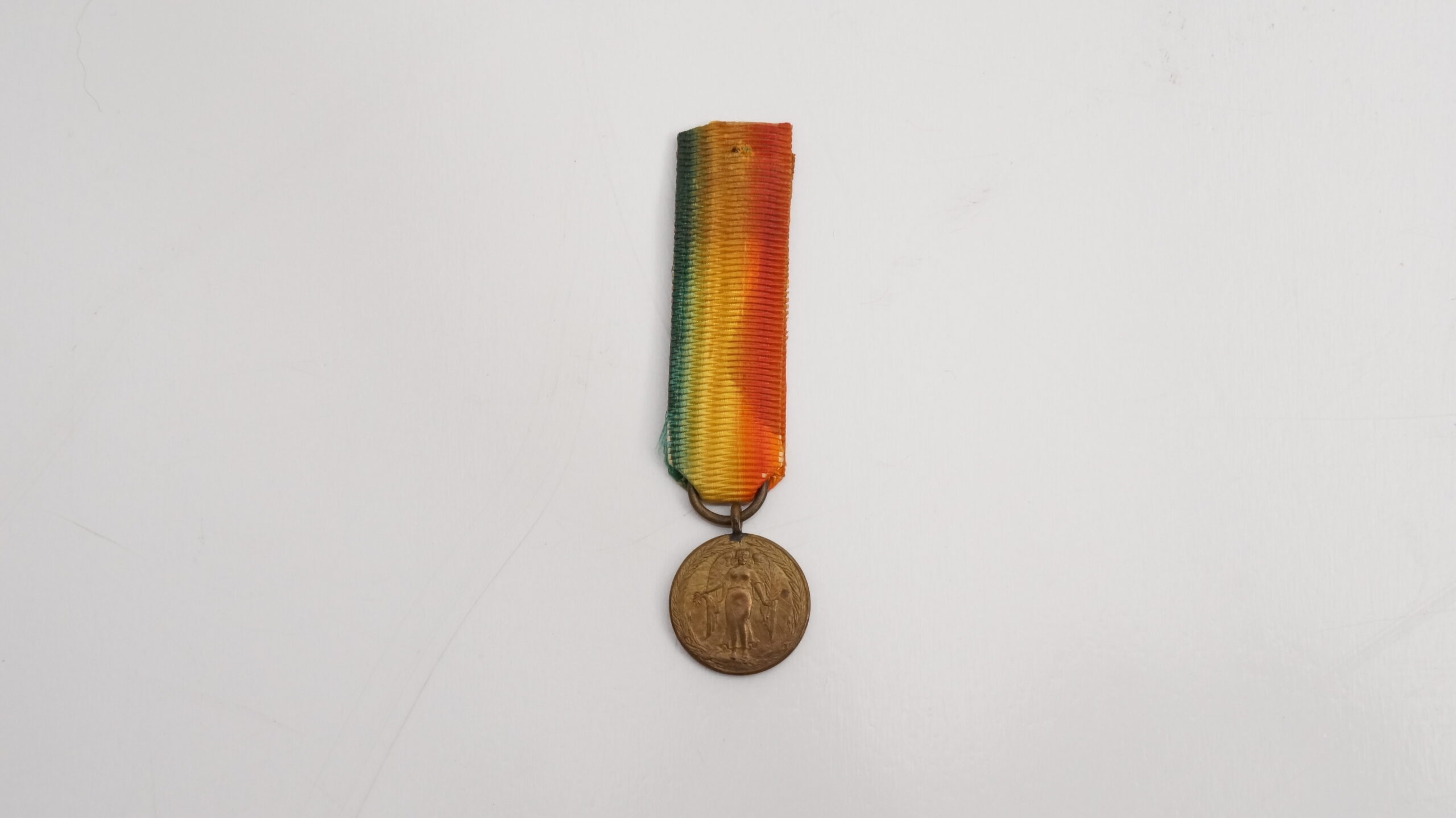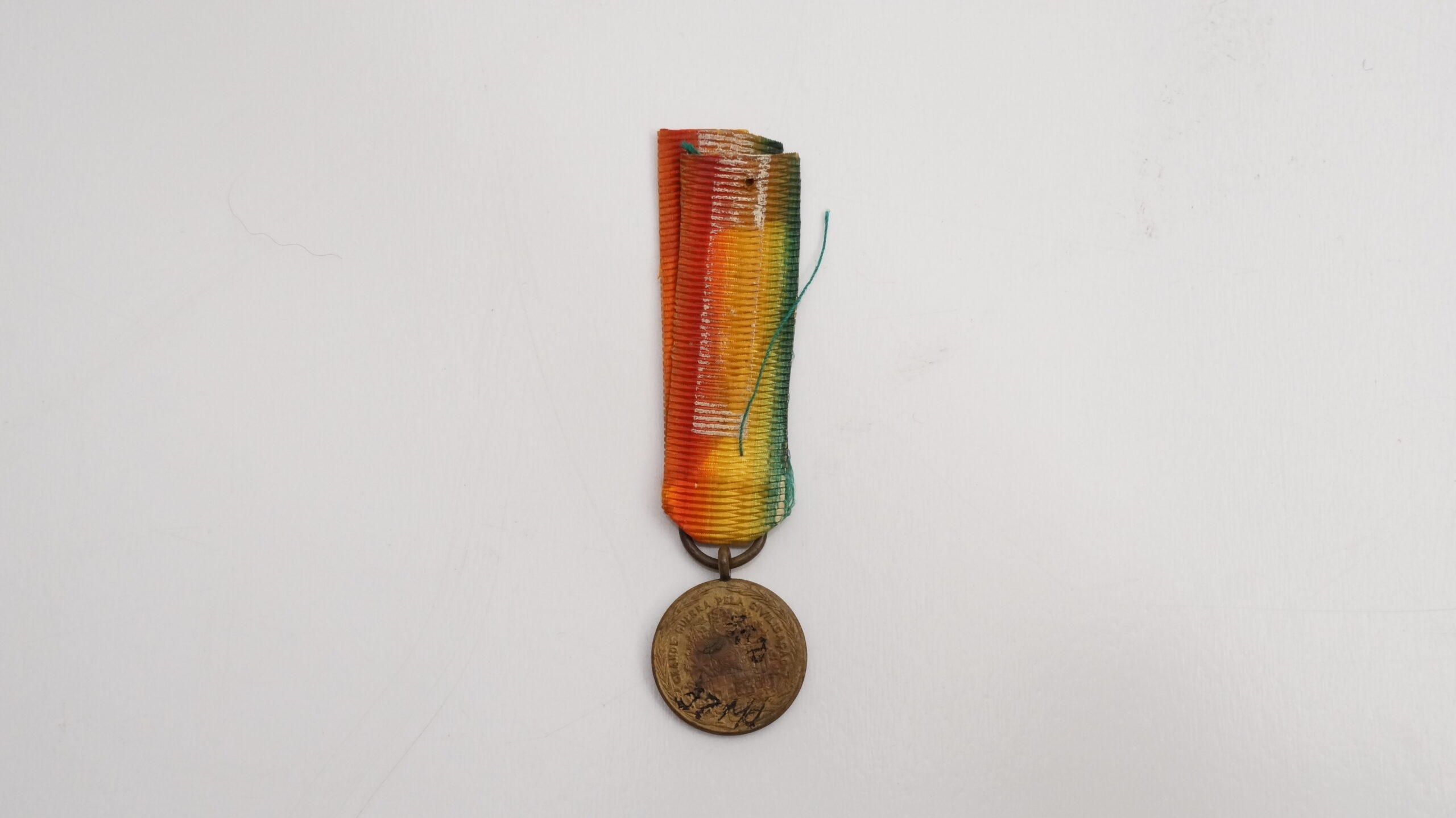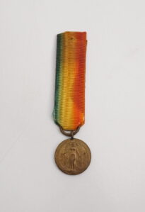 Medalha em formato circular, contornada por duas palmas. No anverso, ao centro, aparece a figura mitológica da Vitória Alada, de pé e de frente, sobre campo com raios oblíquos em baixo‑relevo; a orla segue em planete. No reverso, inscrição GRANDE GUERRA PELA CIVILIZAÇÃO, com o escudo nacional contornado pelos escudos das nações Aliadas e Associadas. A miniatura segue transpassada por fita presa a uma alça ligada diretamente ao olho da peça, com cores verde, amarelo e vermelho em degradê, diferindo da medalha de tamanho normal, que apresenta todas as cores do arco‑íris.