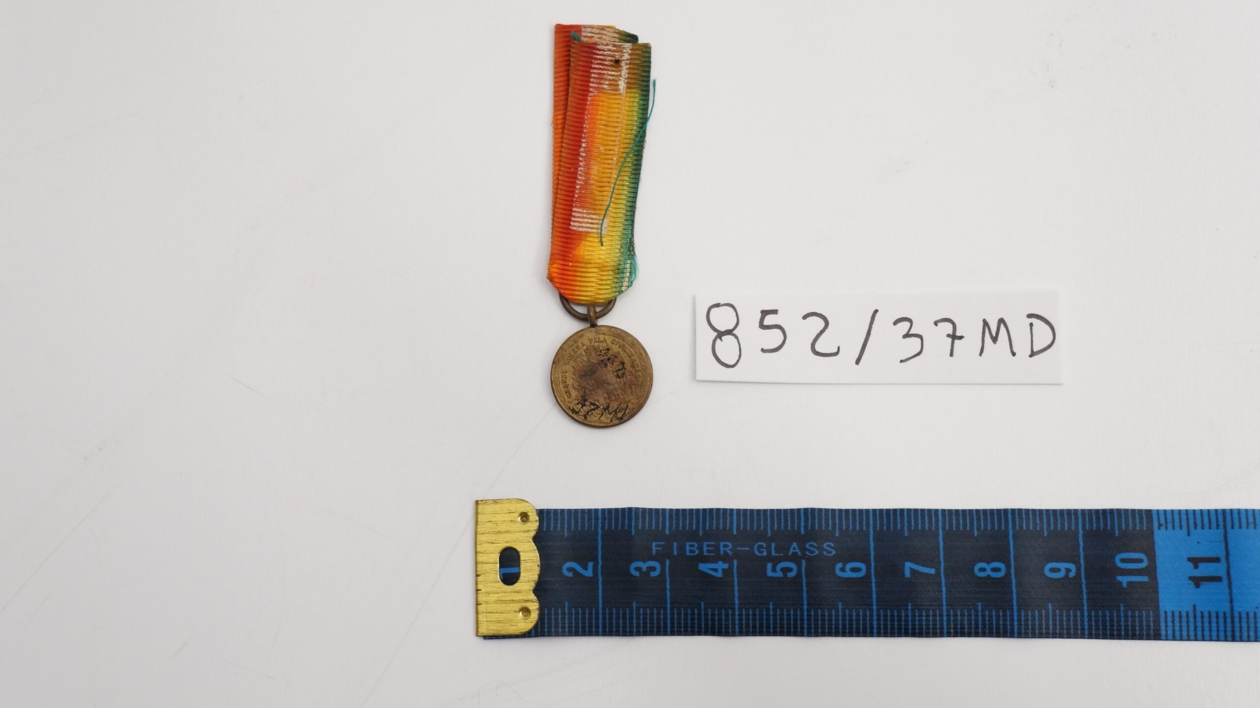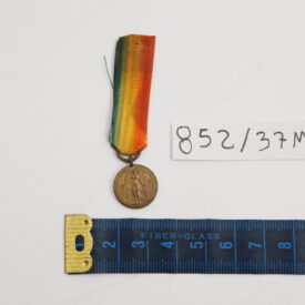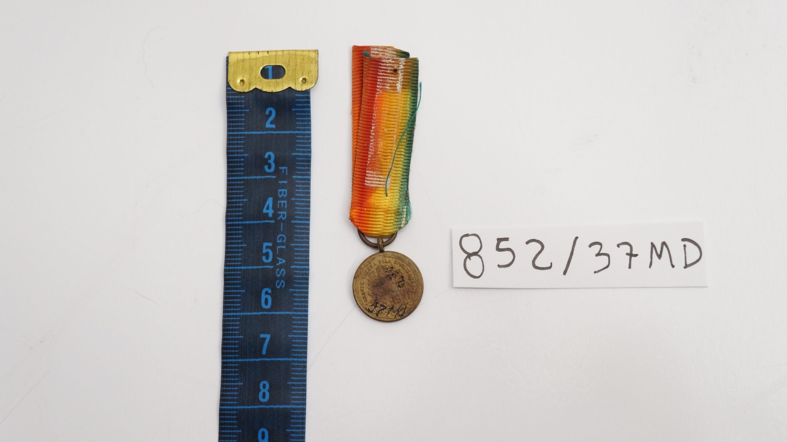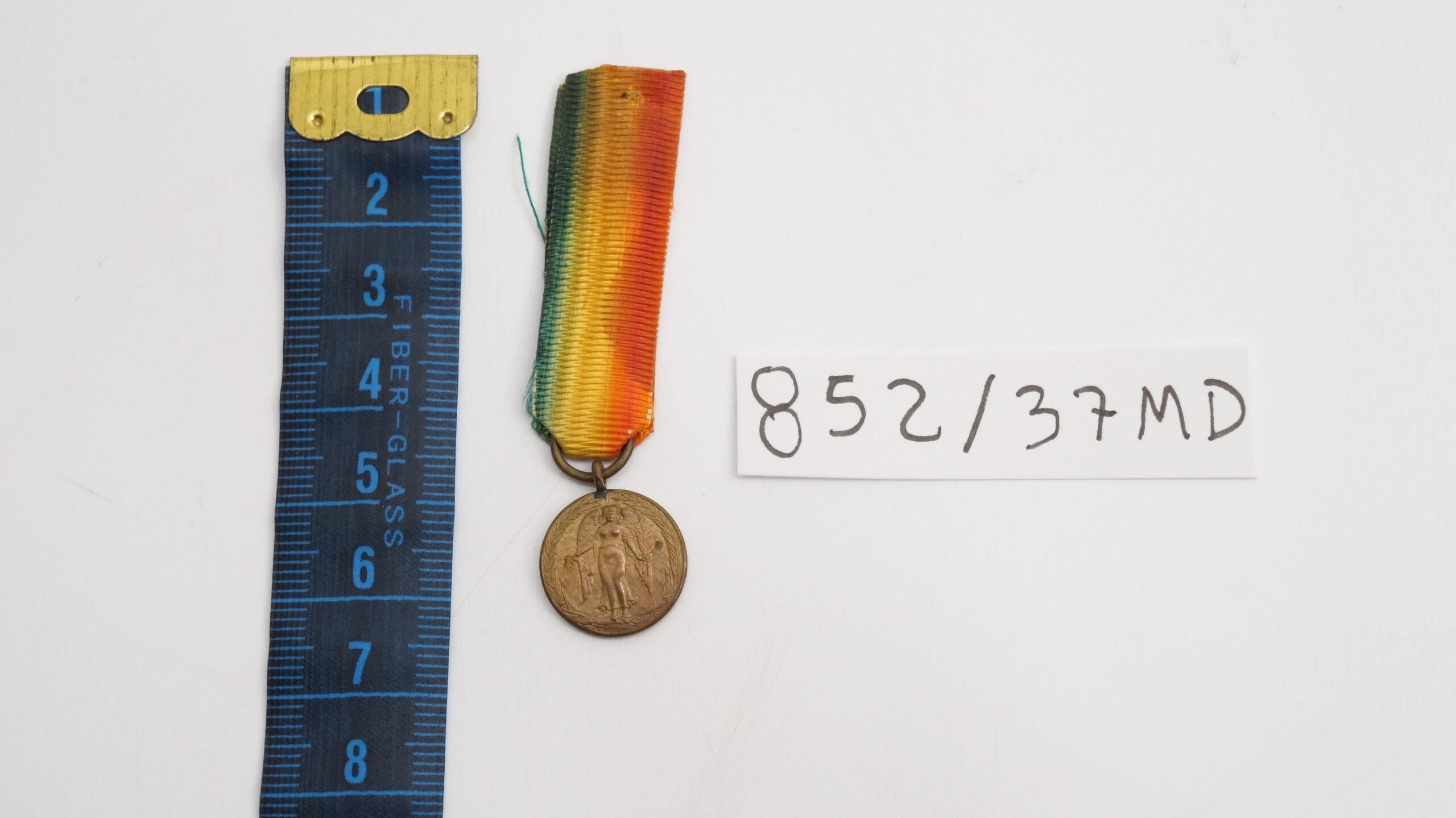 Medalha em formato circular, contornada por duas palmas. No anverso, ao centro, aparece a figura mitológica da Vitória Alada, de pé e de frente, sobre campo com raios oblíquos em baixo‑relevo; a orla segue em planete. No reverso, inscrição GRANDE GUERRA PELA CIVILIZAÇÃO, com o escudo nacional contornado pelos escudos das nações Aliadas e Associadas. A miniatura segue transpassada por fita presa a uma alça ligada diretamente ao olho da peça, com cores verde, amarelo e vermelho em degradê, diferindo da medalha de tamanho normal, que apresenta todas as cores do arco‑íris.