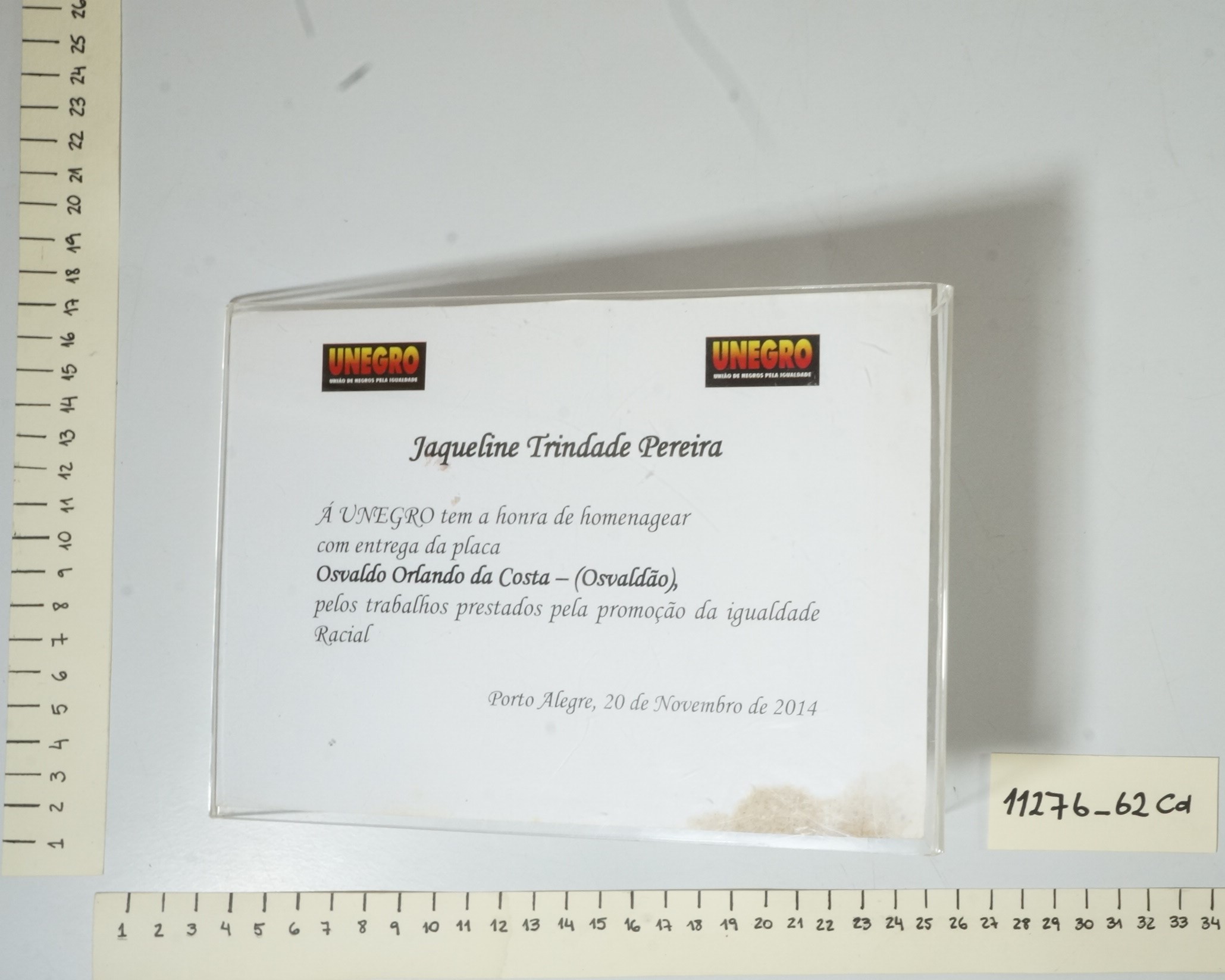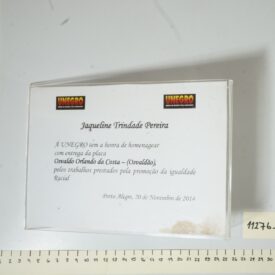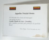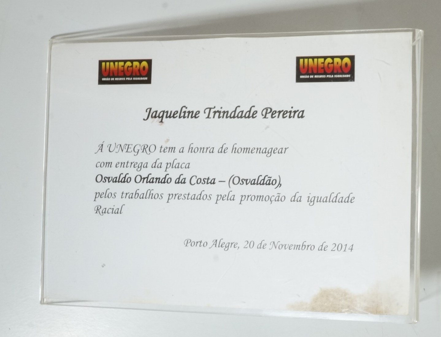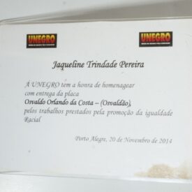 Papel canson com logos do Unegro - União de Negros pela igualdade, onde se lê Jaqueline Trindade Pereira, a UNESCO tem a honra de homenagear com entrega da placa Osvaldo Orlando da Costa - (Osvaldão), pelos trabalhos prestados pela promoção da igualdade racial. Porto Alegre, 20 de novembro de 2014.