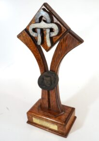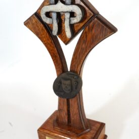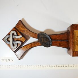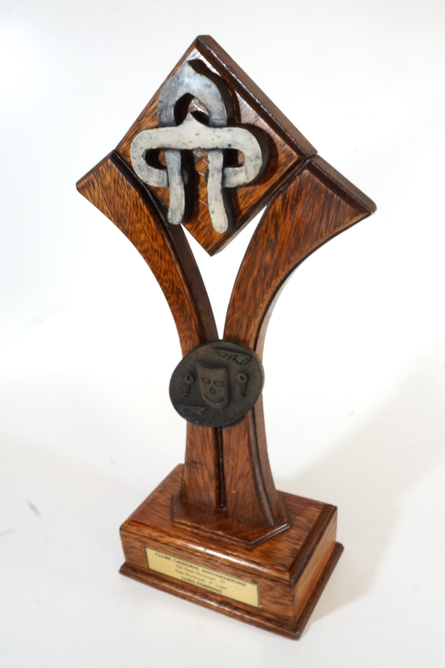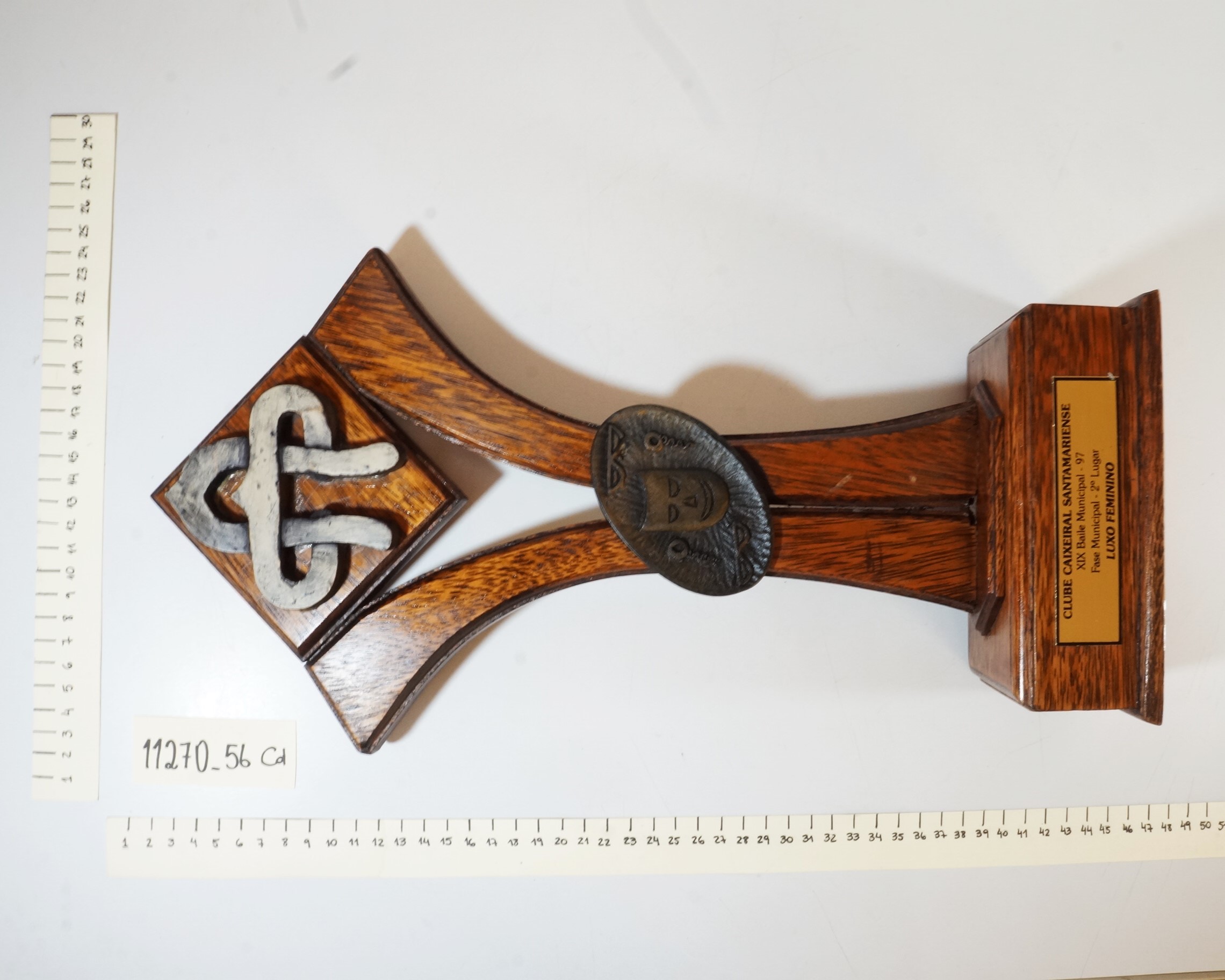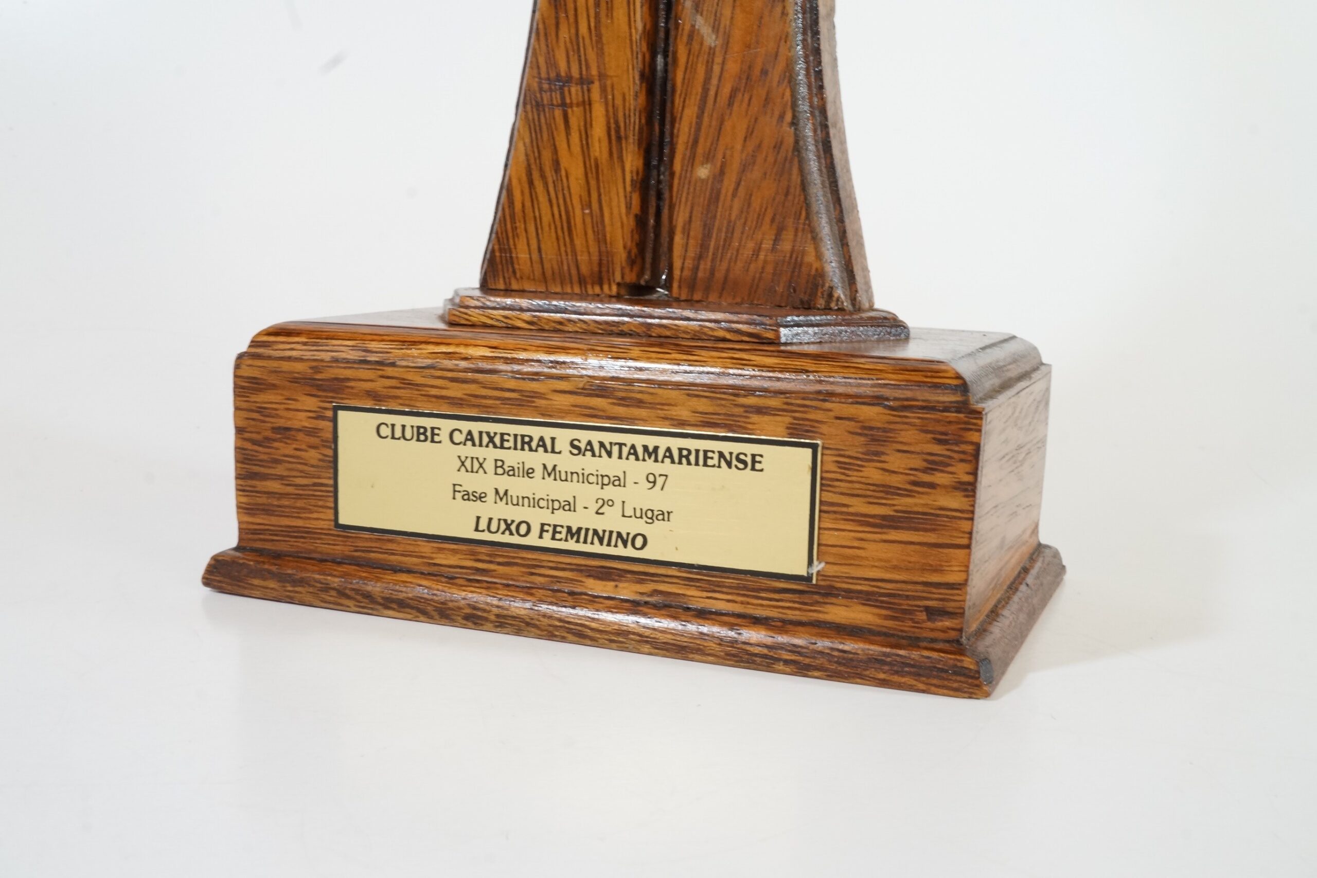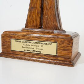Objeto de madeira com base retangular em que consta uma placa dourada, onde se lê Clube Santamariense. XIX Baile Municipal - 98. Fase Municipal - 2º lugar. Luxo Feminino.
