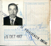 Papel cartão frente e verso branco com fundo padrão azul com as letras I N P S acompanhado de capa plástica. Na frente superior do cartão há escrito em azul “INSTITUTO NACIONAL DE PREVIDÊNCIA SOCIAL” “CARTÃO DE PAGAMENTO DE BENEFÍCIO” ao centro do papel há duas caixas com os itens “ORGÃO LOCAL” e “ESPÉCIE E NB”e datilografado respectivamente “19 – 37” e “ 41 799”, a baixo há o campo “RECEBEDOR” e datilografado “PLINIO IBARRA”. No verso o esquerdo grampeado há uma fotografia sépia 3/4 de uma figura masculina idosa com cabelos escuros, bigode grisalho, terno e gravata. Ao lado da foto há um quadrado com o item “IMPRESSÃO DIGITAL” não preenchido, abaixo há a assinatura de Plinio Ibarra e abaixo há uma tabela “ORGÃO EMISSOR” com dois itens “DATA E RUBRICA” carimbado com “19 DEZ 1967” e uma rubrica ilegível. Há um carimbo “INSTITUTO NACIONAL DE PREVIDÊNCIA SOCIAL” que passa diagonalmente sobre a parte inferior da fotografia e o papel. O papel apresenta sujidades junto ao lado esquerdo onde ficava para fora da capa plástica, mas não apresenta rasgos, furos ou perdas.