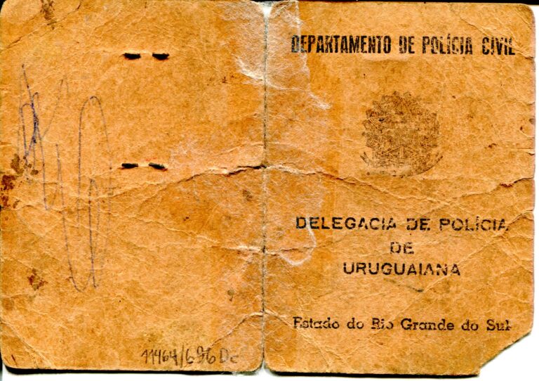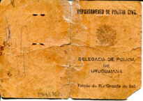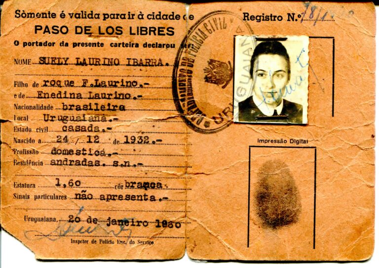 Carteira de identificação na cor laranja. A capa possui na parte superior escrito “DEPARTAMENTO DE POLÍCIA CIVIL”. ao centro há o brasão da republica federativa do Brasil e abaixo continua “ DELEGACIA DE POLÍCIA DE URUGUAIANA, Estado do Rio Grande do Sul”. Internamente ao lado esquerdo há escrito na parte superior “ Somente é valida para ir à cidade de PASO DE LOS LIBRES, O portador da presente carteira declarou ser:” abaixo há os itens impressos e datilografado respectivamente “ Nome: SUELY LAURINO IBARRA. Filho de: roque F. Laurino. – e de Enedina Laurino.-, Nacionalidade: Brasileira , Local: Uruguaiana.-, Estado civil: casada.-, Nascido a: 24/12 de 1932.-, Profissão domestica.-, Residência: Andradas. S. n.-, Estatura: 1,60 Côr branca, Sinais Particulares: não apresenta.-, Uruguaiana, 20 de janeiro de 1960. [assinatura ilegível] Inspetor de Polícia Enc. Do Serviço”. Ao lado direito há o Numero de Registro “78/1[ilegível]”, uma foto 3/4 grampeada de uma figura feminina com cabelo escuro para trás, sobrancelhas grossas e sorrindo, utilizando roupa escura e um colarinho branco, abaixo há o campo de Impressão Digital preenchido com uma impressão digital. Há um carimbo que se sobrepõe à foto escrito “DEPARTAMENTO DE POLÍCIA CIVIL URUGUAIANA” ao centro do carimbo há o brasão do Rio Grande do Sul. Sobre a foto há uma assinatura ilegível em caneta azul clara. A carteira possui diversos rasgos nas bordas, principalmente no lado direito da capa, com um pedaço faltando da ponta inferior direita. O centro da carteira está rasgando e há falhas (possivelmente por contanto com líquidos) nos dois locais escritos com caneta (assinatura do inspetor e número de registro). No verso da capa há riscos em caneta e manchas de sujidades.