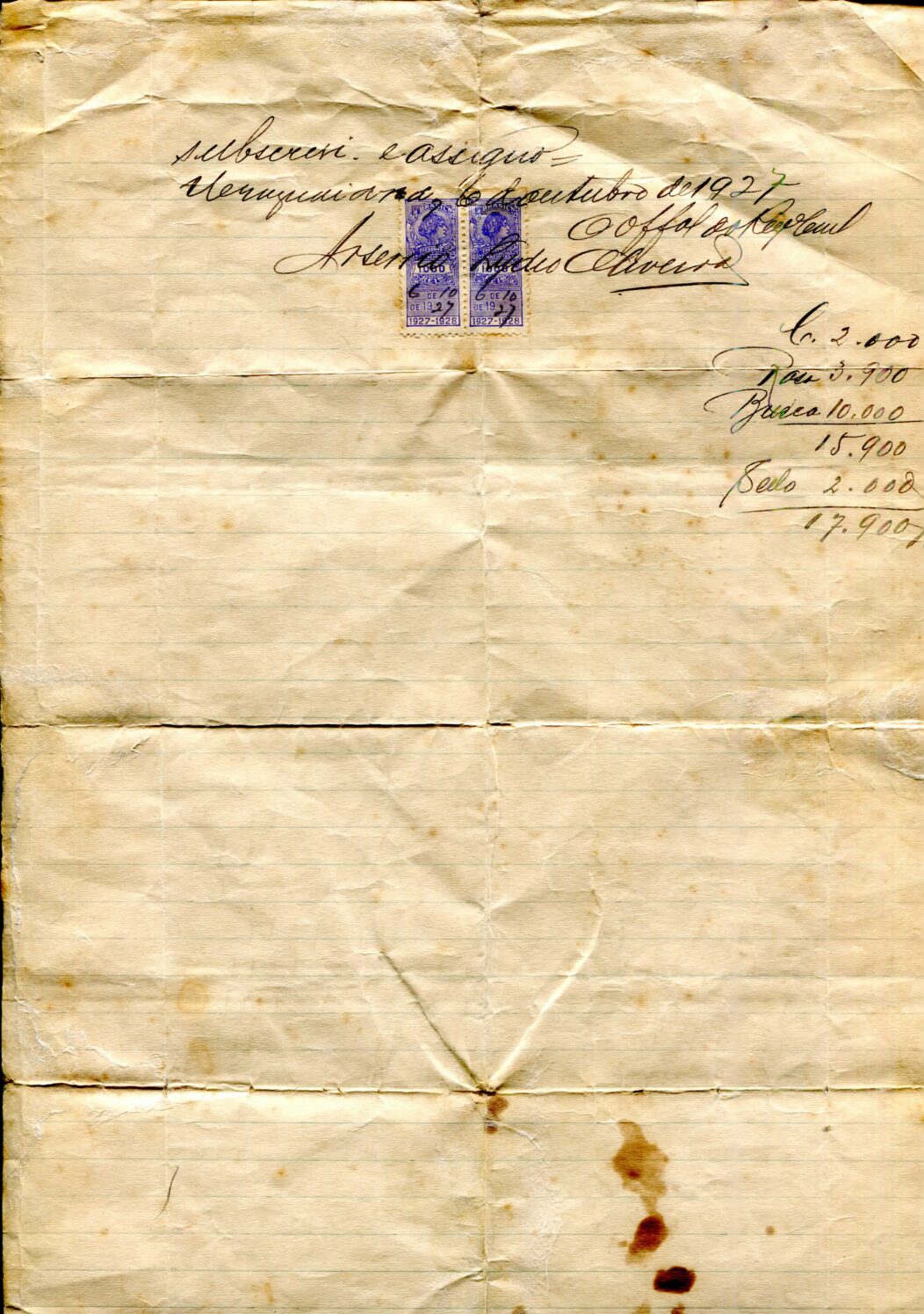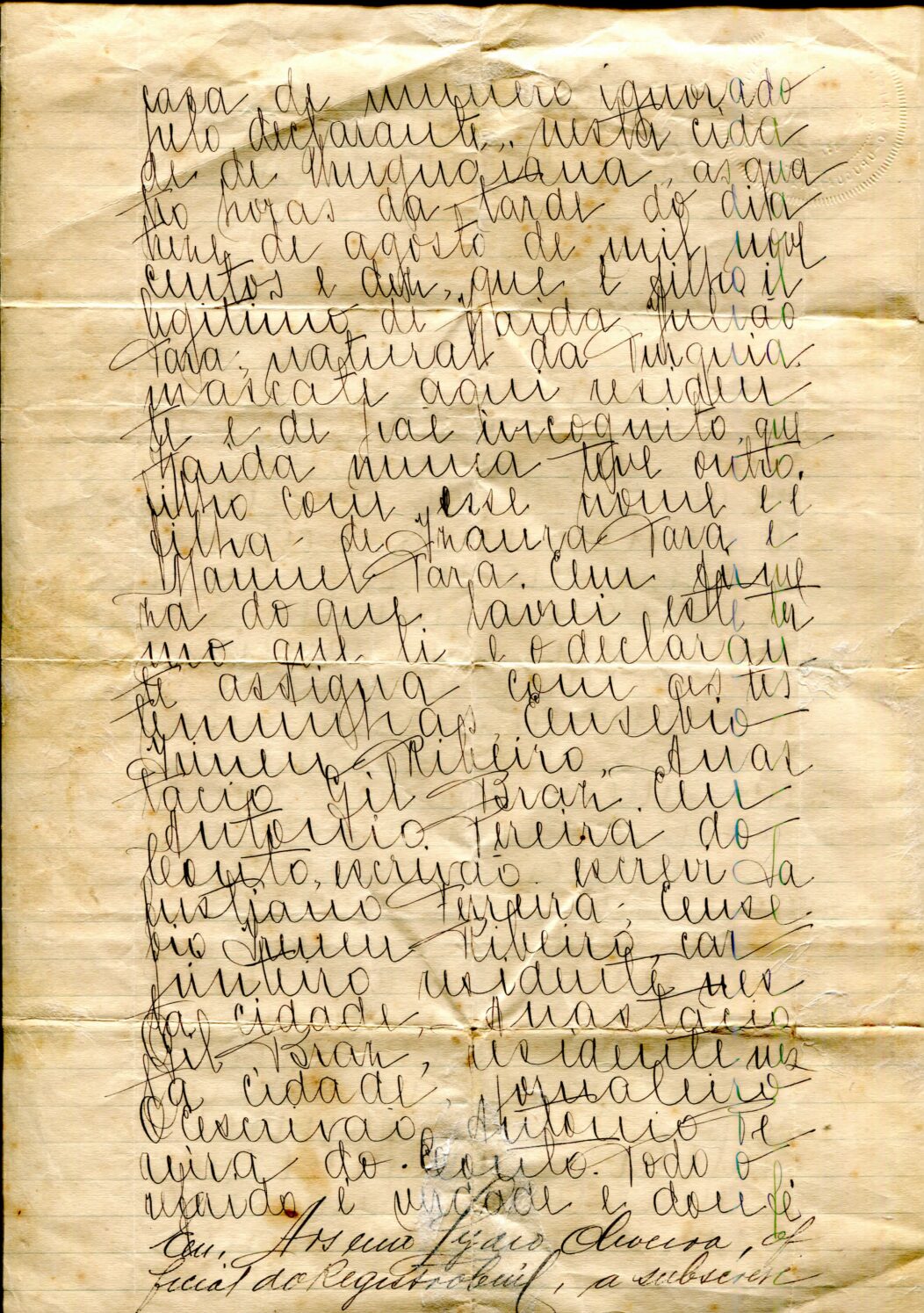 Certidão de nascimento em papel escrito há caneta. O cabeçalho possui escrito “Arcenio Lydio Oliveira Escrivão de Casamentos e Official do Registro Civil do 1º Distrito de Uruguaiana”; ao lado esquerdo possui uma chancela em alto relevo do cartório. O documento certifica o nascimento de Luiz Manuel Falcão Botafogo em 13 de agosto de 1910, registrado pelo pai Salustiano Ferreira, carpinteiro residente de Uruguaiana, e filho ilegítimo de Haida Julião Tara, natural da Turquia. No fim do documento, há a citação das testemunhas do documento Eusebio Yrineu Ribeiro, Anastacio Gil Braz e Elis Antonio Pereira do Couto. Na segunda página, há a data de assinatura do documento “Uruguaiana, 6 de outubro de 1927” e dois selos de mil réis. Ao lado direito, há uma conta dos valores a serem pagos pelo serviço do cartório, com resultado de 17,900 réis. O documento foi dobrado em oito partes, assim criando ranhuras e rasgos nas bordas, possui furos ao centro na ligação das duas folhas, ao lado direito da conta e na parte inferior central da segunda pagina.
