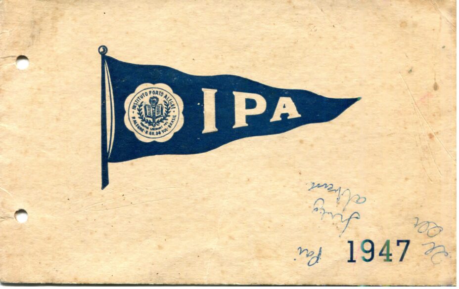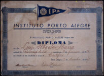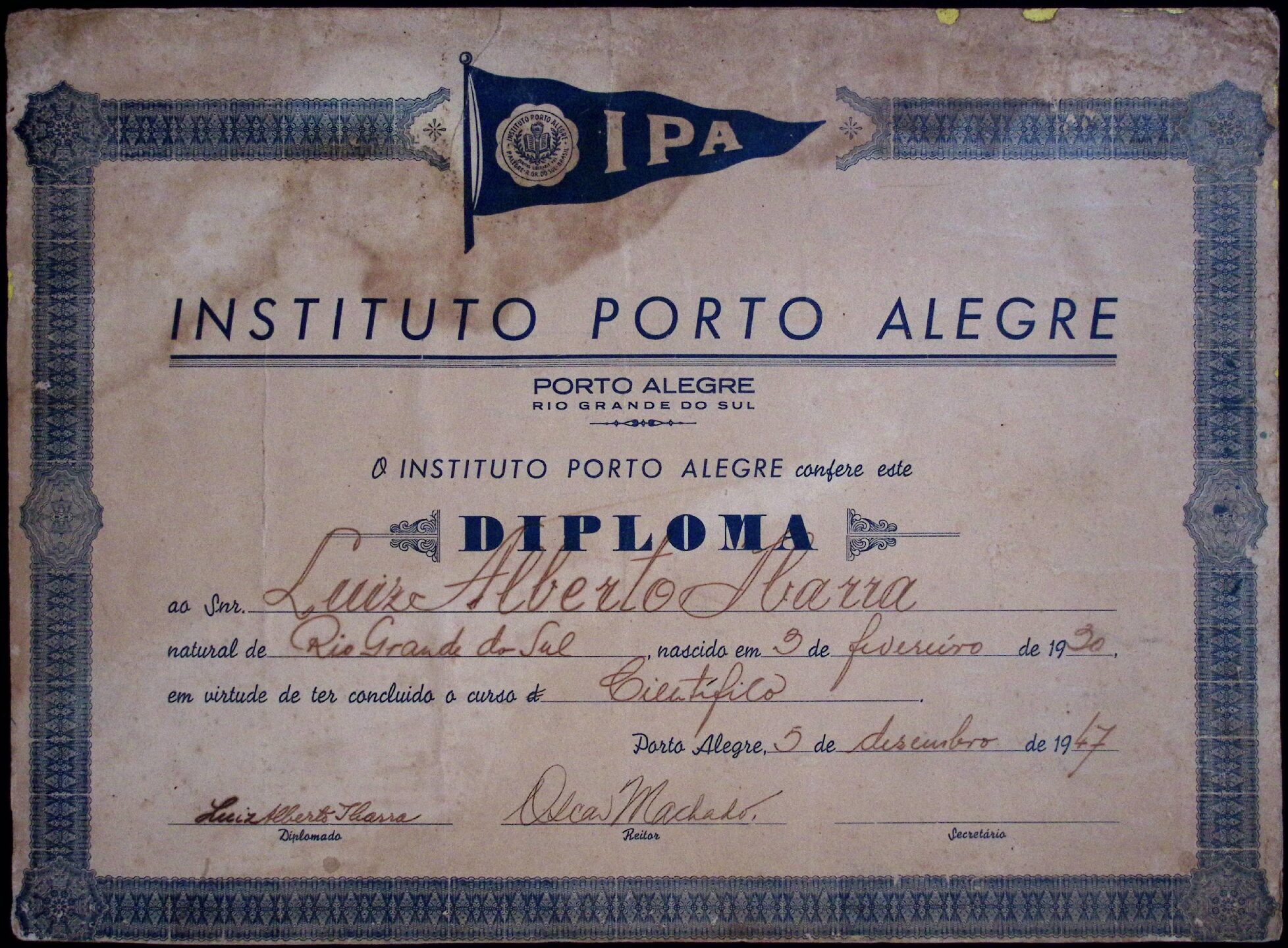 Diploma de conclusão de curso científico do Instituto Porto Alegre em papelão colado em eucatex e convite em papel de Luiz Alberto Ibarra. O diploma em papel possui borda azul com detalhes nas pontas e ao centro (lado esquerdo e lado direito) com o simbolo do IPA, uma bandeirola azul com o brasão da instituição e a sigla IPA, ao centro. Possui data de 5 de dezembro de 1947. O diploma foi colado a um eucatex de mesmo tamanho, na parte superior há dois rasgos onde é possível ver o fundo amarelo do eucatex. O convite possui capa em papelão com o símbolo da bandeirola azul com o brasão da instituição e a sigla IPA e ao canto inferior direito “1947”, dentro há três folhas, uma pagina de agradecimentos e as datas da solenidade ofício de Ação de Graças em 30 de novembro e a solenidade de formatura em 5 de dezembro, uma página com os nomes dos paraninfos e homenageados, e uma página  com o nome dos formandos. No verso das folhas de homenageados e alunos há as assinaturas dos mesmos. O diploma possui rasgos na parte superior e no lado esquerdo, uma mancha sobre a bandeirola e sujidades no entorno da borda, no verso há restos de papel colados nas bordas e marcas de oxidação, provavelmente o diploma era armazenado enquadrado. O convite está amarelado e possui manchas de foxing, há escritos em caneta azul em volta da data na capa “Pai” e quatro [ilegíveis].