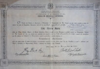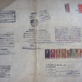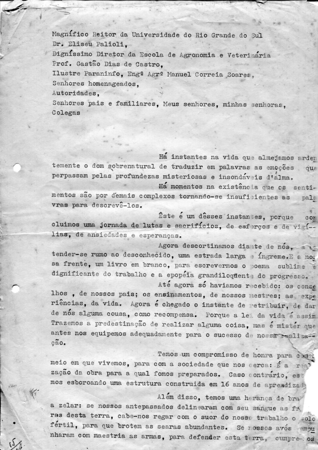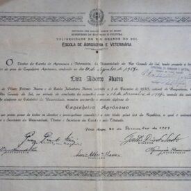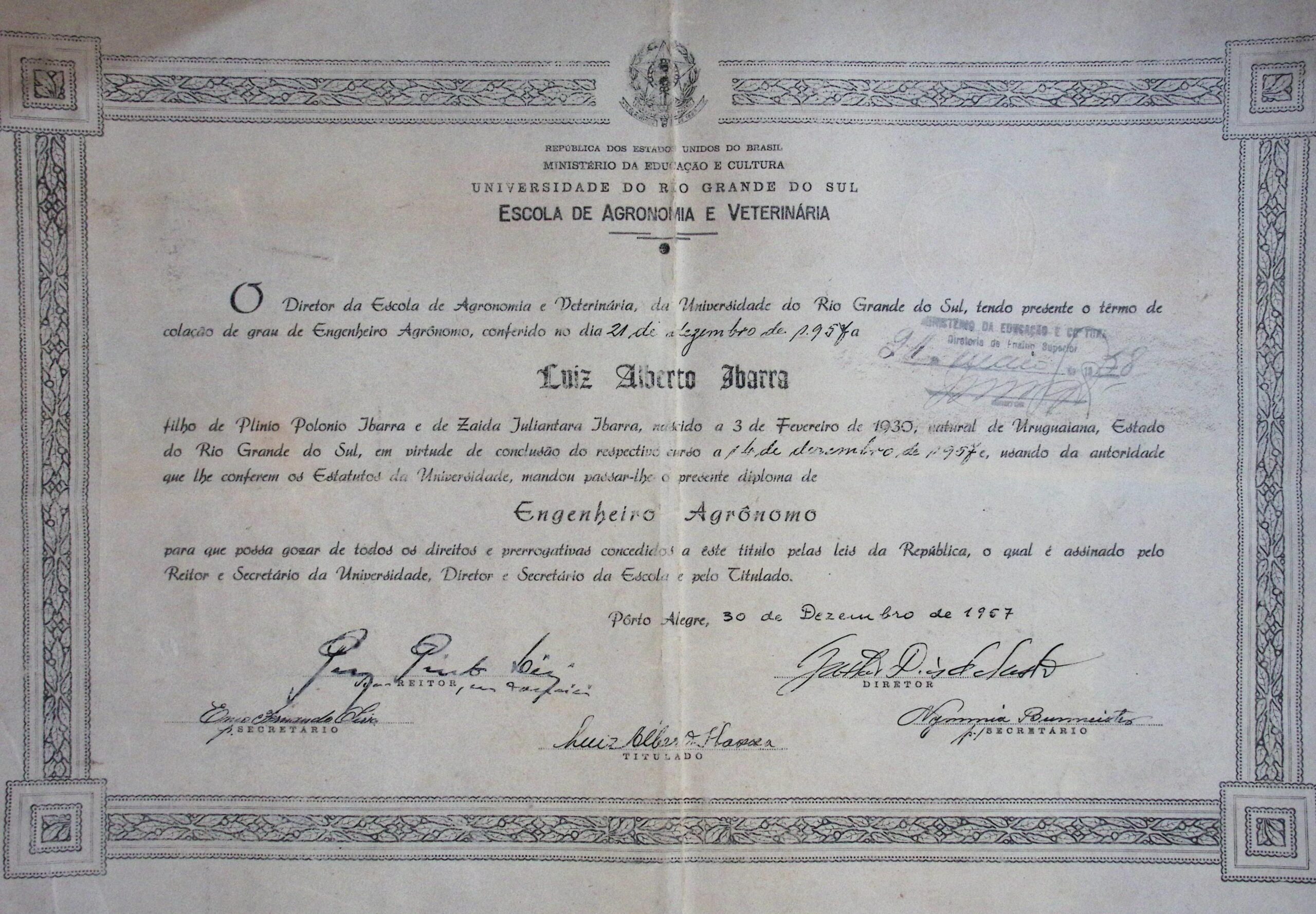 Diploma de Engenheiro Agrônomo de Luiz Alberto Ibarra em papelão branco e seis páginas datilografadas do discurso de formatura. O diploma possui borda preta com detalhes em folhas e quatro quadrados, um em cada canto da borda. Ao centro acima há o brasão da república federativa do Brasil, abaixo escrito “REPUBLICA DOS ESTADOS UNIDOS DO BRASIL, MINISTÉRIO DA EDUCAÇÃO E CULTURA, UNIVERSIDADE DO RIO GRANDE DO SUL, ESCOLA DE AGRONOMIA E VETERINÁRIA”, com a data de colação de grau de 21 de dezembro de 1957 e assinado no dia 30 de dezembro de 1957. No verso há 13 selos carimbados no lado direito e sete carimbos “universidade do Rio Grande do Sul Escola de Agronomia e Veterinária” “MINISTÉRIO DA EDUCAÇÃO E CULTURA Diretoria do Ensino Superior” “MINISTÉRIO DA AGRICULTURA, SUPERINTENDÊNCIA DO ENSINO AGRÍCOLA E VETERINÁRIO” “MINISTÉRIO DA EDUCAÇÃO E CULTURA, UNIVERSIDADE DO RIO GRANDE DO SUL, DEPARTAMENTO DE EDUCAÇÃO E ENSINO” “5º TABELIONATO Pôrto Alegre” “13º OFÍCIO Rio de Janeiro” e “VERSA FISCAL”. O discurso é composto por seis páginas datilografadas com perfurações para pasta Z, o cabeçalho possui escrito “Magnífico Reitor da Universidade do Rio Grande do Sul Dr. Eliseu Palioli, Digníssimo Diretor da Escola de Agronomia e Veterinária Prof. Gastão Dias de Castro, Ilustre Paraninfo, Engº Agrº Manuel Correia Soares, Senhores homenageados, Autoridades, Senhores pais e familiares, Meus senhores, minhas senhoras, Colegas”, há uma anotação em caneta azul no canto inferior esquerdo da primeira folha “15 / MS”.