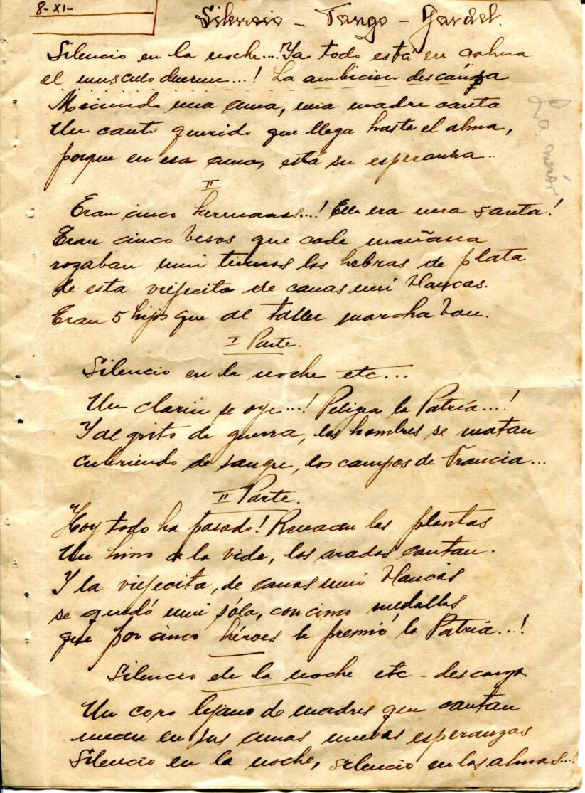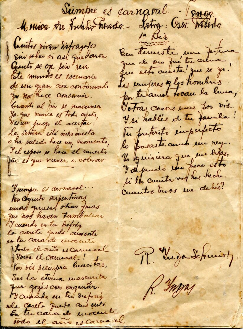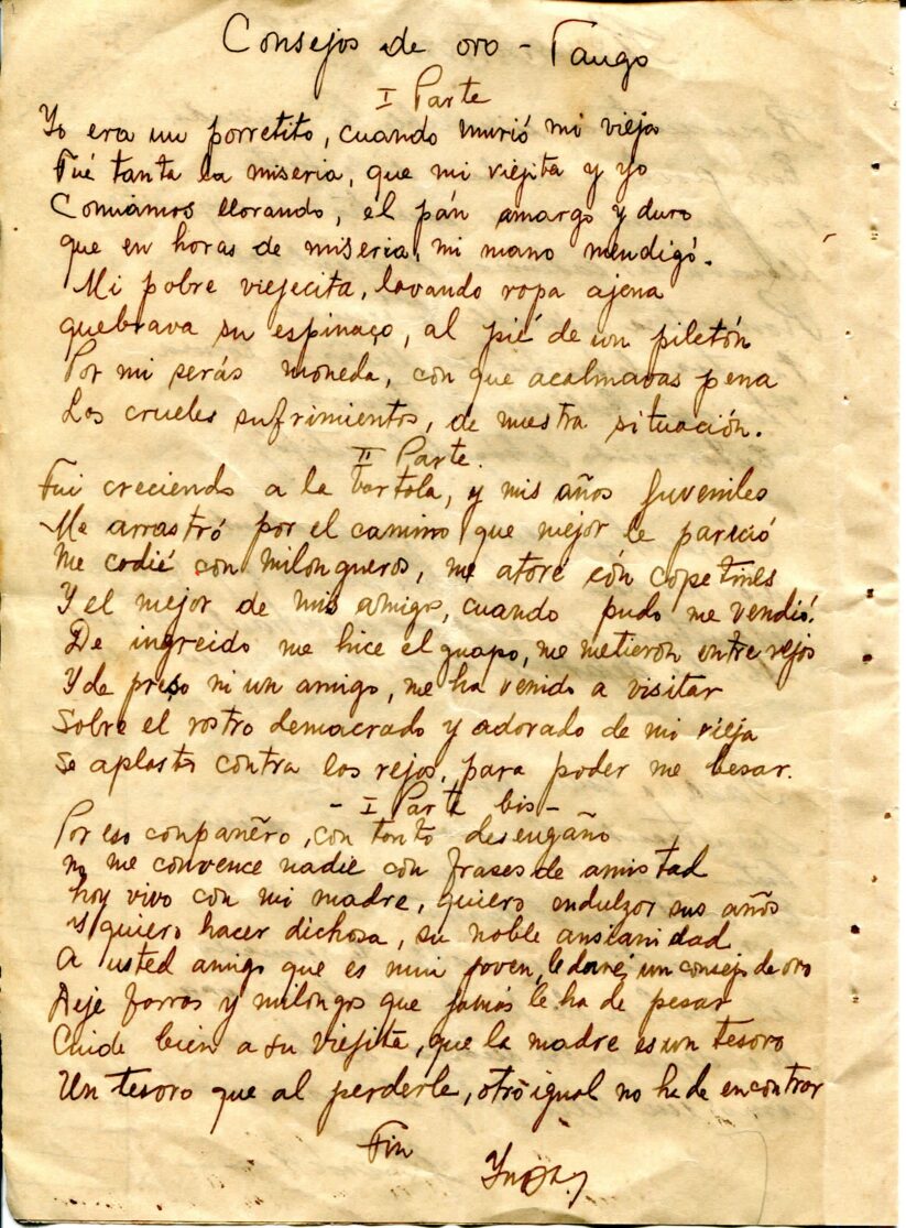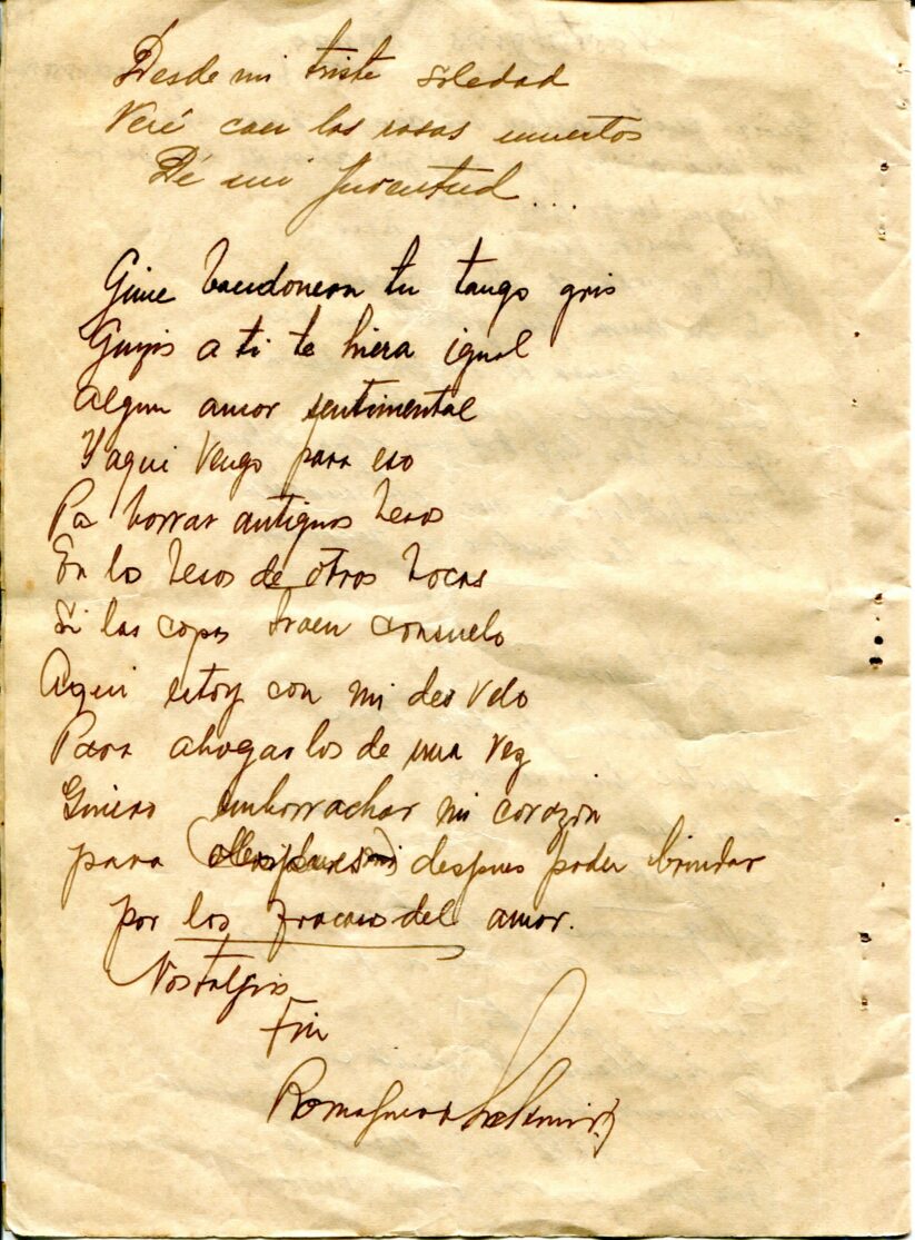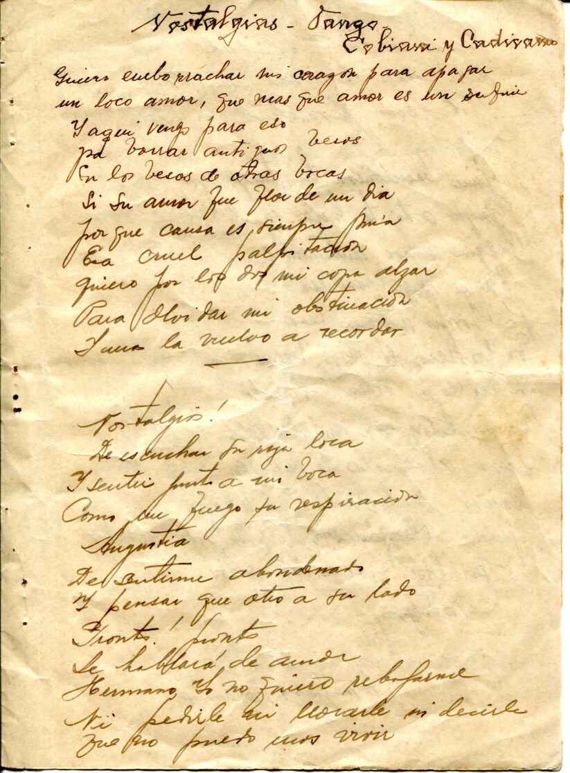 Caderno composto por seis folhas soltas grampeadas contendo 13 letras de tango. As letras possuem os títulos “Siempre es Carnaval, Desaliento – Tango, Dime que si, Silencio – Tango – Gardel, Romantica – 8 vls, Consejos de Oro – Tango, Madreselva – Tango, Indiferencia – Tango, Vendrás Alguma Vez, Nostalgias, Melodia de Arrabal, Rancho Grande, [Luna de] Arrabal”. Os papéis estão amarelados, possuem furos e oxidação dos grampos ao lado esquerdo. A primeira folha (capa e contra capa) está rasgada e a ultima folha [Luna de] Arrabal possui diversos furos ao centro e uma parte faltante da página no canto superior esquerdo (assim perdido metade to título).