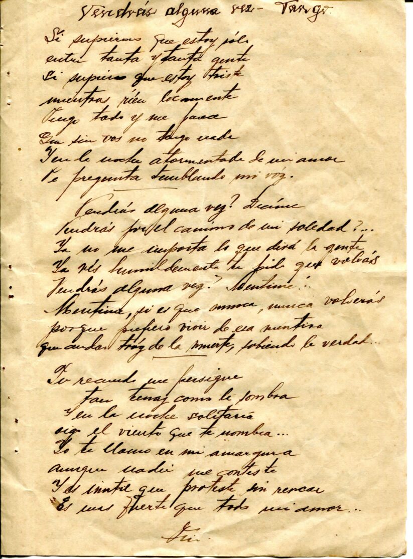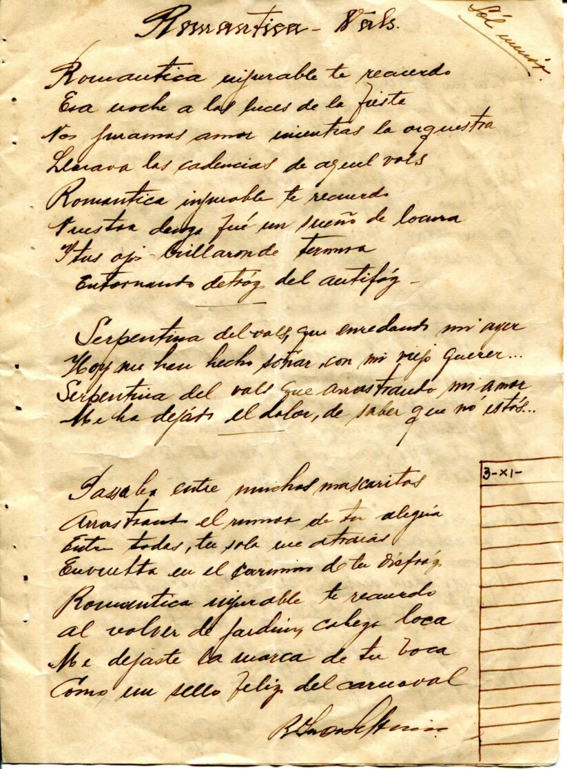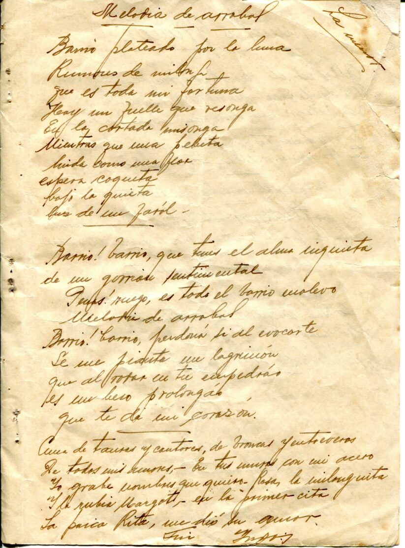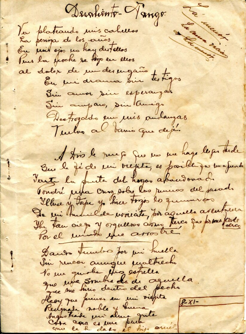 Caderno composto por seis folhas soltas grampeadas contendo 13 letras de tango. As letras possuem os títulos “Siempre es Carnaval, Desaliento – Tango, Dime que si, Silencio – Tango – Gardel, Romantica – 8 vls, Consejos de Oro – Tango, Madreselva – Tango, Indiferencia – Tango, Vendrás Alguma Vez, Nostalgias, Melodia de Arrabal, Rancho Grande, [Luna de] Arrabal”. Os papéis estão amarelados, possuem furos e oxidação dos grampos ao lado esquerdo. A primeira folha (capa e contra capa) está rasgada e a ultima folha [Luna de] Arrabal possui diversos furos ao centro e uma parte faltante da página no canto superior esquerdo (assim perdido metade to título).