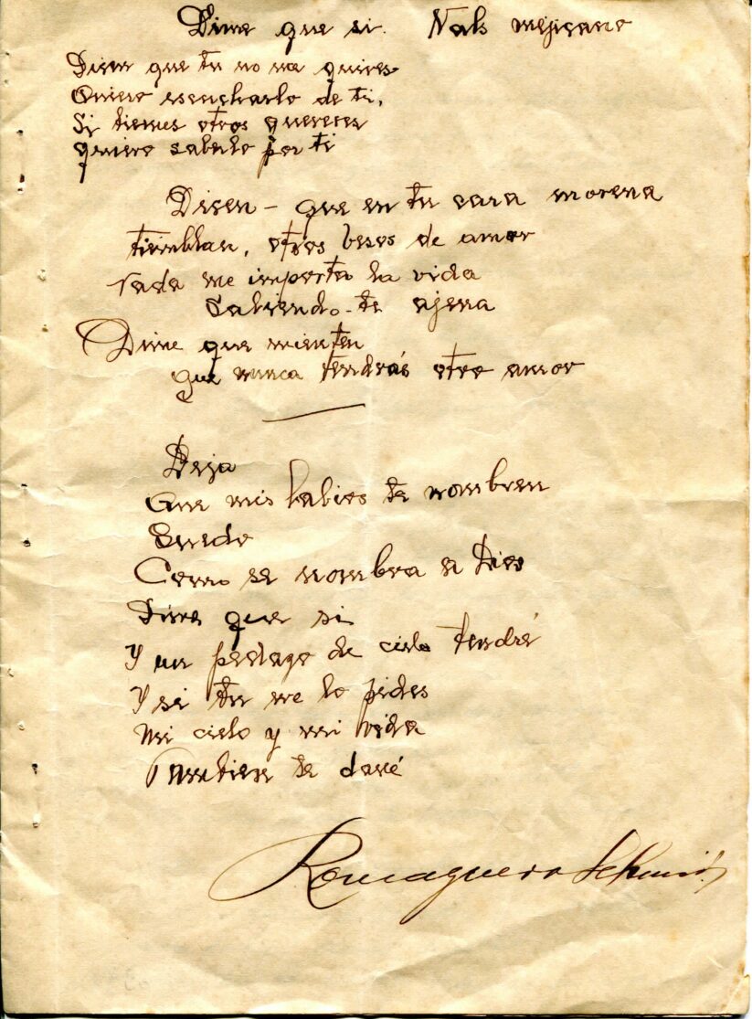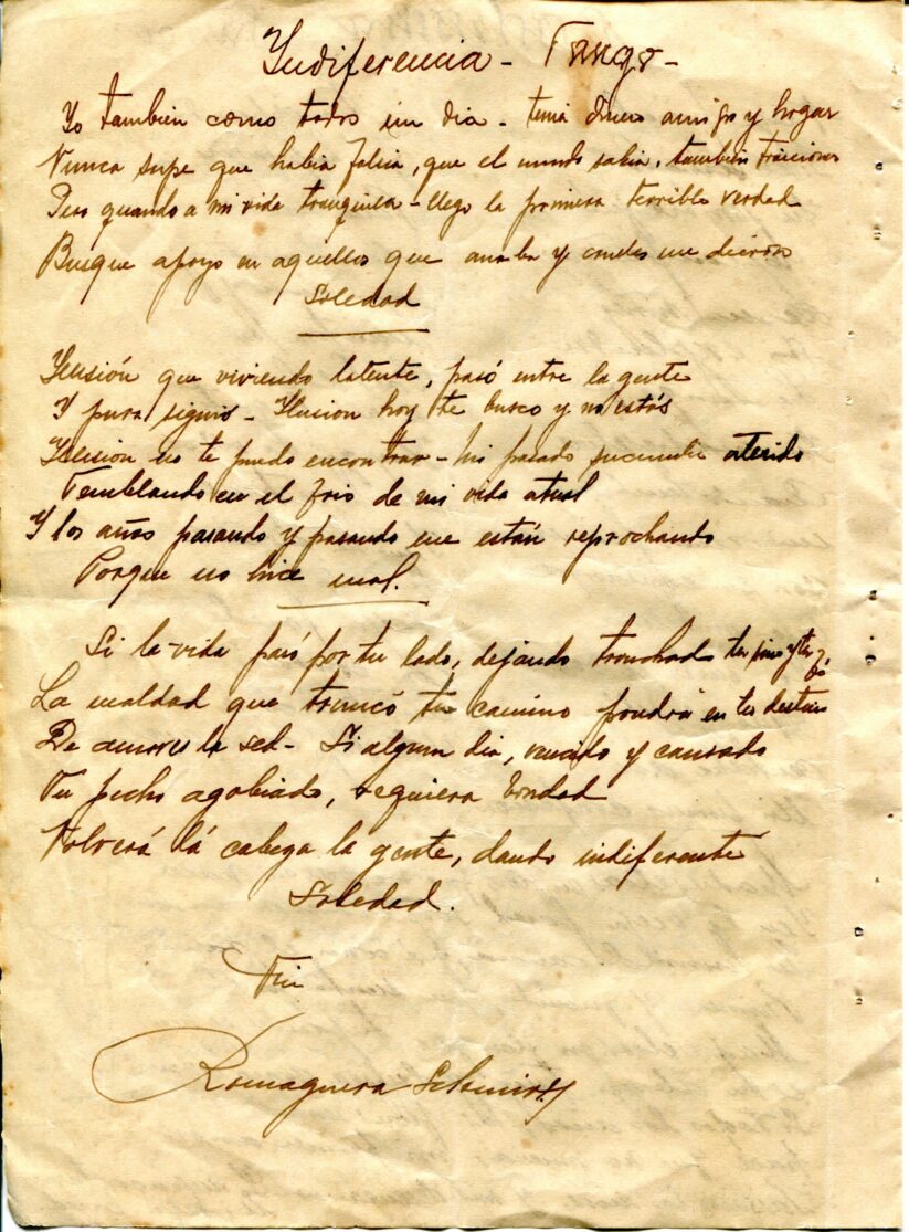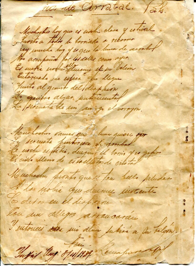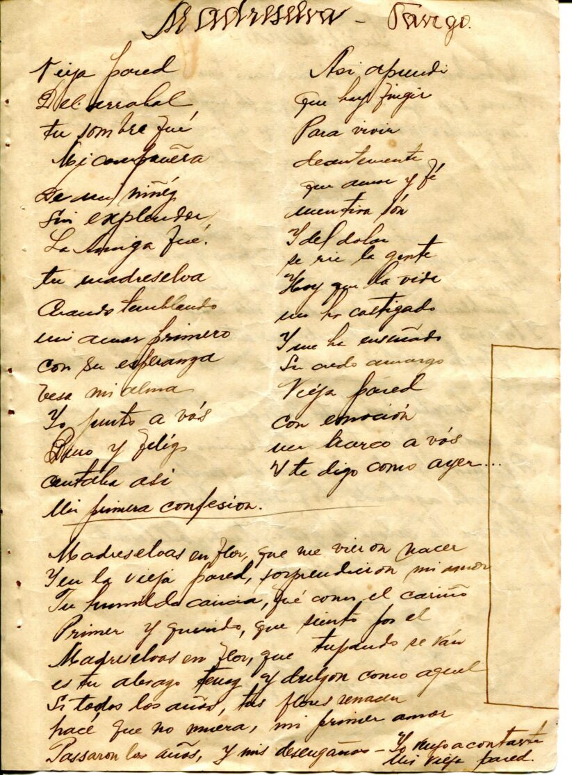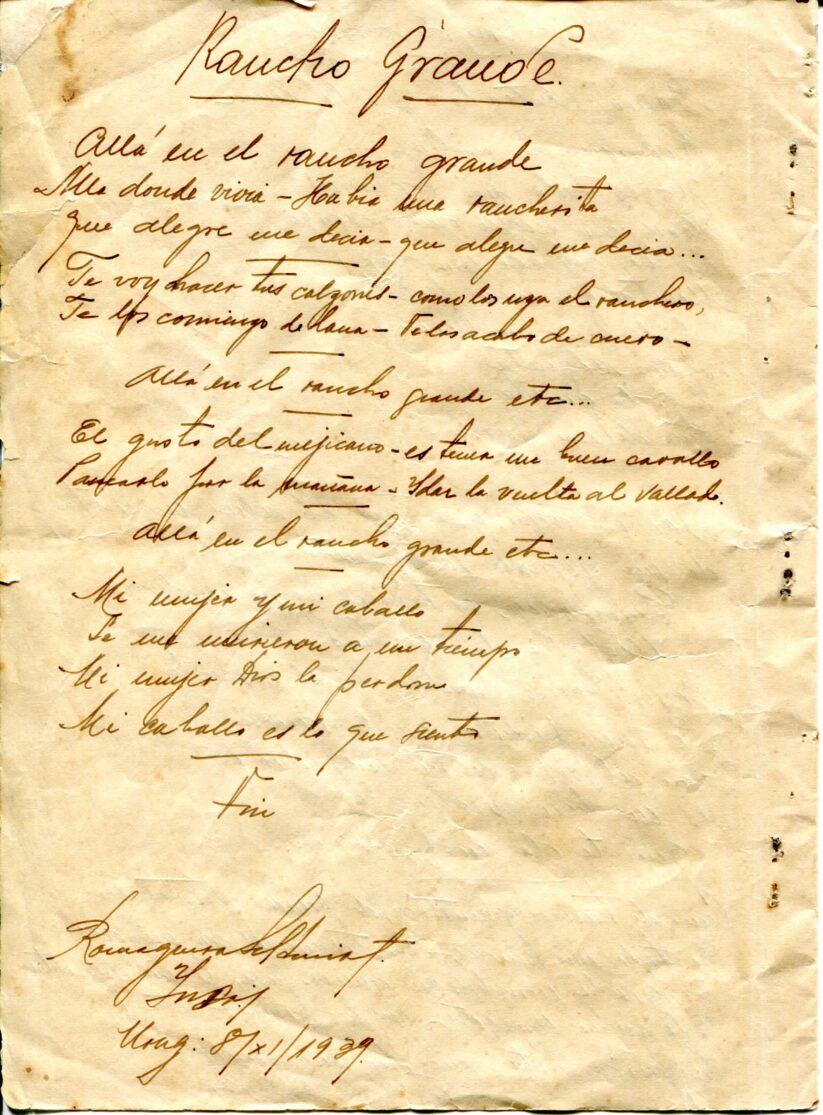 Caderno composto por seis folhas soltas grampeadas contendo 13 letras de tango. As letras possuem os títulos “Siempre es Carnaval, Desaliento – Tango, Dime que si, Silencio – Tango – Gardel, Romantica – 8 vls, Consejos de Oro – Tango, Madreselva – Tango, Indiferencia – Tango, Vendrás Alguma Vez, Nostalgias, Melodia de Arrabal, Rancho Grande, [Luna de] Arrabal”. Os papéis estão amarelados, possuem furos e oxidação dos grampos ao lado esquerdo. A primeira folha (capa e contra capa) está rasgada e a ultima folha [Luna de] Arrabal possui diversos furos ao centro e uma parte faltante da página no canto superior esquerdo (assim perdido metade to título).