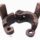 Dois semicírculos, um com as extremidades achatadas e perfuradas; e o outro com orifício em uma das extremidades e uma saliência em forma de conena na outra. Semicírculos interligados em uma das extremidades por meio de um pino que forma a dobradiça. Da parte central de cada um dos semicírculos, parte uma haste vertical que se divide na parte superior, formando pontas curvas.