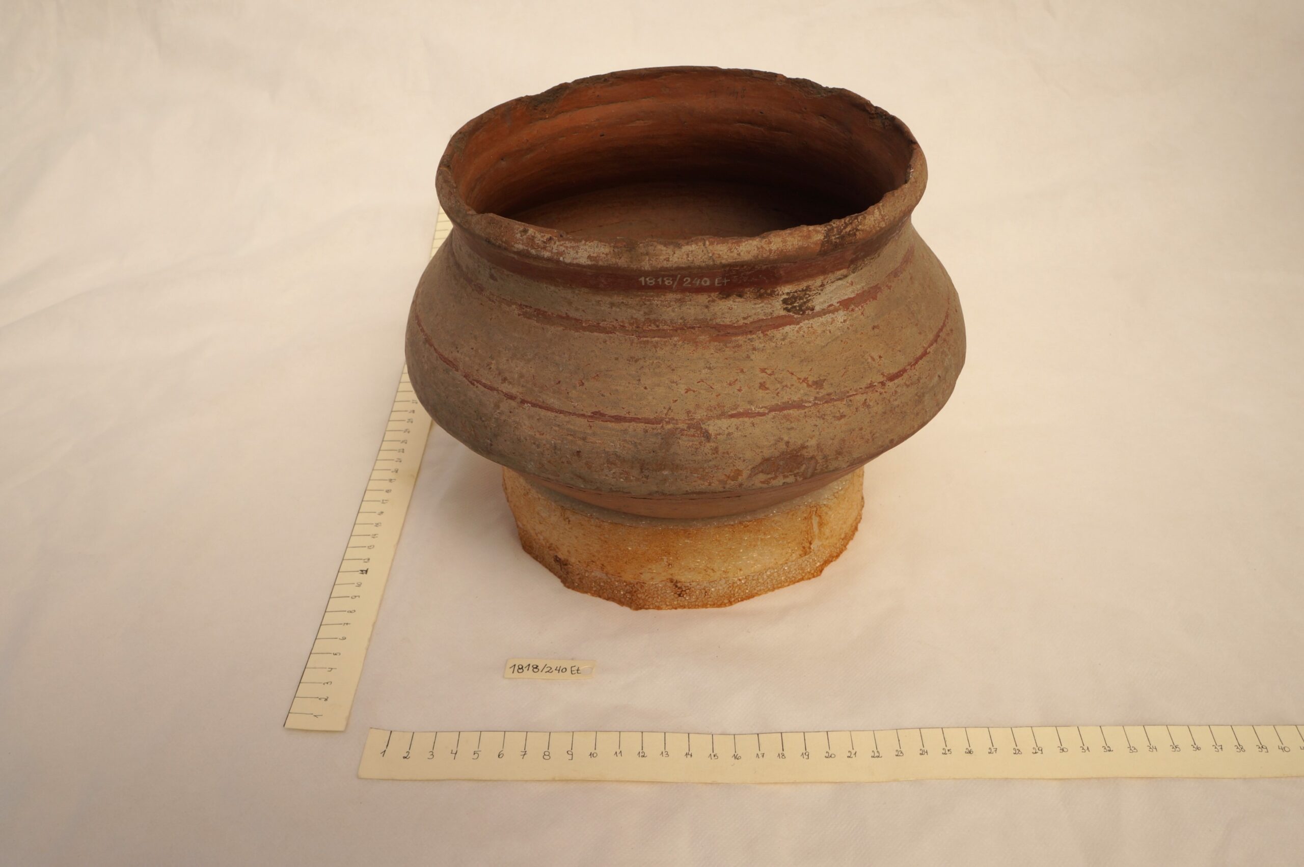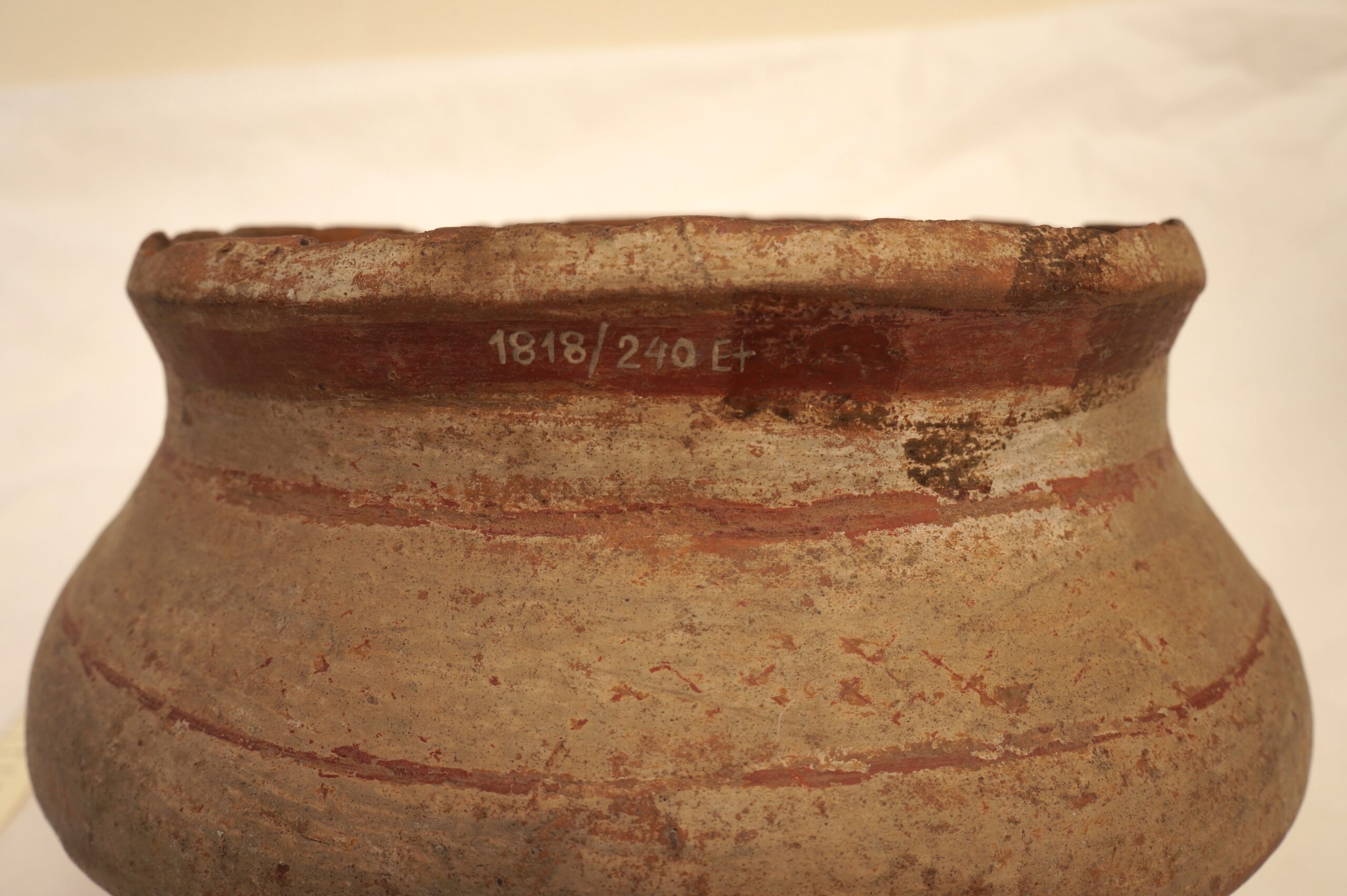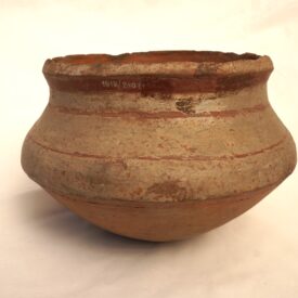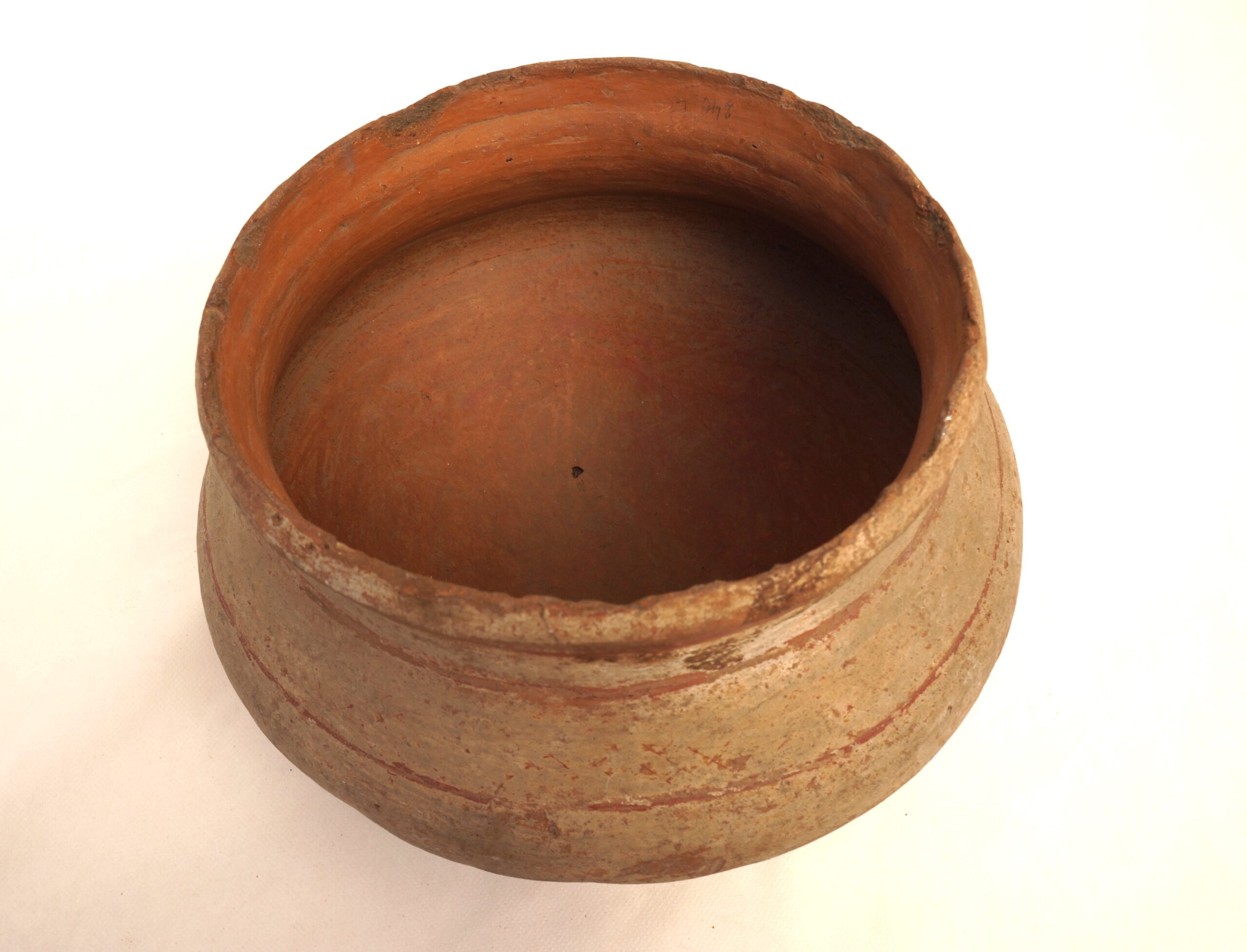 Base em forma de cone invertido. Parte superior formada por três zonas, separadas apenas por traços de tinta vermelha. Borda encurvada para dentro. Base não decorada. Parte superior recoberta por camada de caolim branco-amarelado, sobre a qual se veem quatro anéis vermelhos, dois mais largos, um junto a borda, logo abaixo do "aro bucal" e o outro circundando a parte superior da base. Modelado pelo método de "cordas" em espiral, depois alisado interna e externamente. Pasta fina e homogênea. Forma simétrica. Pintura geométrica vermelha sobre fundo branco.
